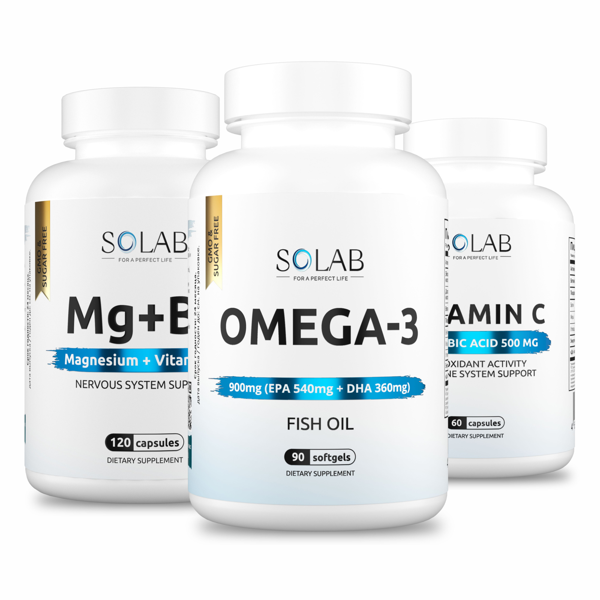 SOLAB / Набор витаминов. Omega-3 90 капсул + Магний+В6 120 капсул + подарок Витамин С 60 капсул