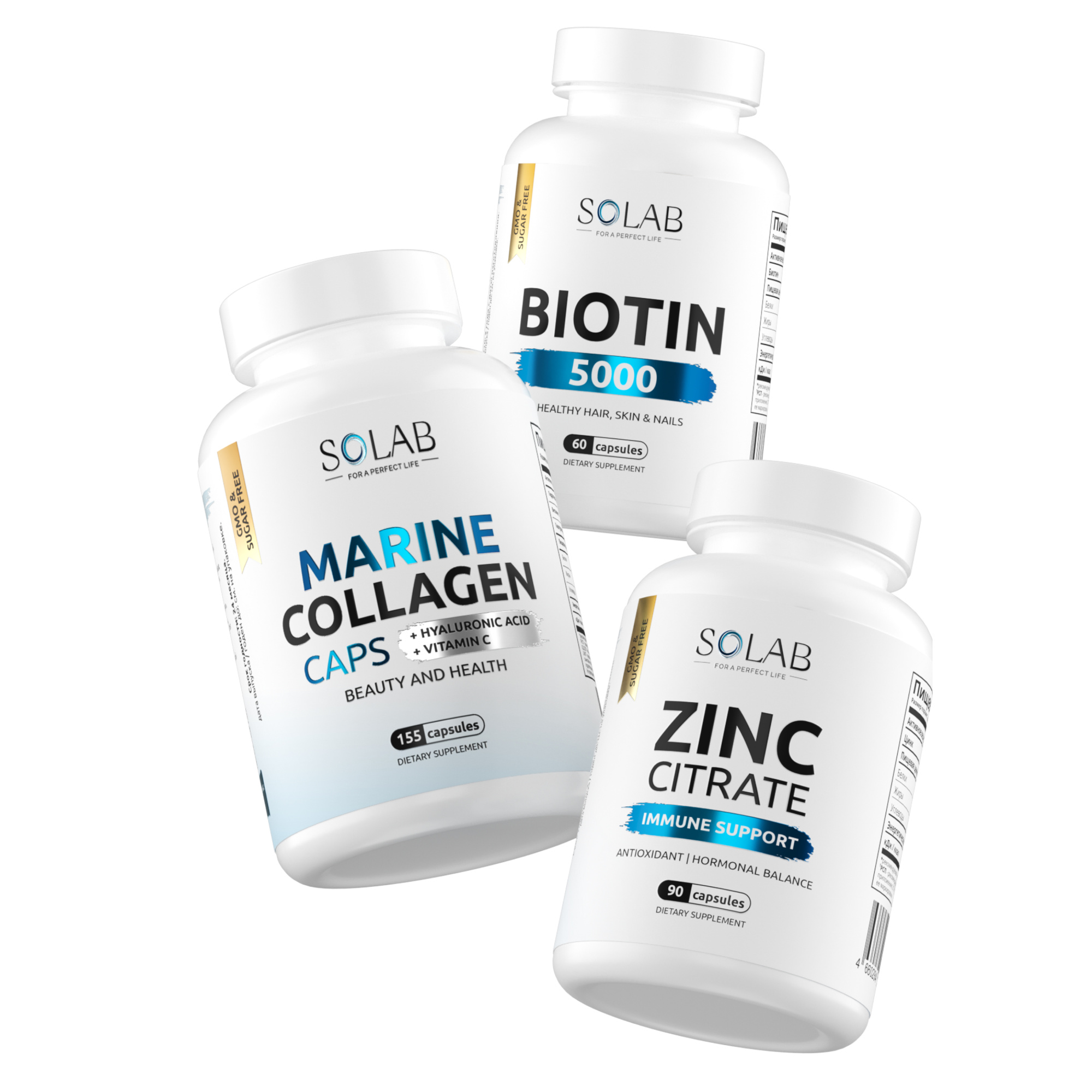 SOLAB / Набор витаминов. Коллаген морской с гиалуроновой кислотой и витамином С 155 капсул + Биотин 60 капсул + Цинк 90 капсул