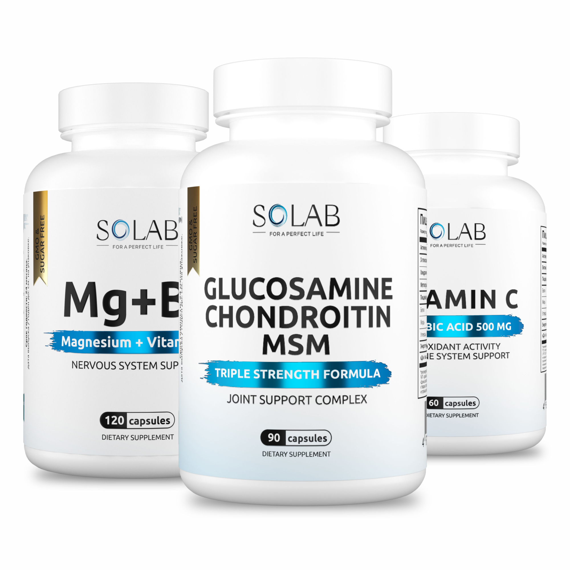 SOLAB / Набор витаминов:  Глюкозамин+Хондроитин+МСМ 90 капсул,  Магний+В6 120 капсул,  витамин С 60 капсул