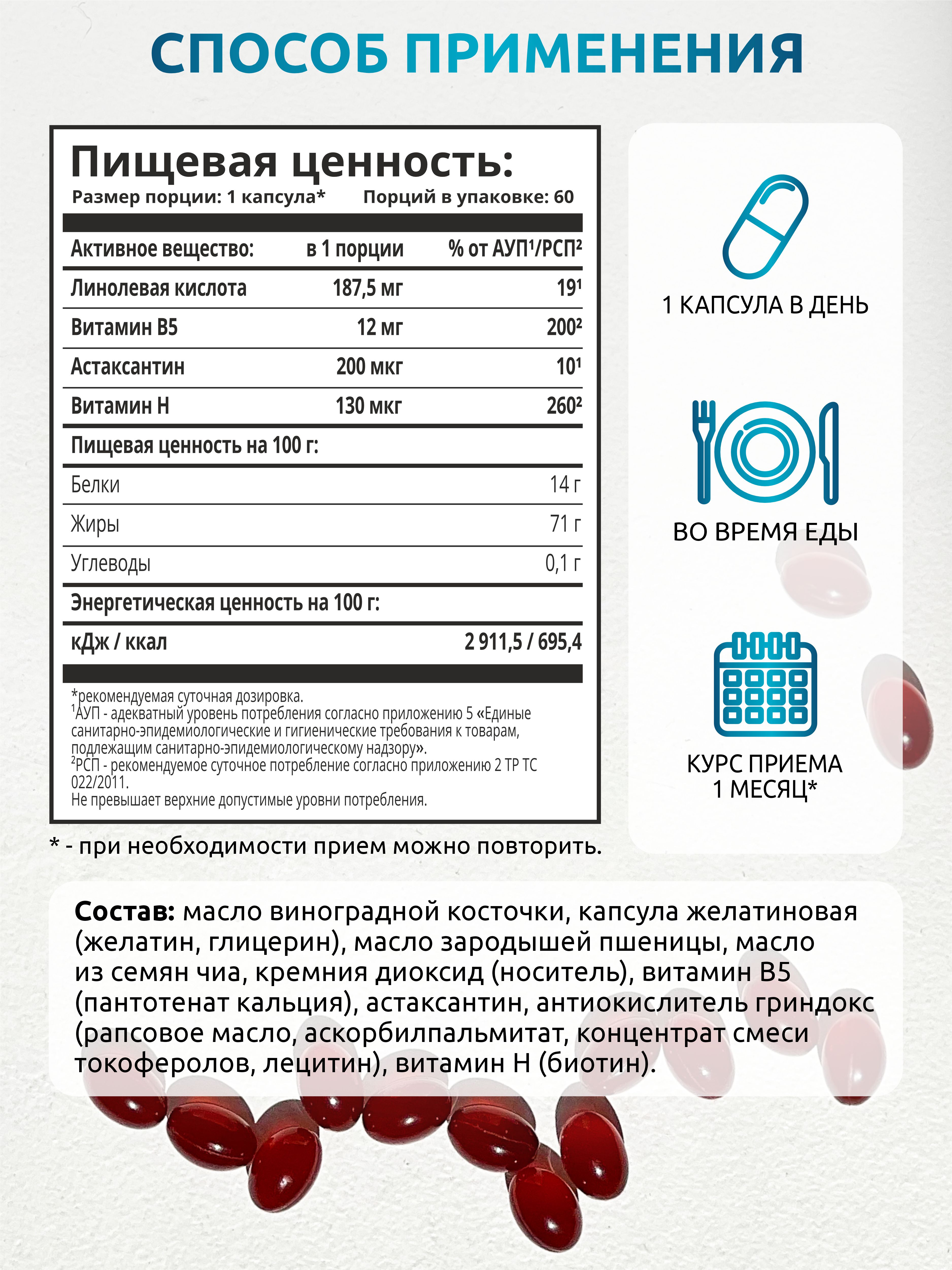 Принимать по 1 капсуле 1 раз в день во время еды. Продолжительность приема 1 месяц.
