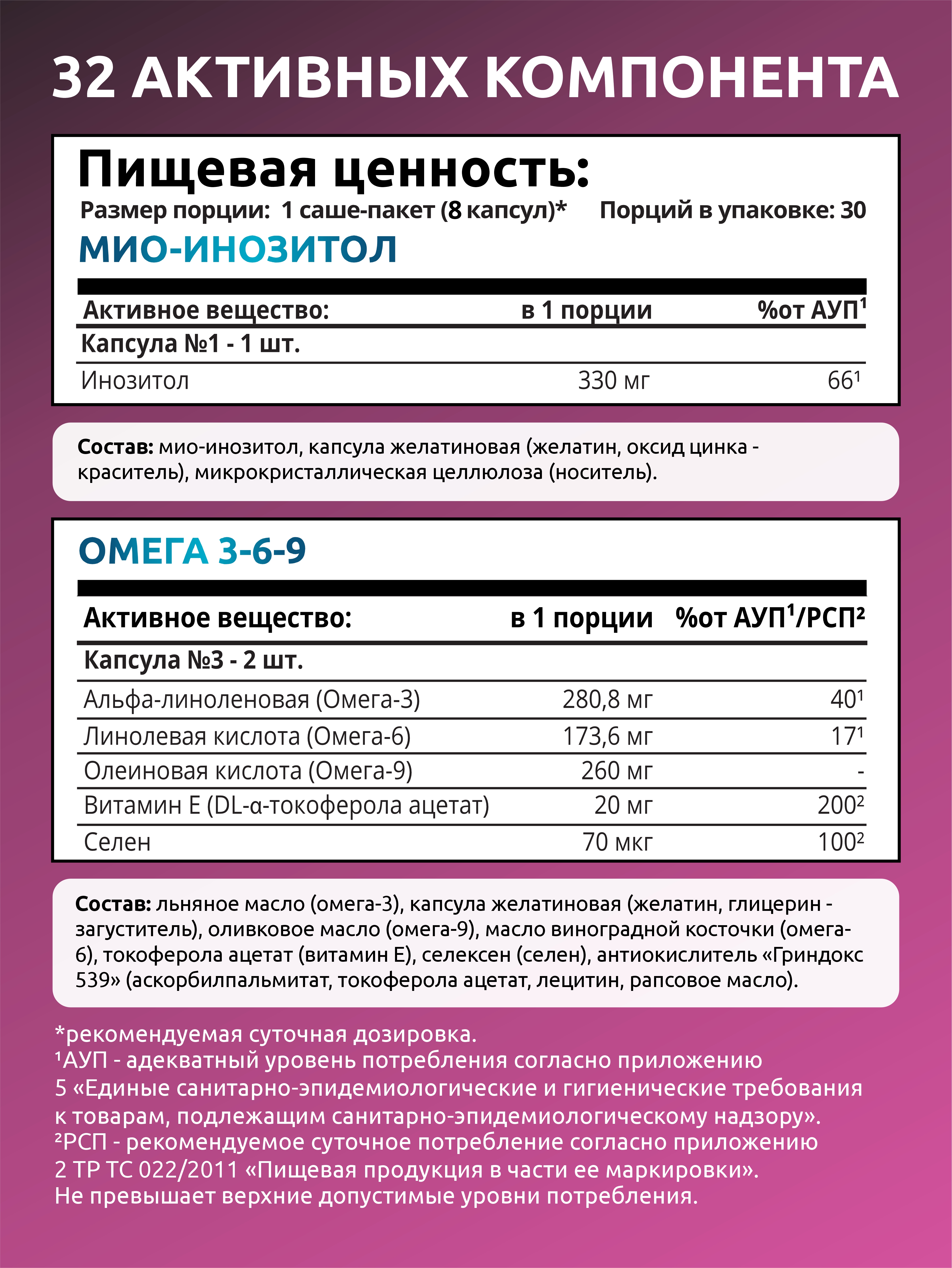 Мио-инозитол поддерживает гормональный баланс и помогает нормализовать менструальный цикл. Предотвращает набор лишнего веса в период менопаузы. Укрепляет нервную систему и борется с проявлением акне.