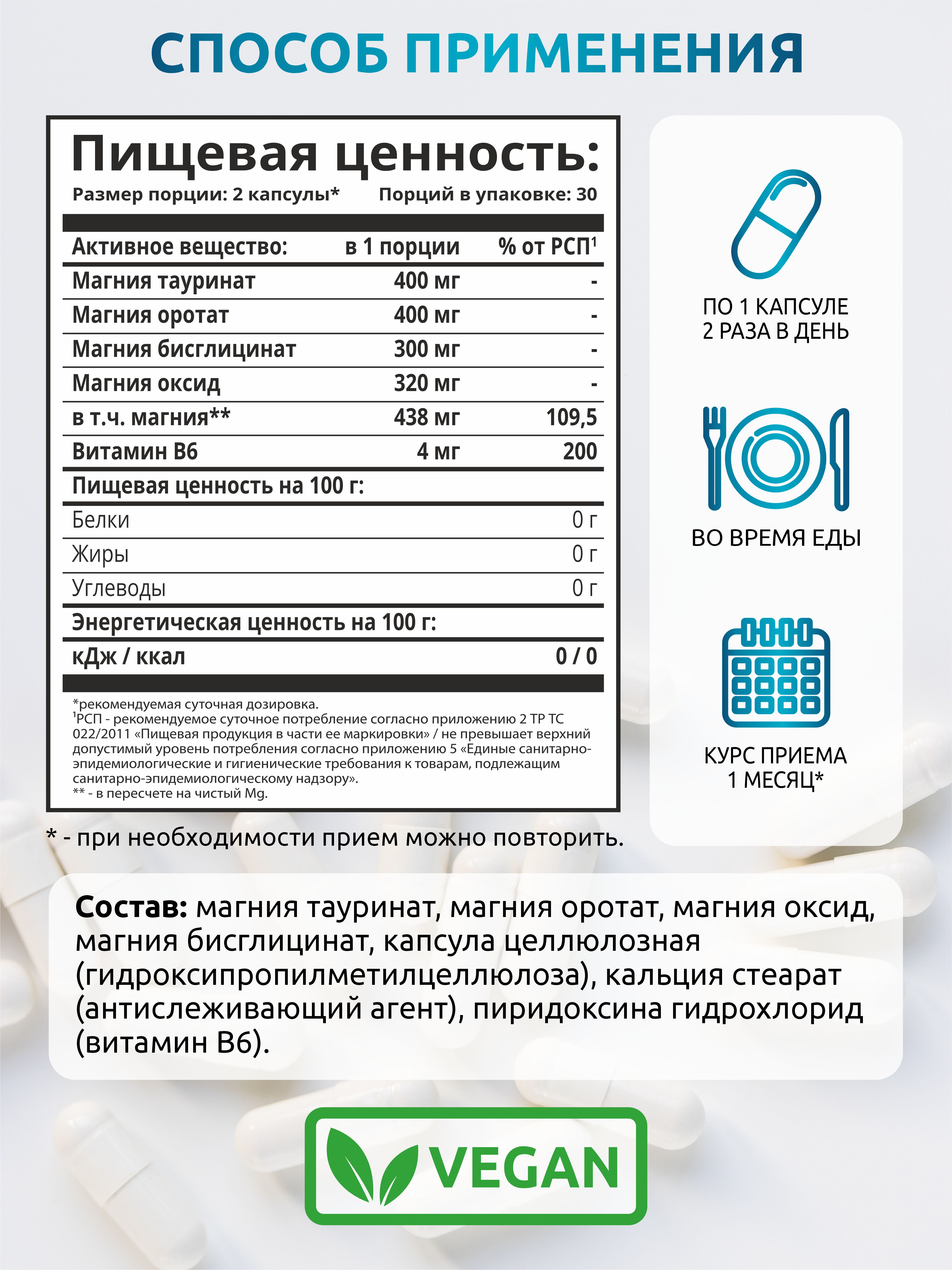 В одной порции (2 капсулы) содержится 438 мг чистого магния, в том числе: