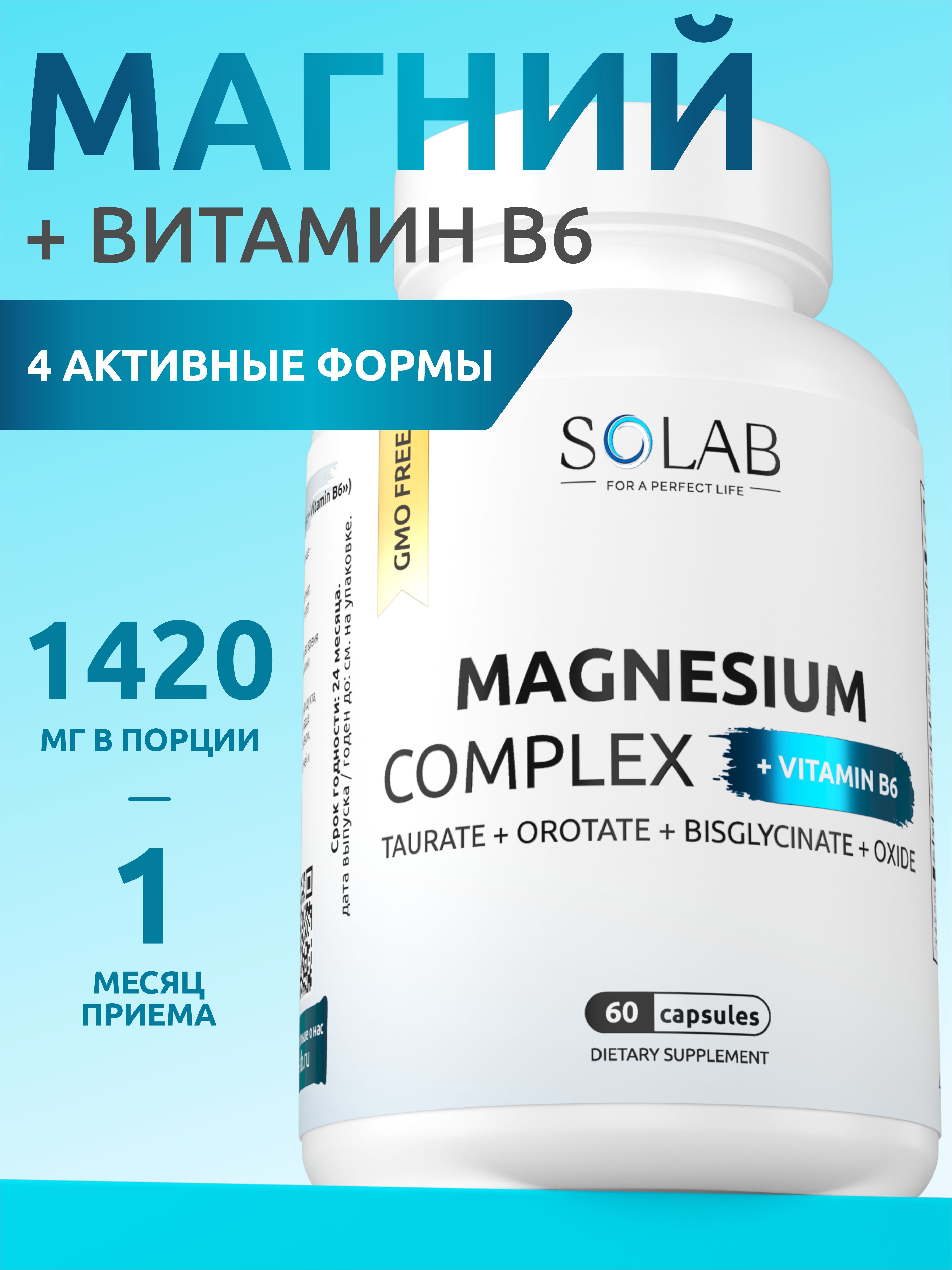 Комплекс Магния от SOLAB — это комбинация самых эффективных и усвояемых форм магния для нормальной работы мозга, нервной системы и пищеварения. Принимая 4 формы совместно вы быстрее почувствуете положительный эффект в разных областях здоровья.
