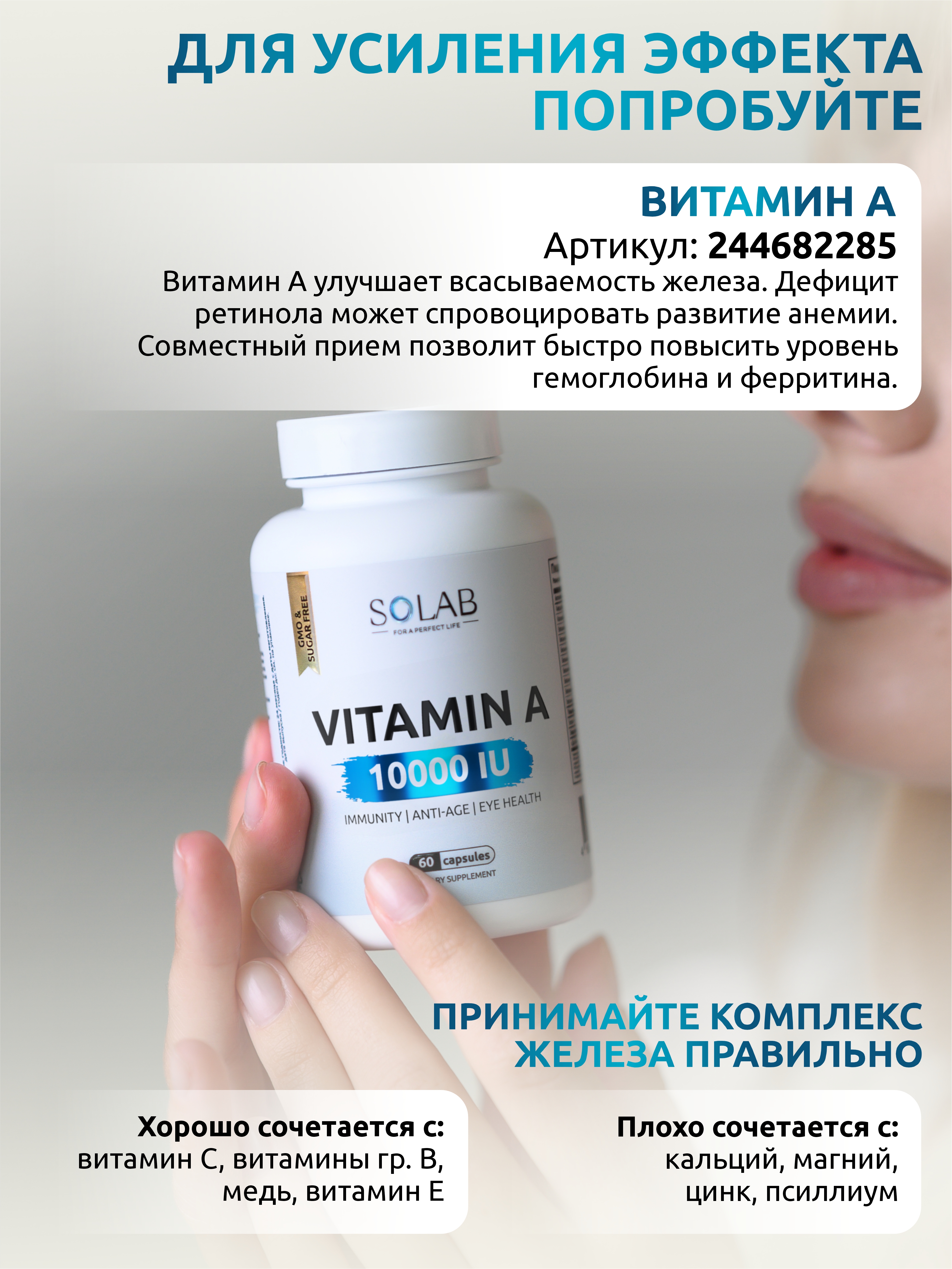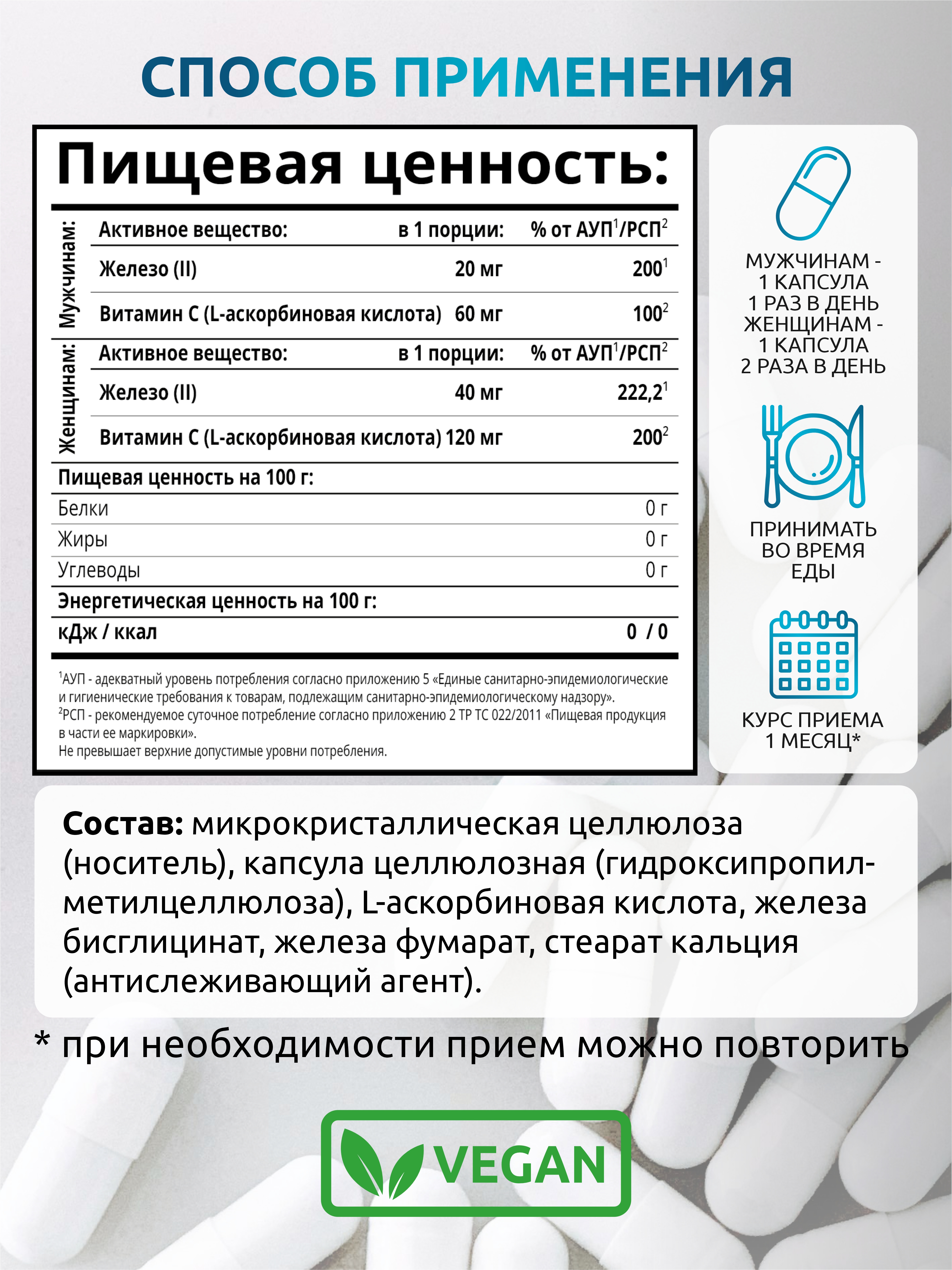 Мощный комплекс Железа от SOLAB совмещает в себе две самые биодоступные формы: Фумарат и Бисглицинат Железа. Такая комбинация позволяет поднять уровень гемоглобина и ферритина быстро и без побочных эффектов со стороны ЖКТ. В 1 порции для женщин (2 капсулы) содержится Железо хелат (II) 40 мг и Витамин С 120 мг; порция для мужчин (1 капсула) содержит двухвалентное железо 20 мг и Витамин С 60 мг.