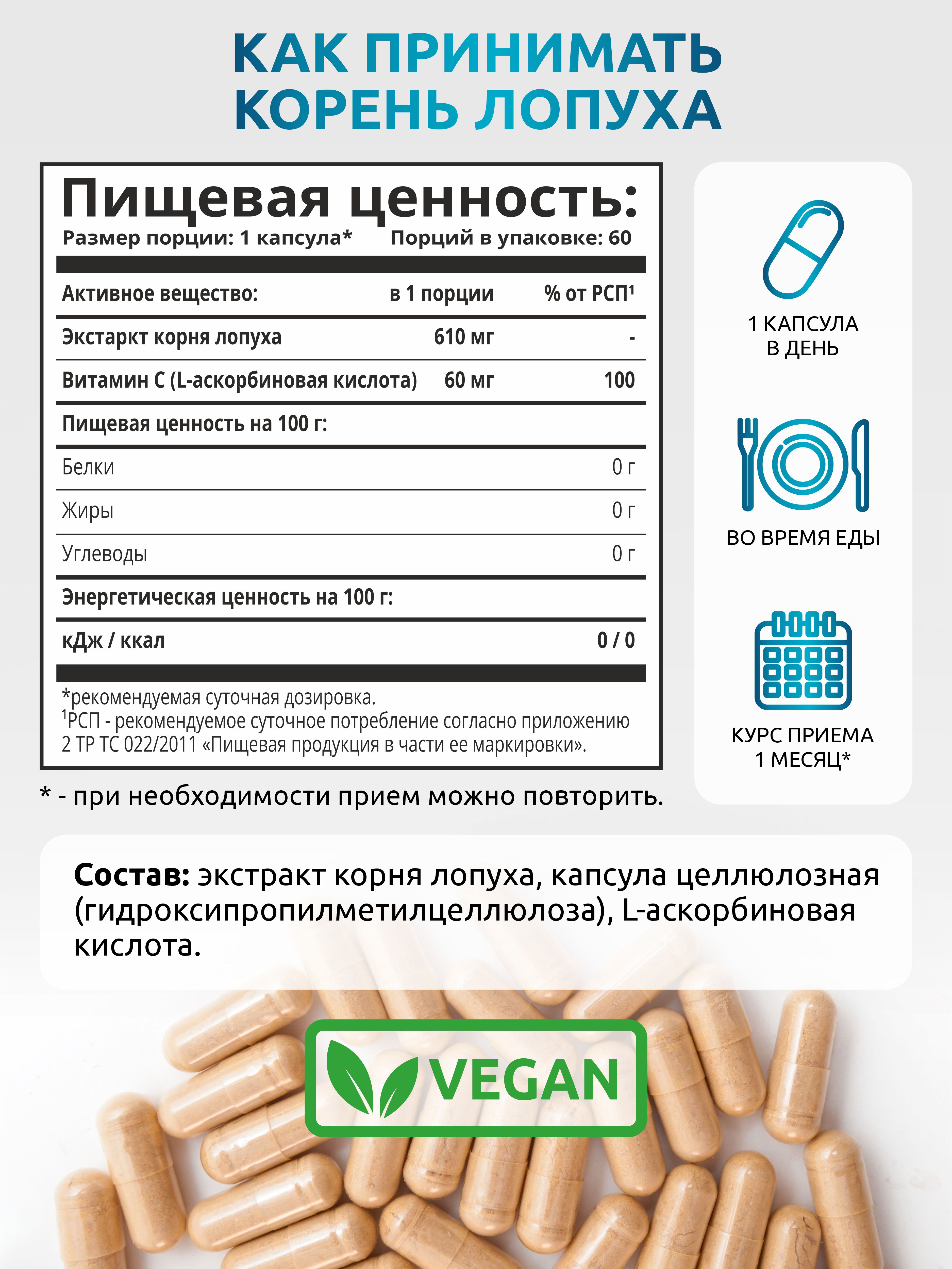 Корень Лопуха в капсулах от SOLAB — это натуральный растительный экстракт, который обеспечивает детоксикацию, восстанавливает процесс пищеварения и нормальную работу печени. В одной порции (1 капсула) содержится экстракт корня лопуха 610 мг и витамин С 60 мг.
