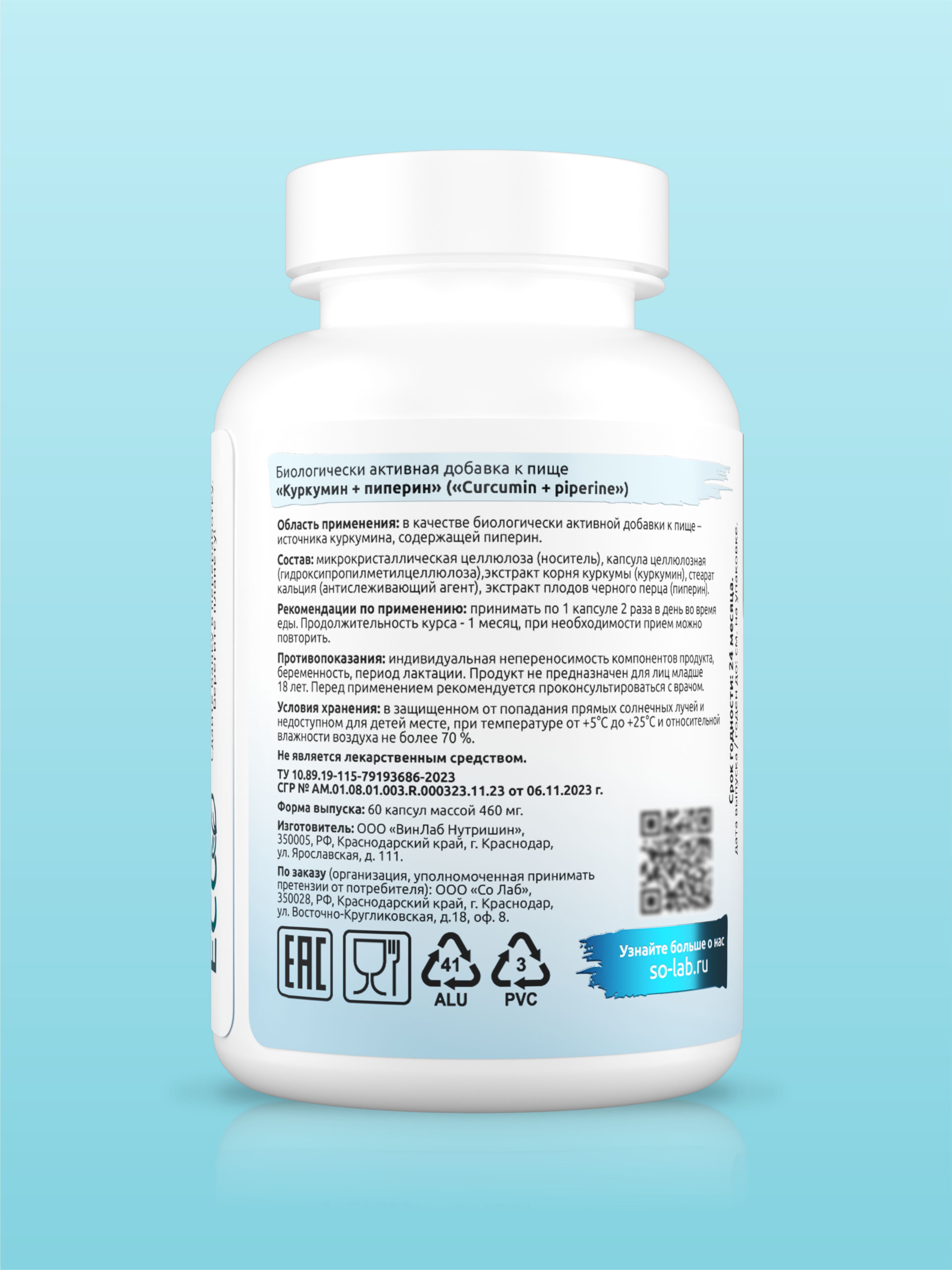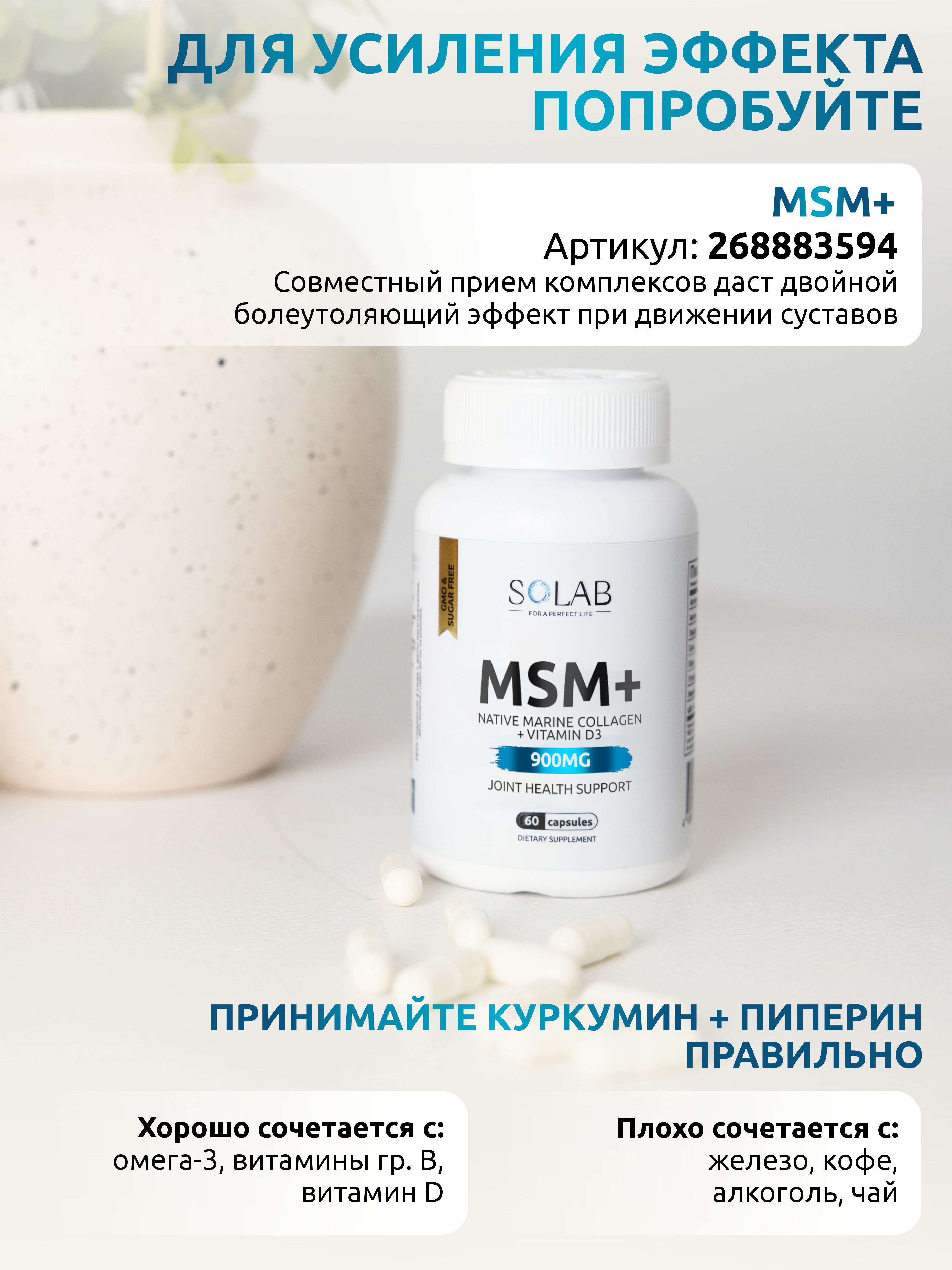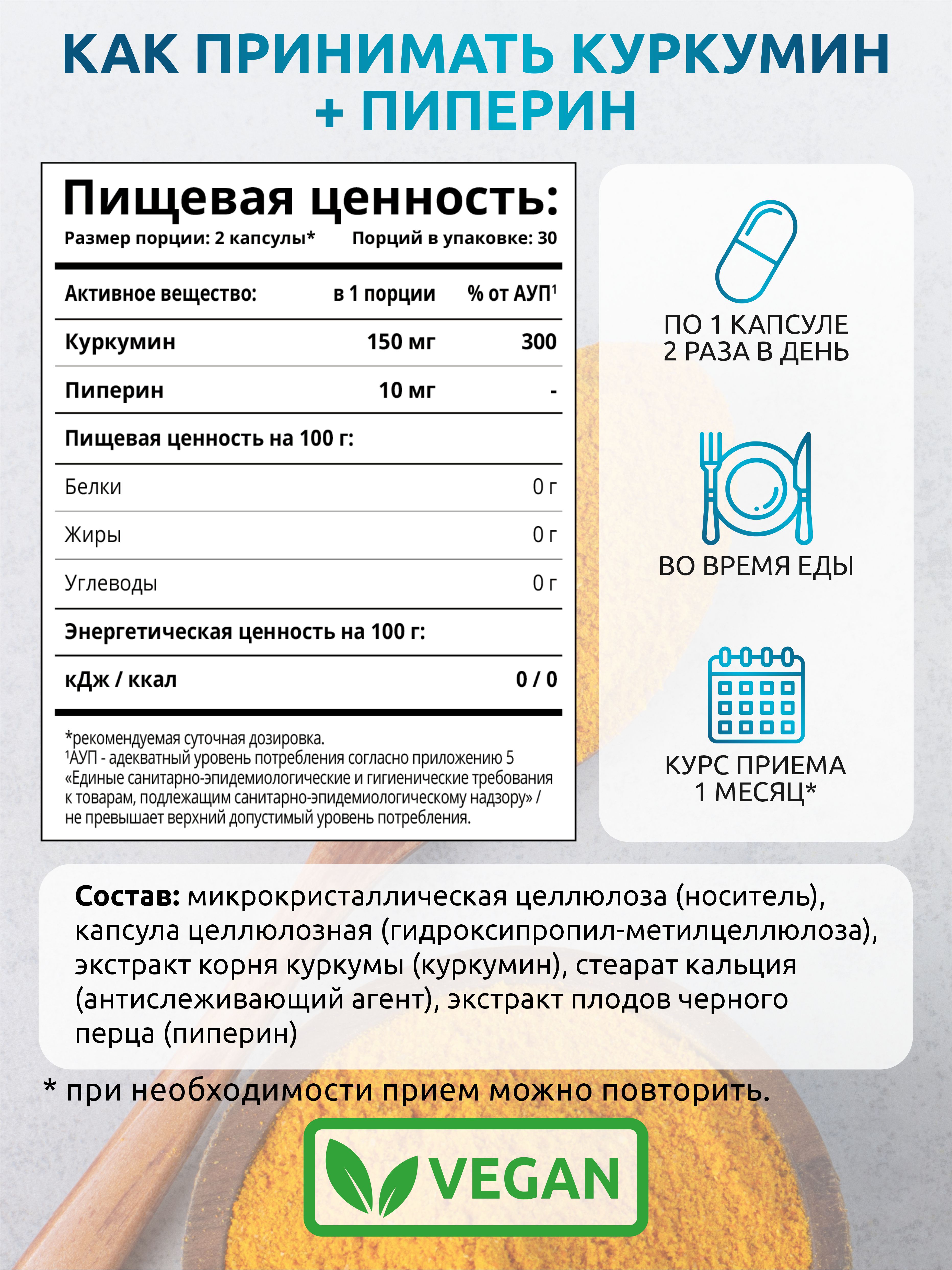 Куркумин + Пиперин от SOLAB — это натуральный растительный комплекс, который поддерживает здоровье связок и суставов, укрепляет иммунитет и нормализует работу пищеварительной системы. Одна порция (2 капсулы) содержит куркумин 150 мг и пиперин 10 мг.