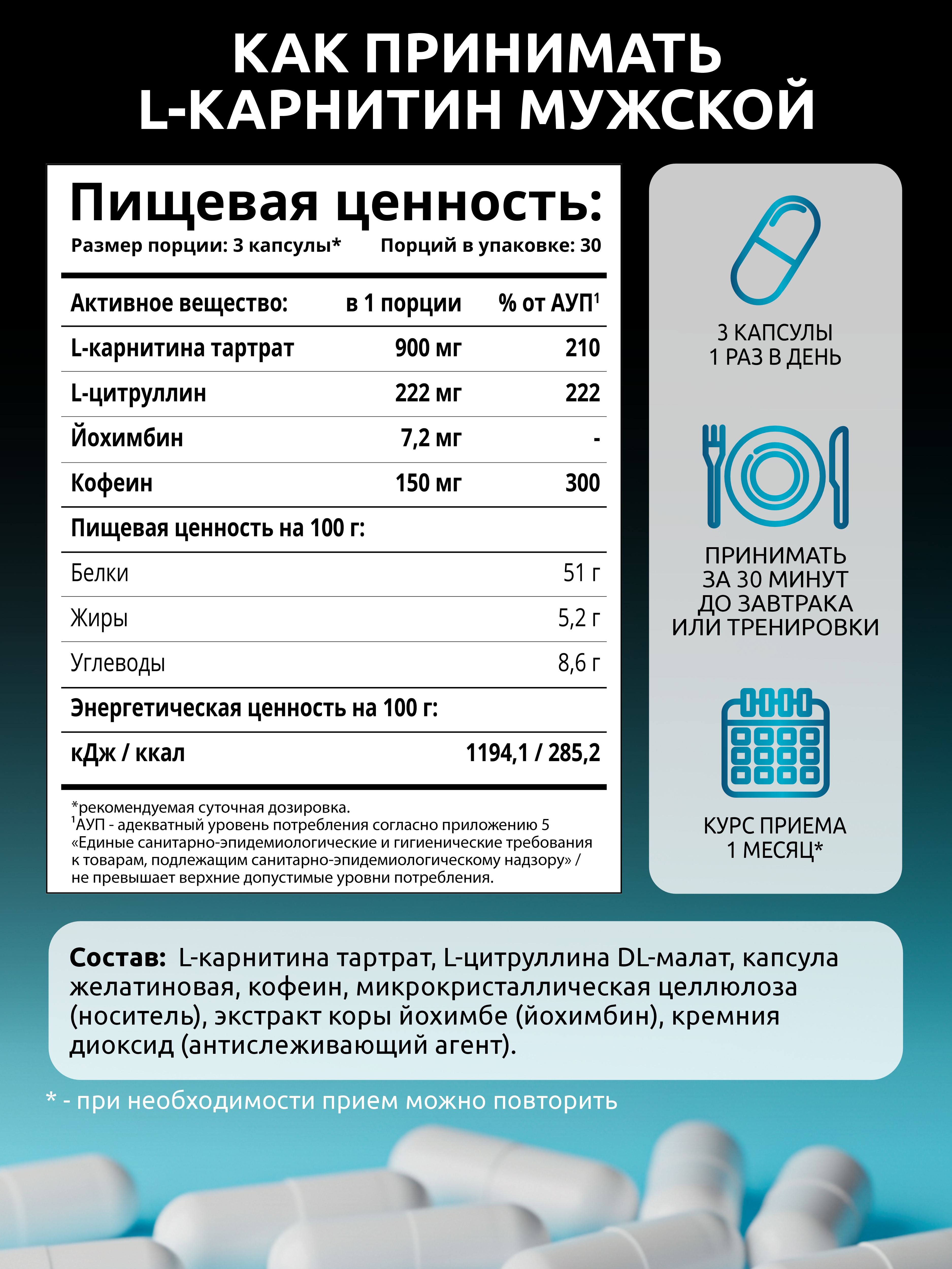 Добавка содержит натуральные природные компоненты, которые полностью безвредны. L-карнитин тартрат является наиболее биодоступной формой вещества, благодаря чему быстро “включается” в работу. Произведено со строгим соблюдением международных стандартов качества GMP, ISO. Продукт сертифицирован.