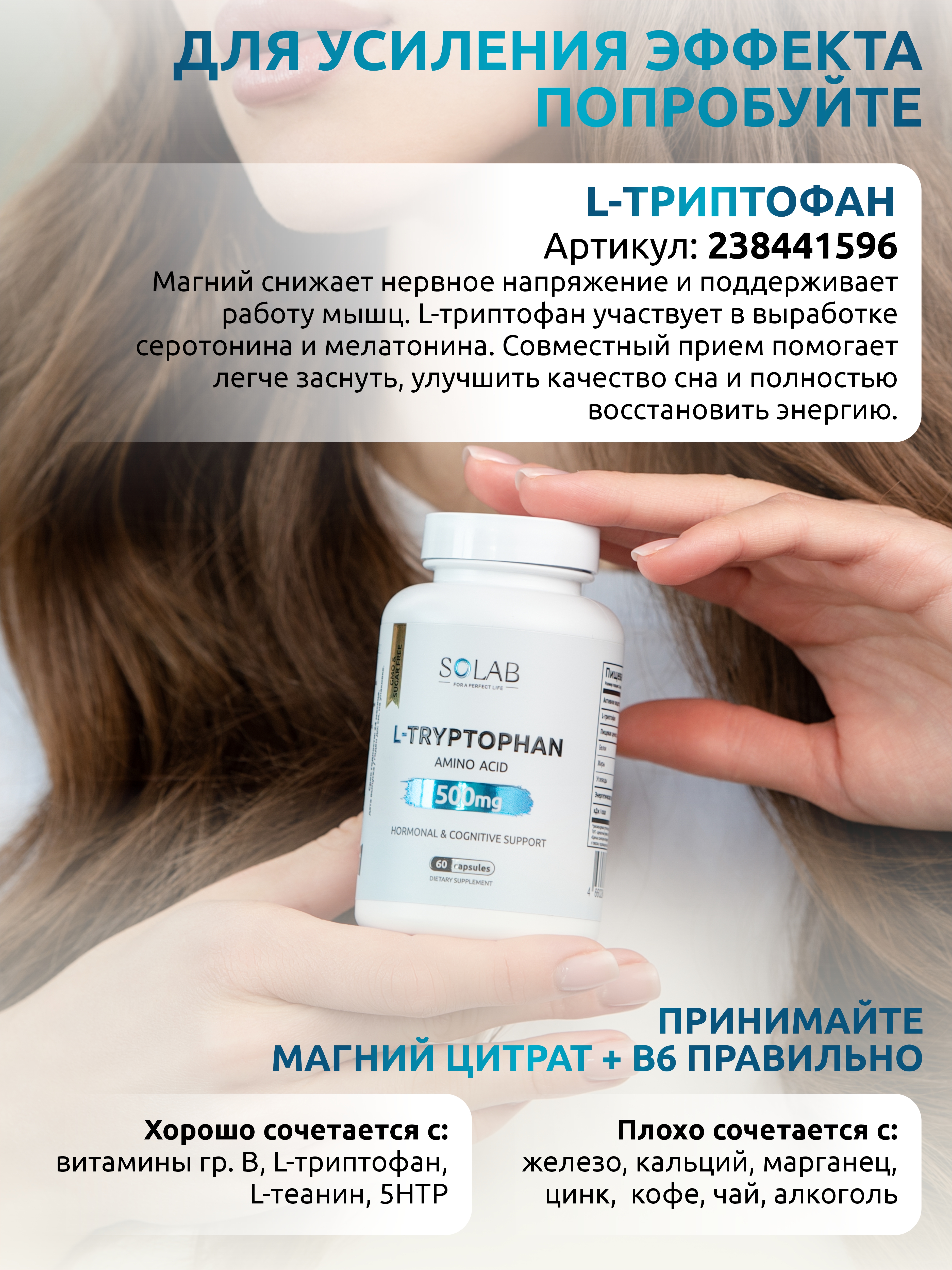 Магний Цитрат + Витамин В6 в таблетках от SOLAB — комплекс - антистресс для хорошего сна, укрепления нервной системы и комплексного избавления от стресса. Магний в таблетках действует как мягкое успокоительное и снотворное средство накопительного и длительного действия. В 1 порции (3 таблетки) содержится 400 мг чистого магния и 6 мг витамина В6.