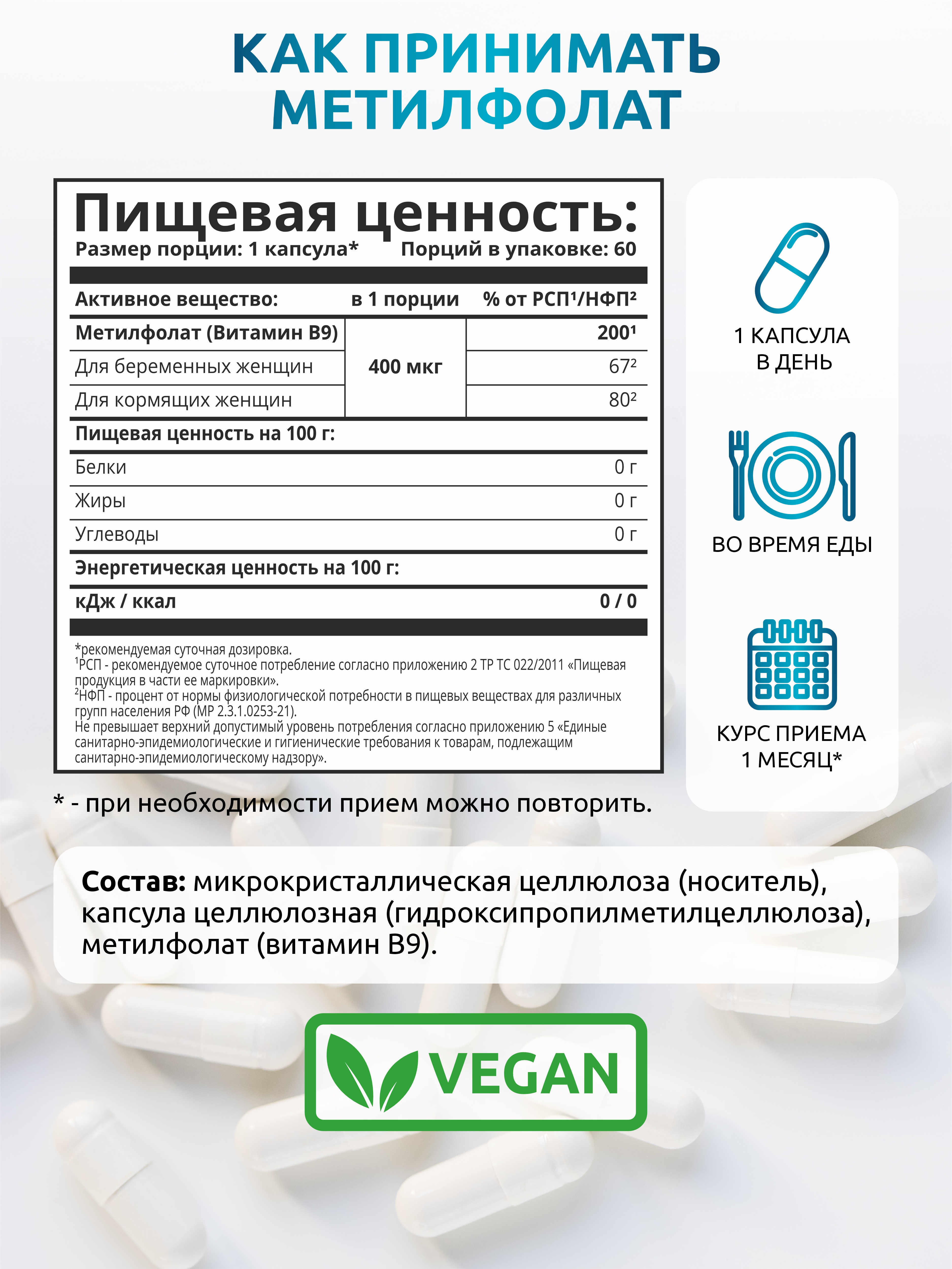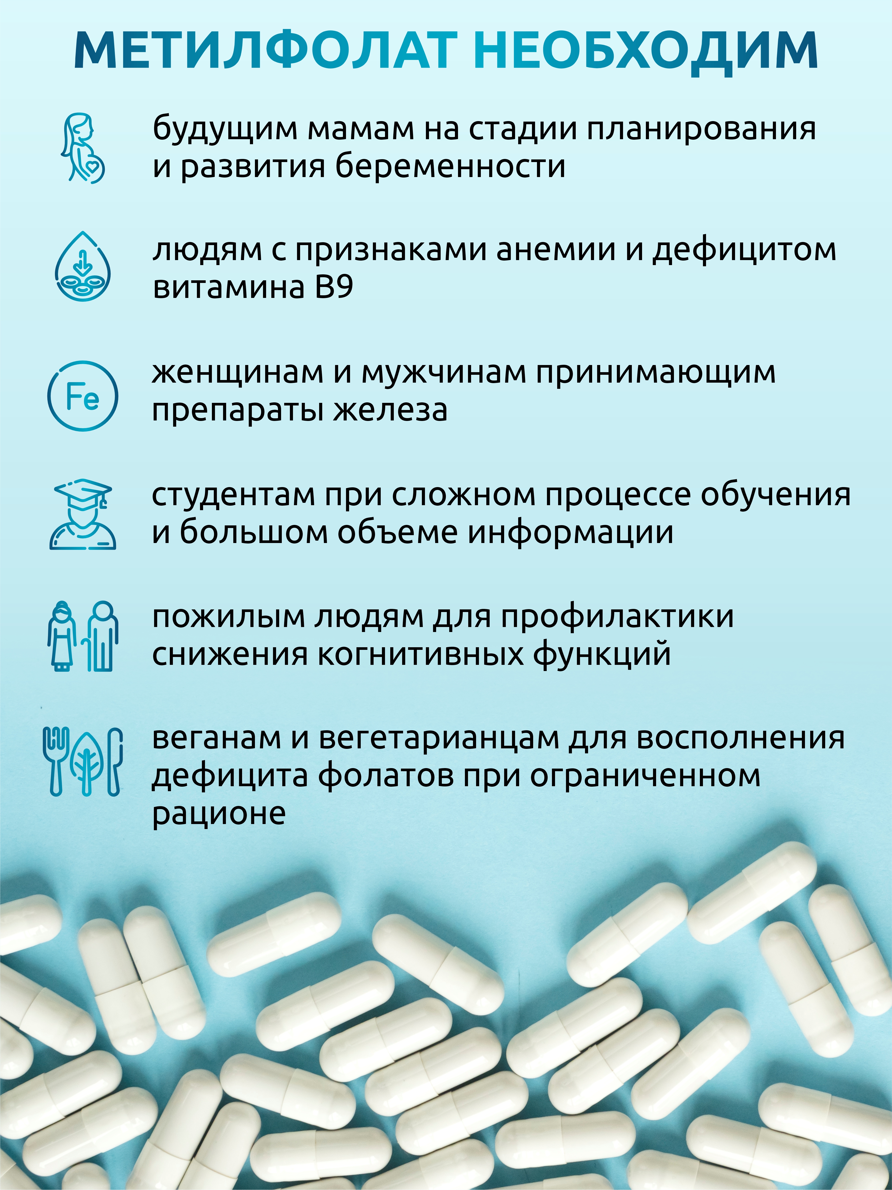 Фолиевая кислота (метилфолат) — это биодоступная форма витамина В9, которая играет ключевую роль в процессах кроветворения, поддержания нервной системы и гормонального баланса.