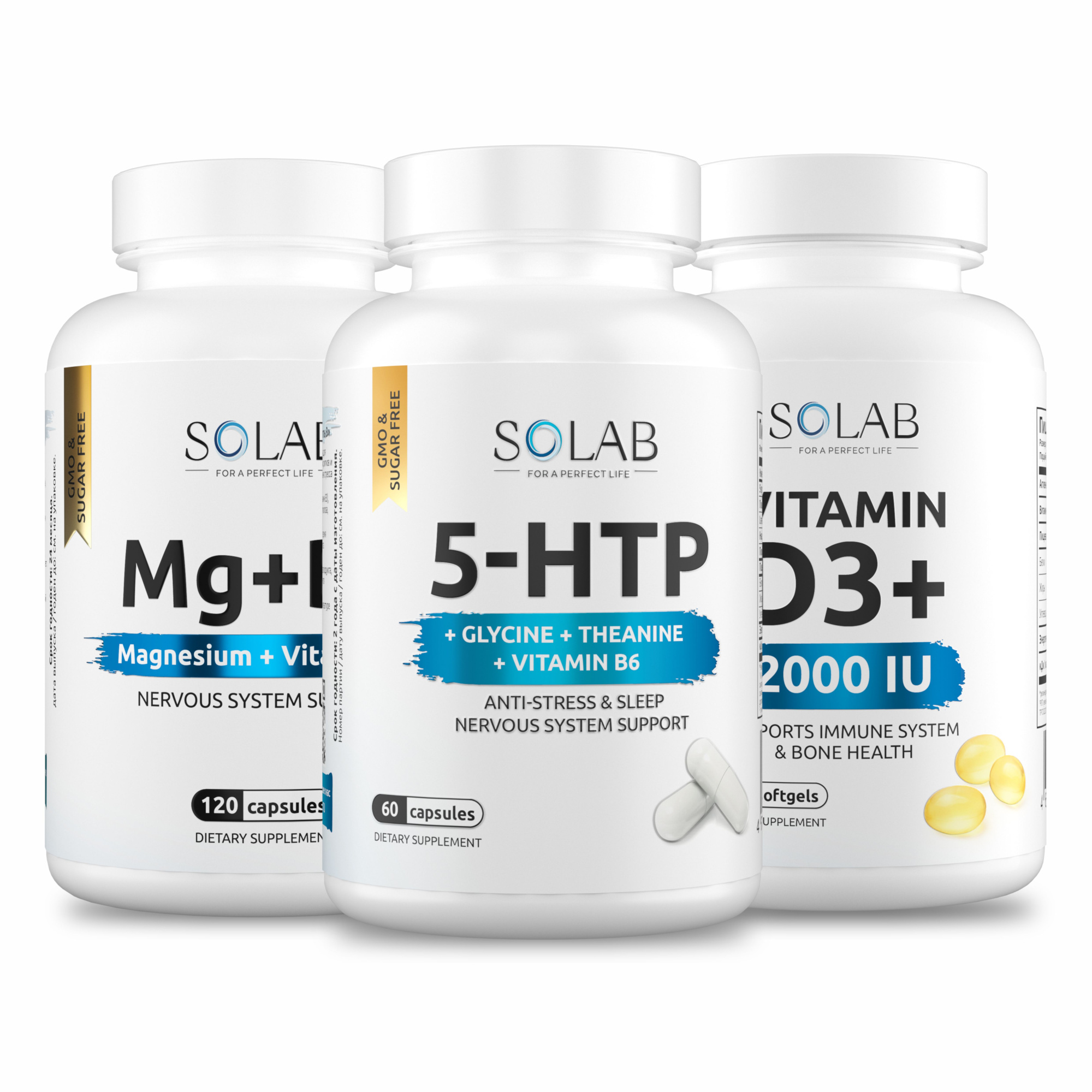 SOLAB / Набор витаминов. 5-НТР с глицином 60 капсул + Магний+В6 120 капсул + витамин Д3 2000МЕ 120 капсул