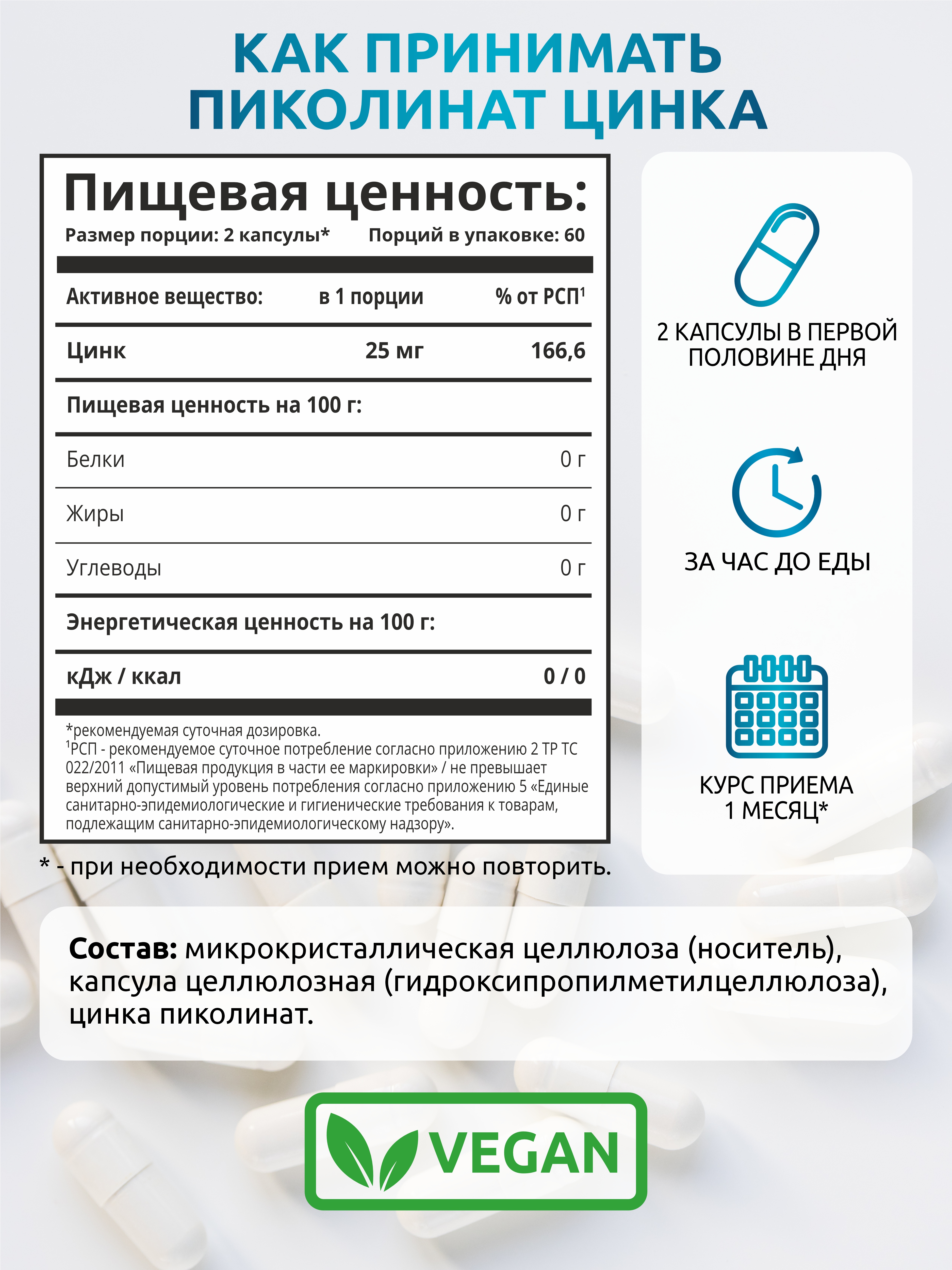 Пиколинат Цинка от SOLAB — это самая эффективная и усвояемая форма цинка. Мощный антиоксидант, который укрепляет иммунитет, улучшает обмен веществ. В одной порции (2 капсулы) содержится 25 мг zinc picolinate (цинк пиколинат).