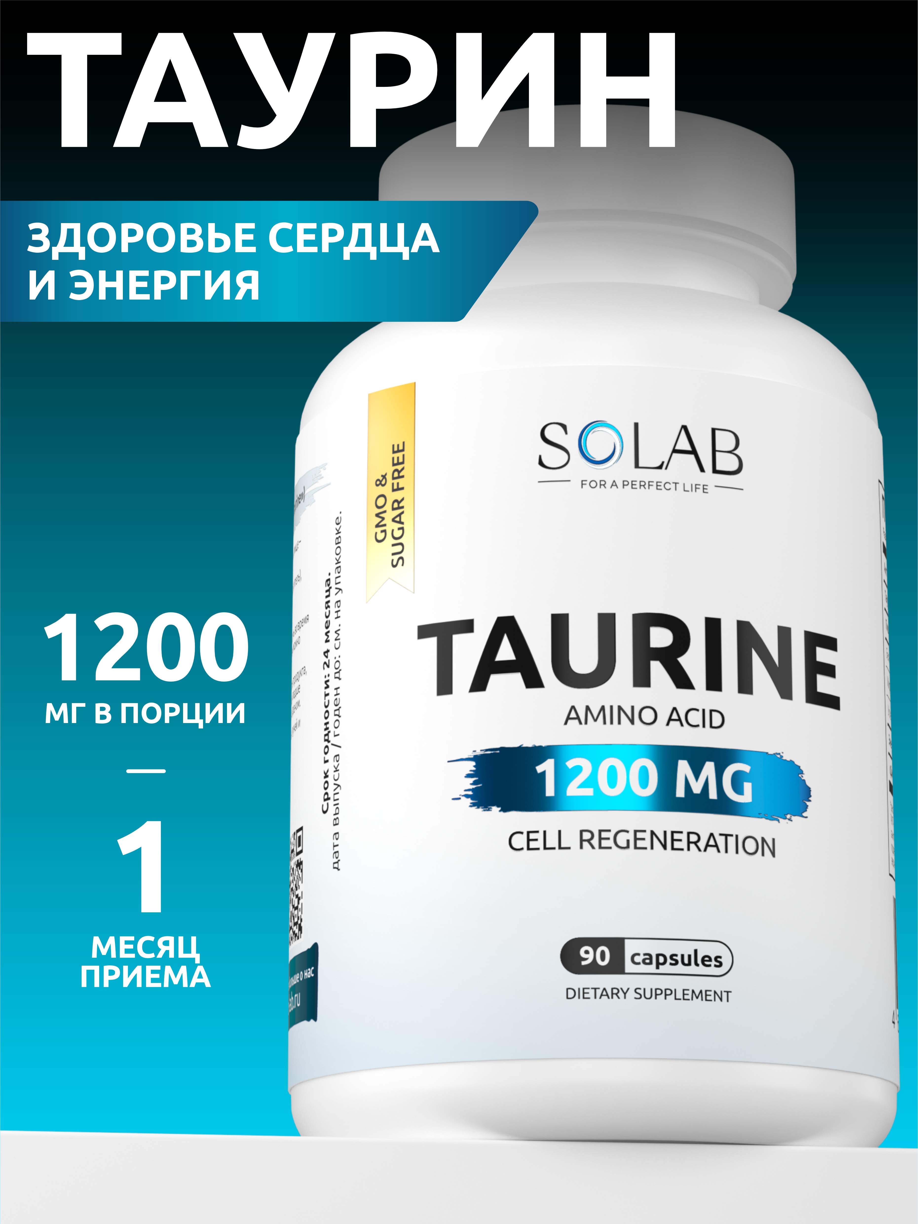 Комплексная пищевая добавка таурин от Solab для здоровья сердца и сосудов, снижения риска диабета, поддержания функций печени и острого зрения. В 1 порции (3 капсулы) содержится высокая дозировка таурина - 1200 мг.