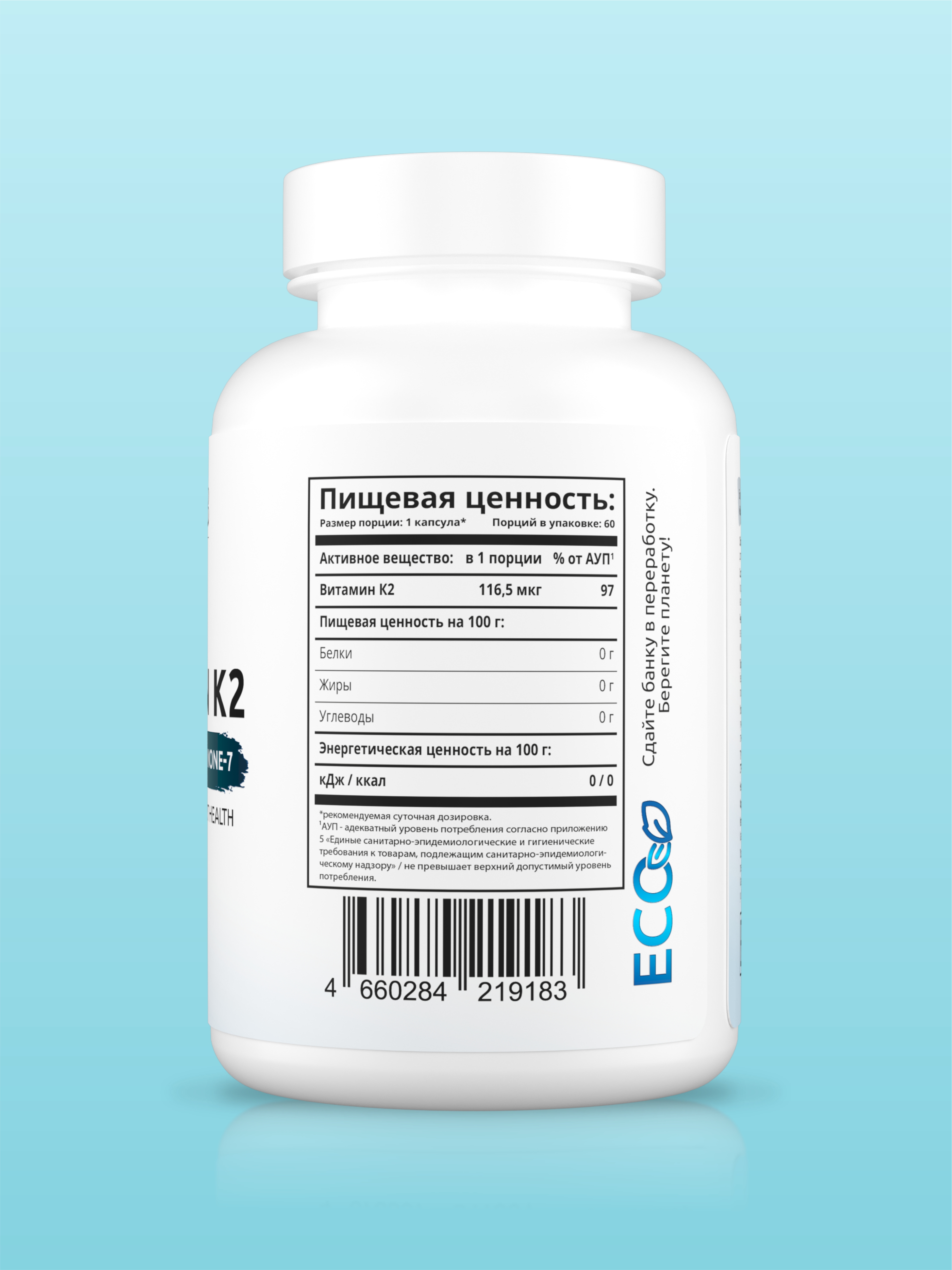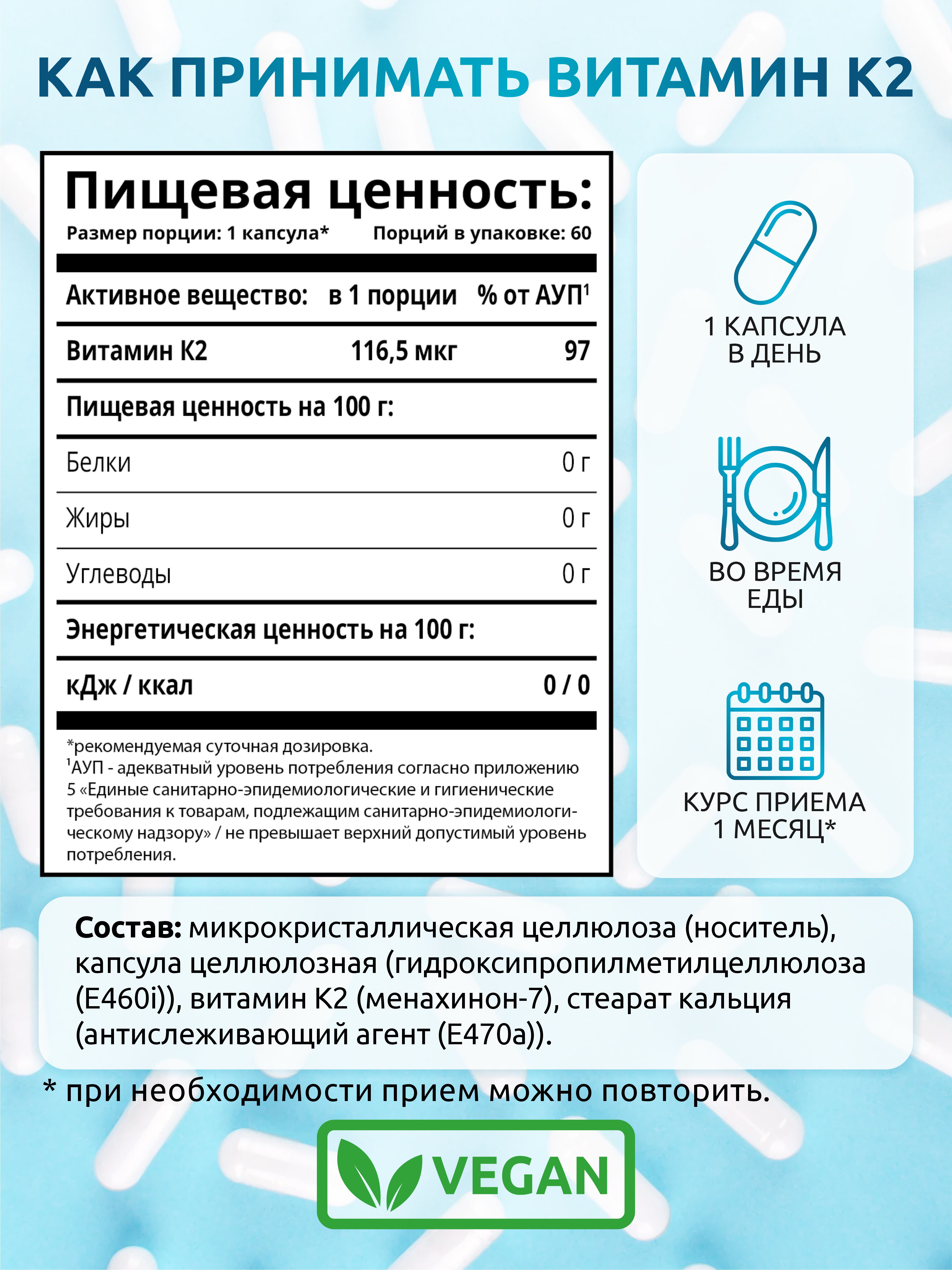 В 1 порции (1 капсула) капсуле содержится 120 мкг витамина к2. Для максимального усвоения рекомендуется принимать совместно с витамином D3 (д3).