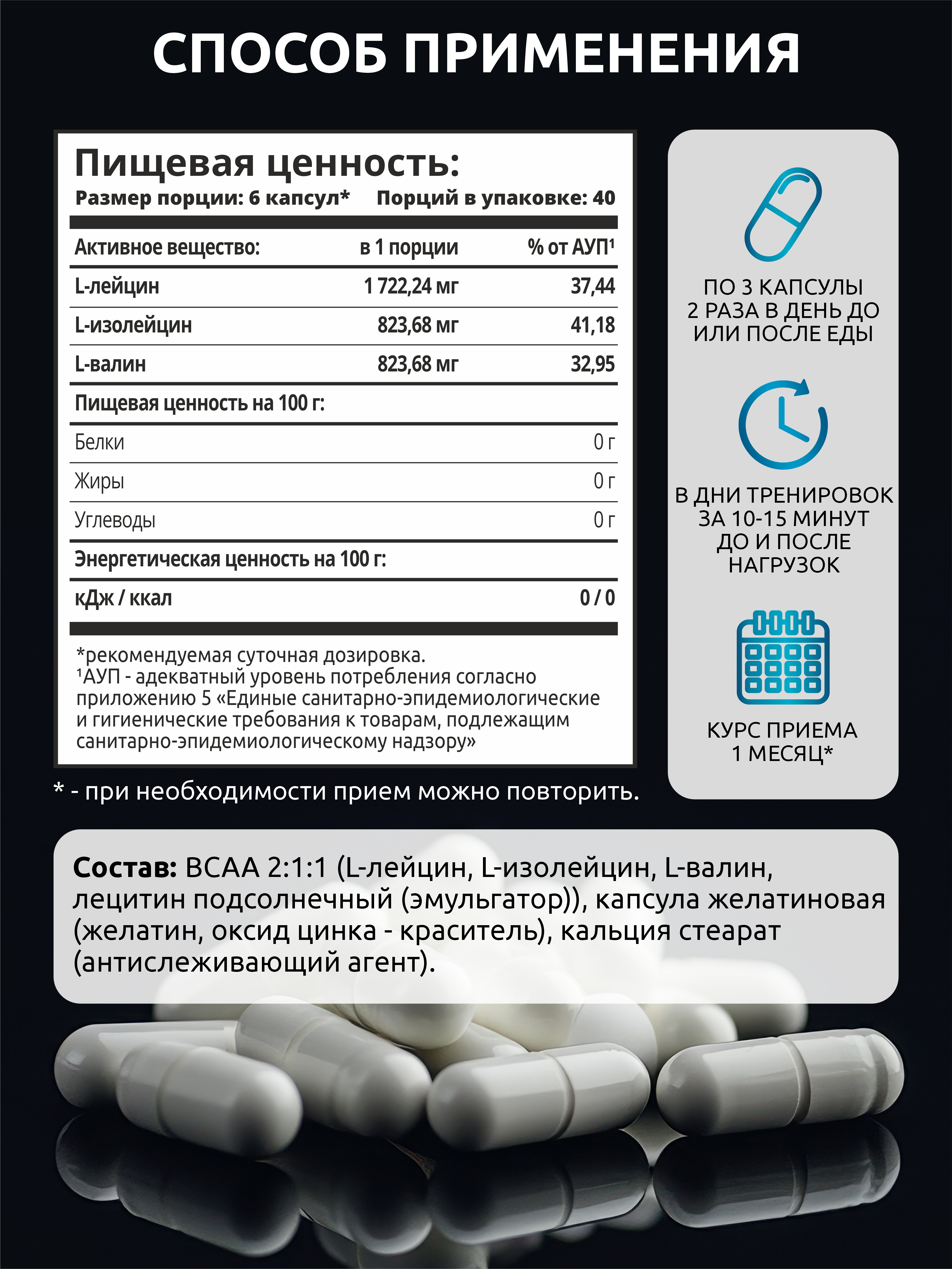 В одной упаковке (240 капсул) содержится 40 порций. Рекомендуется принимать в дни отдыха 3 капсулы 2 раза в день до или после еды. В дни тренировок 3 капсулы до тренировки за 10-15 минут и 3 капсулы после физических нагрузок. Продолжительность курса — 1 месяц, при необходимости прием можно повторить. Подходит для мужчин и женщин. Tags: bca, бца, бсаа, bcaa капсулы, бса, бца капсулы