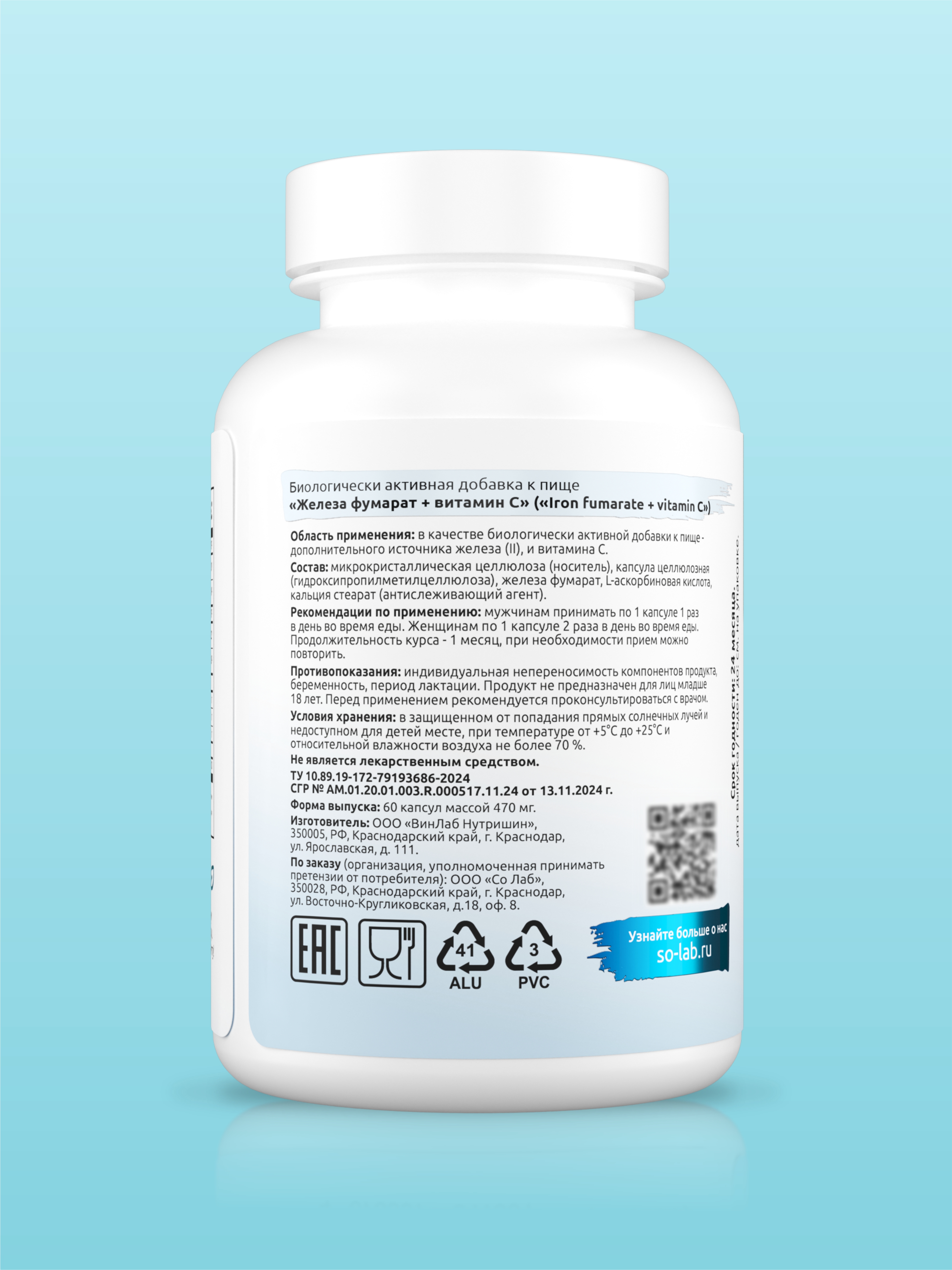 Железо Фумарат от SOLAB — соединение двухвалентного железа и фумаровой кислоты, которая повышает его усвояемость до 90-98%. Продукт необходим для здоровья женщин и мужчин. В одной порции для женщин (2 капсулы) содержится Железо (40 мг), Витамин С (120 мг). Порция для мужчин (1 капсула) содержит Железо (20 мг), Витамин С (60 мг).