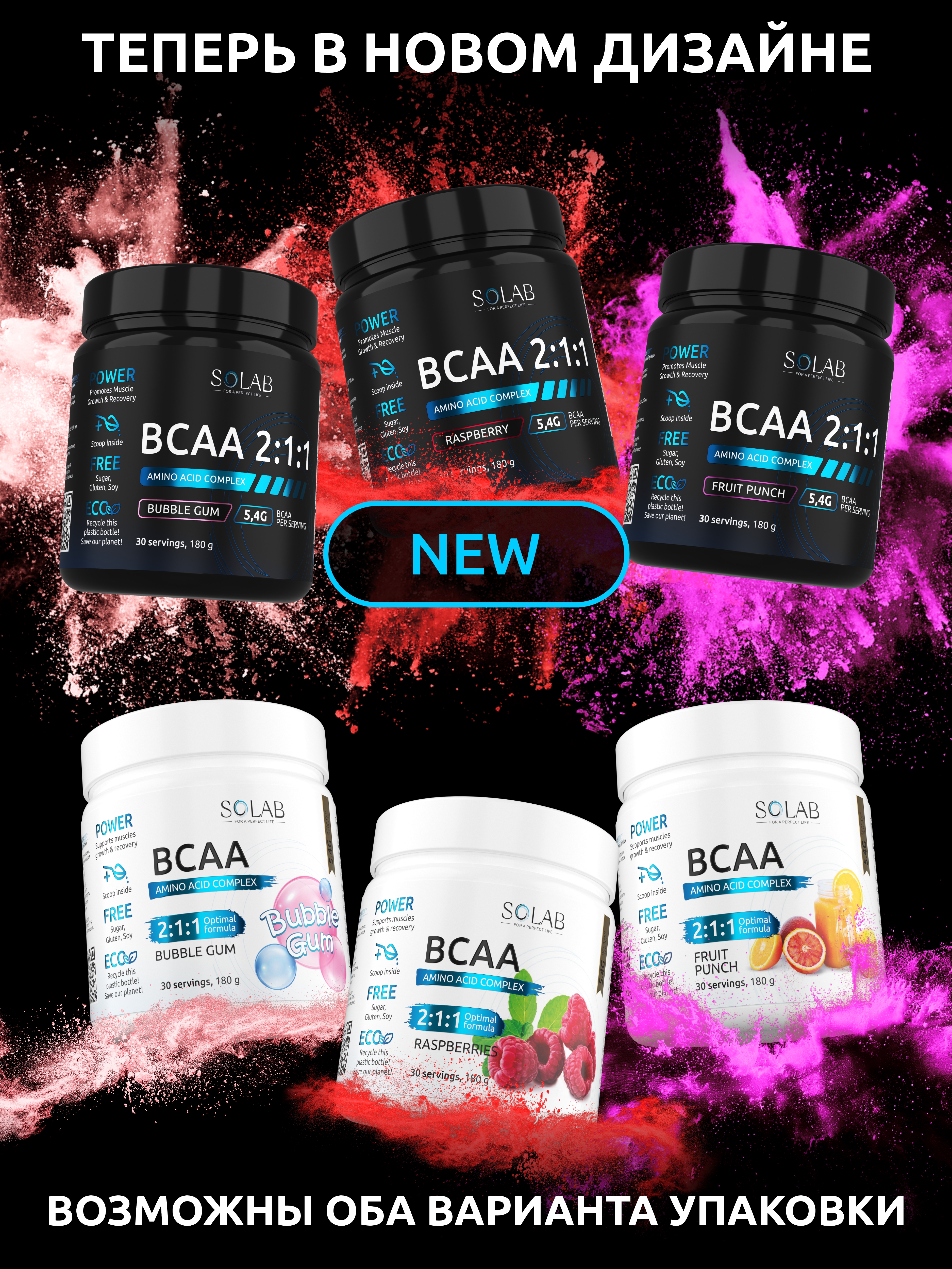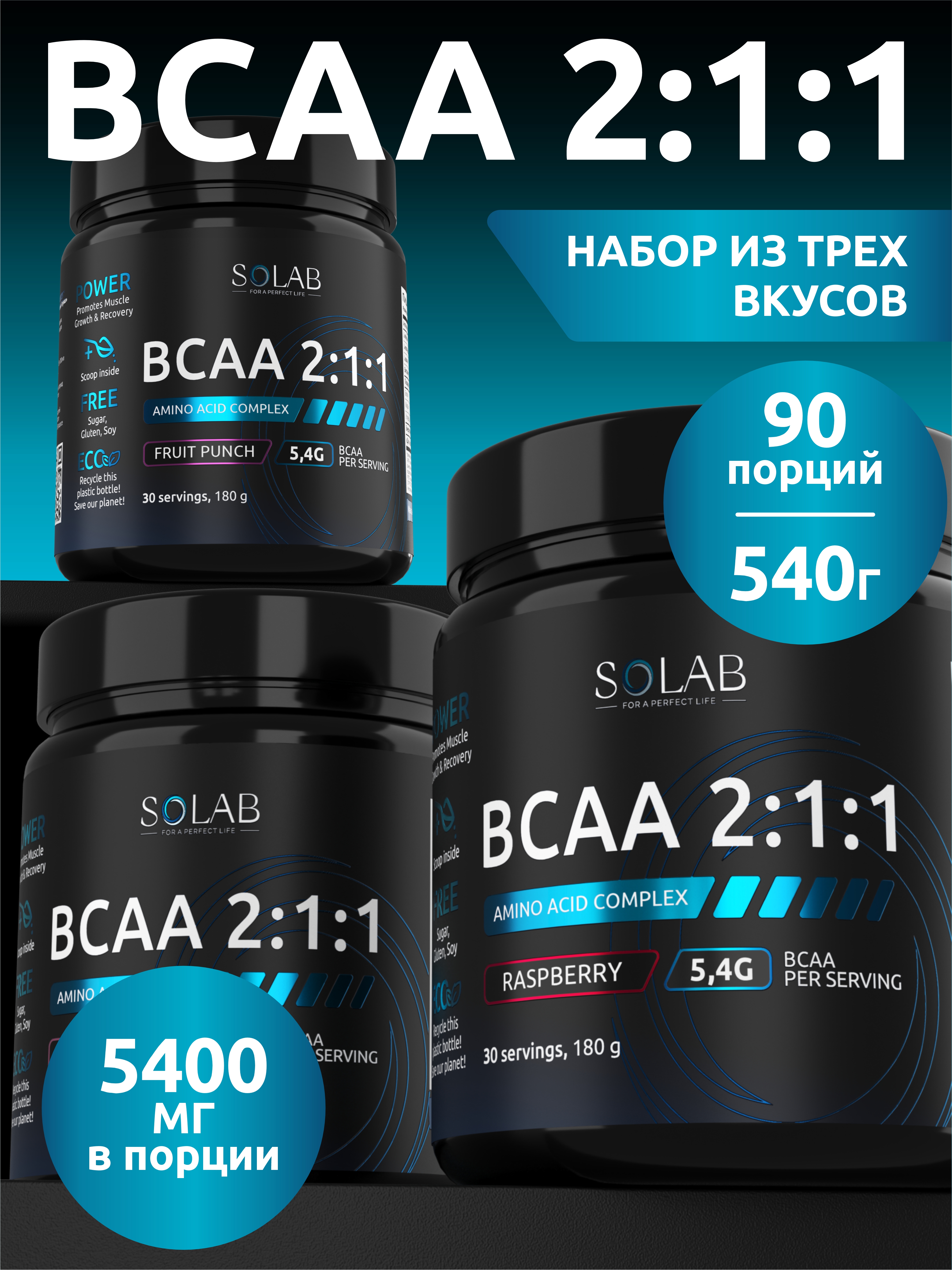 SOLAB / Набор 3х, BCAA 2:1:1 Вкусы: Бабл гам, Малина, Фруктовый пунш, 180 гр