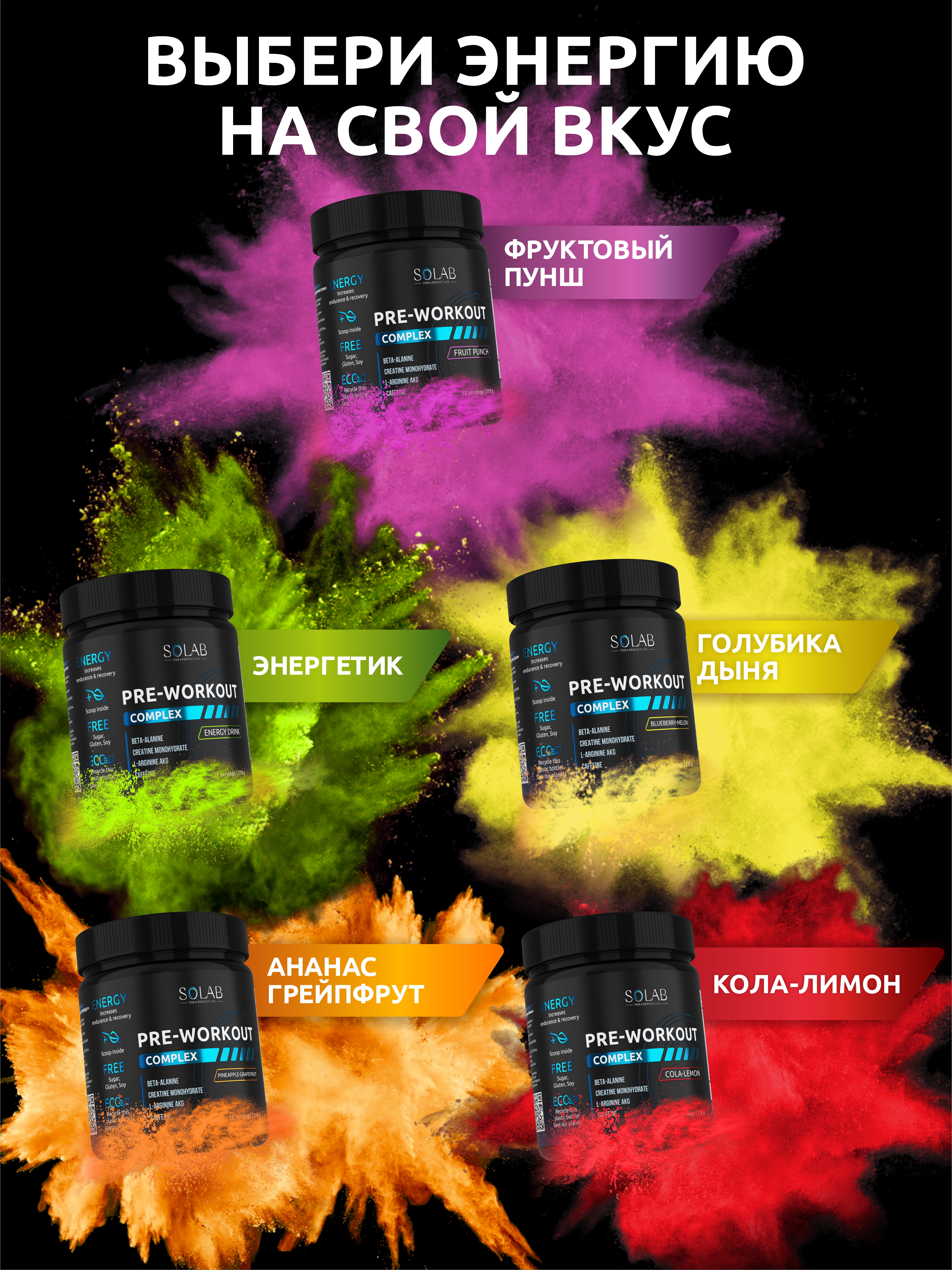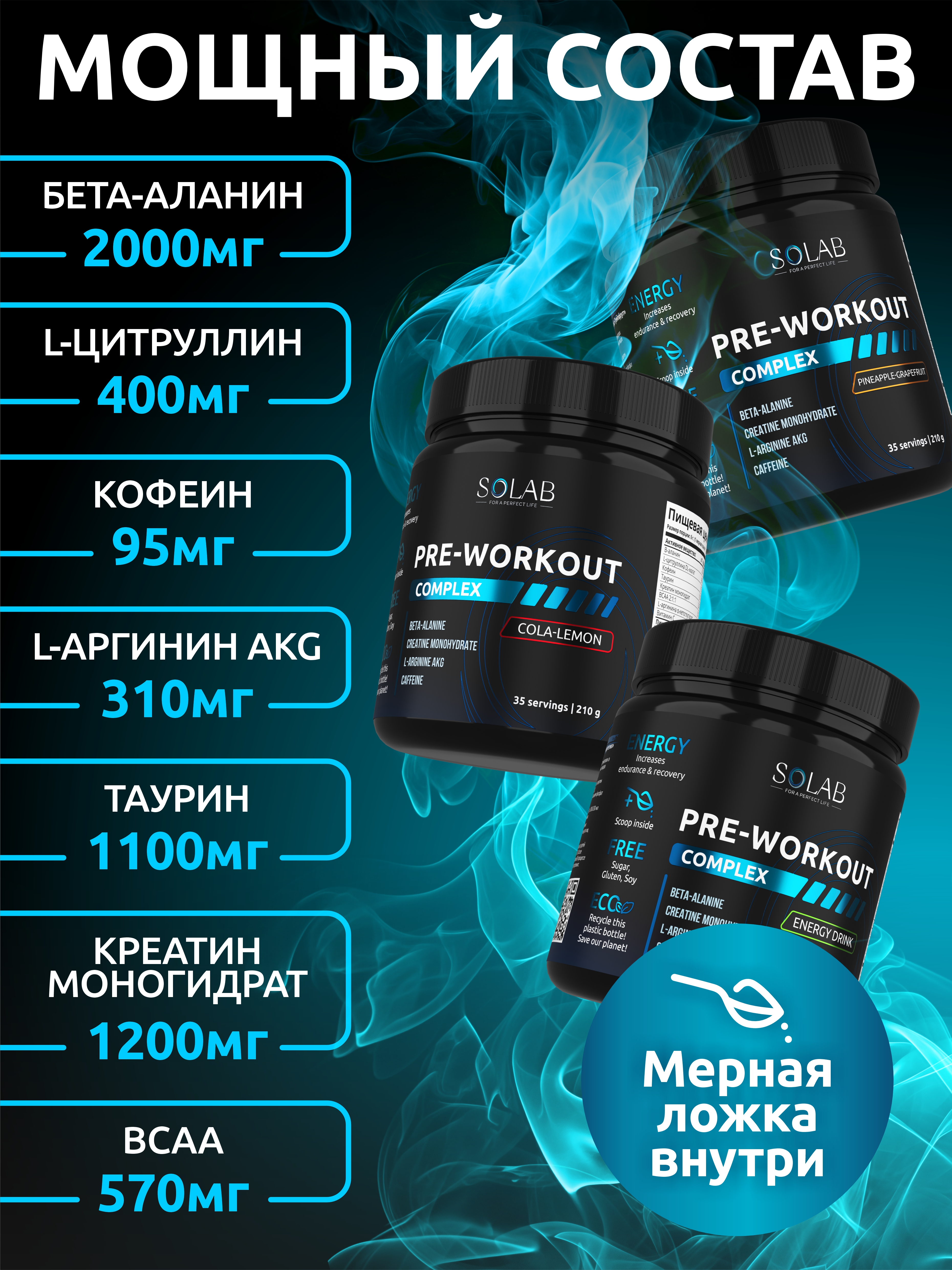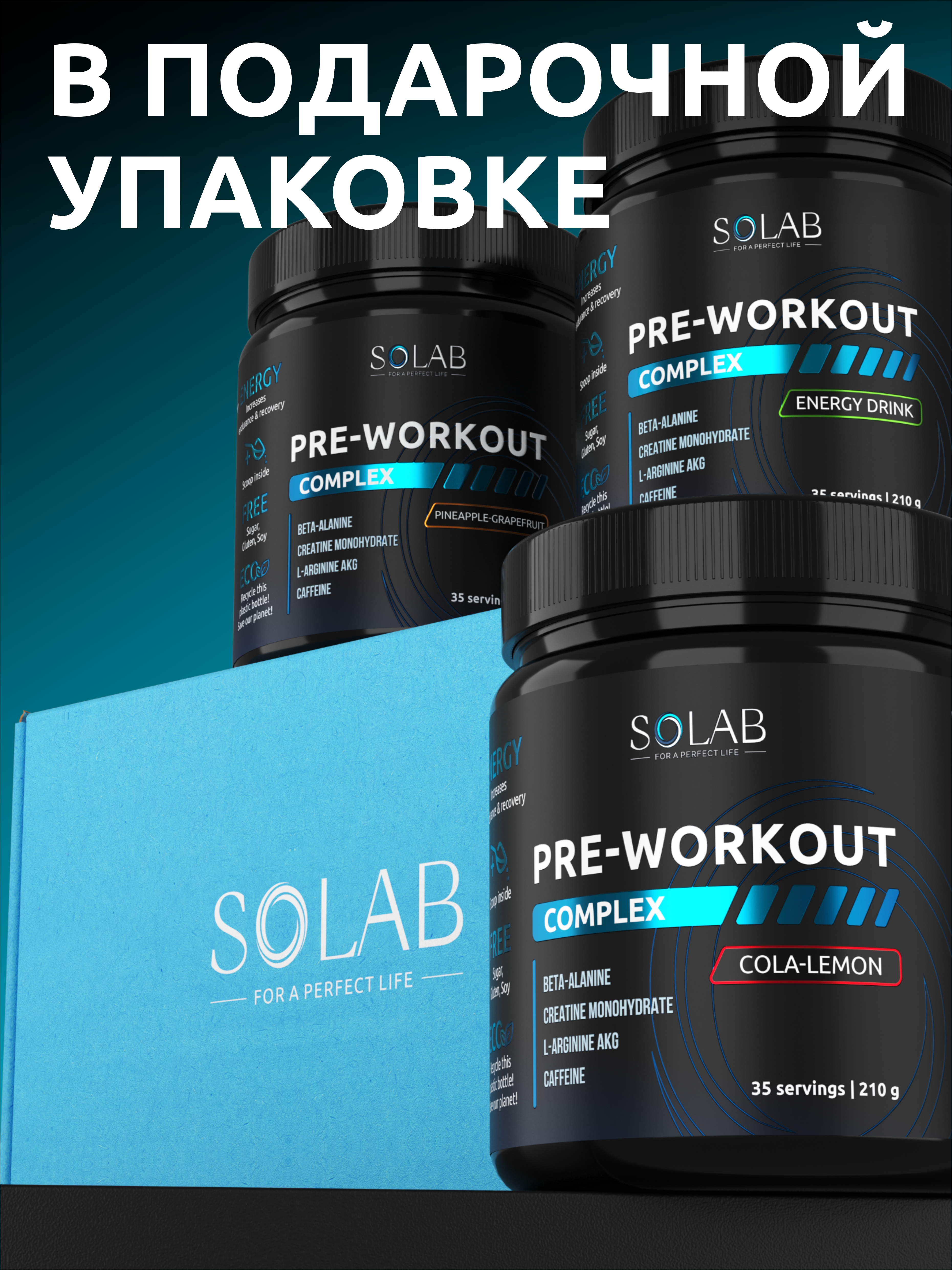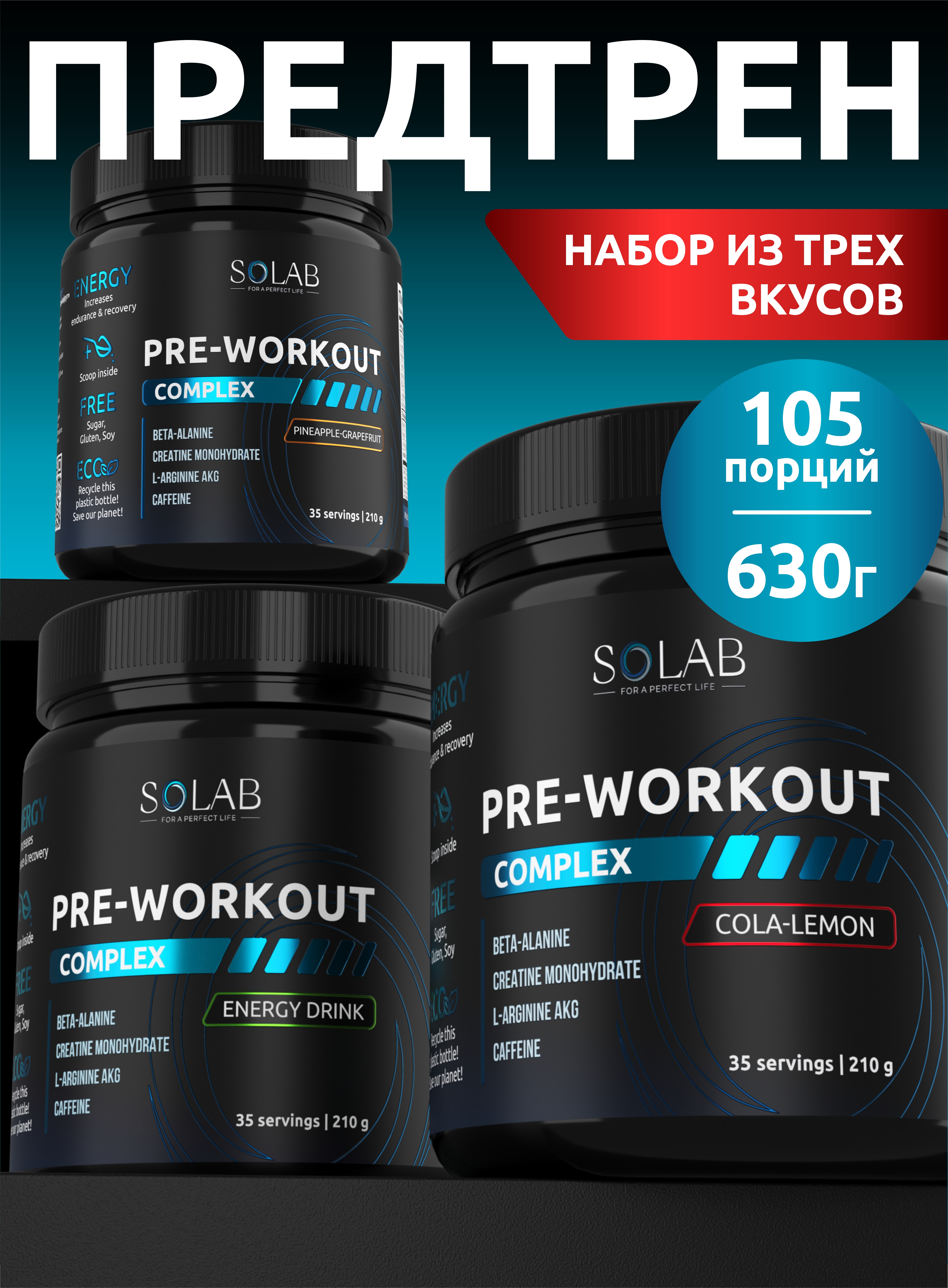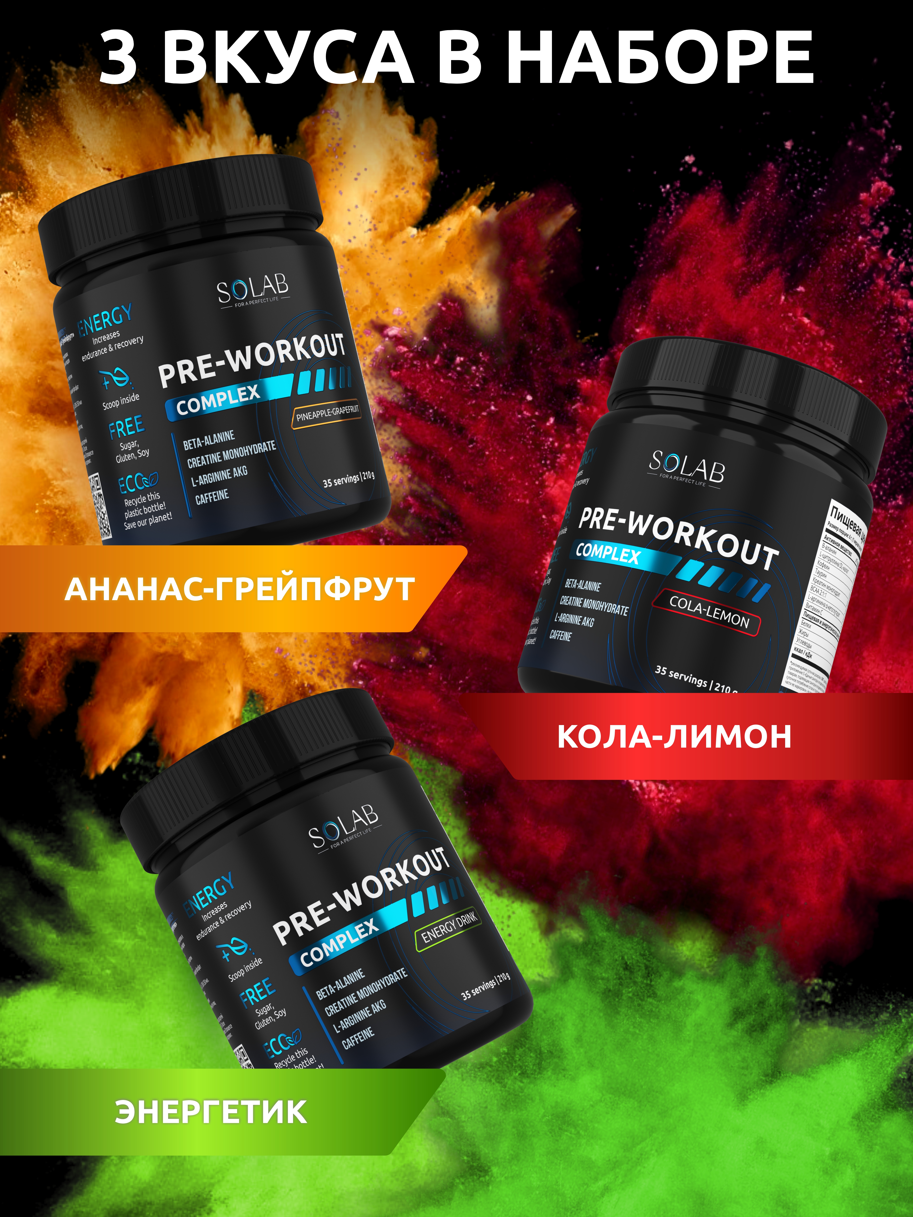 SOLAB / Набор предтренировочных комплексов, 3 банки Вкусы: Энергетик, Кола-лимон, Ананас-грепфрут, 105 порций, 210 гр
