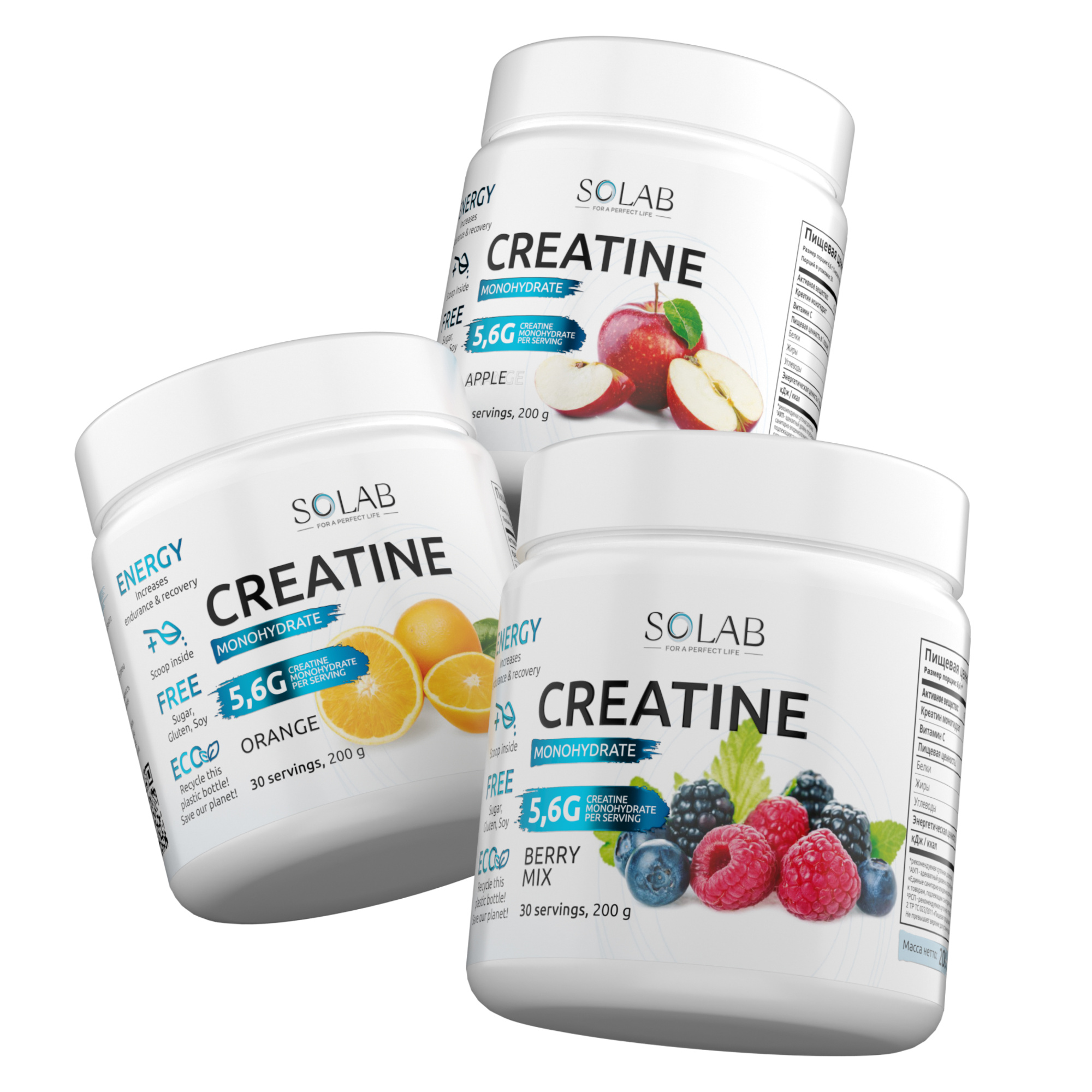 SOLAB / Креатин моногидрат, набор из 3-х банок. Вкус: Апельсин, Лесные Ягоды, Яблоко