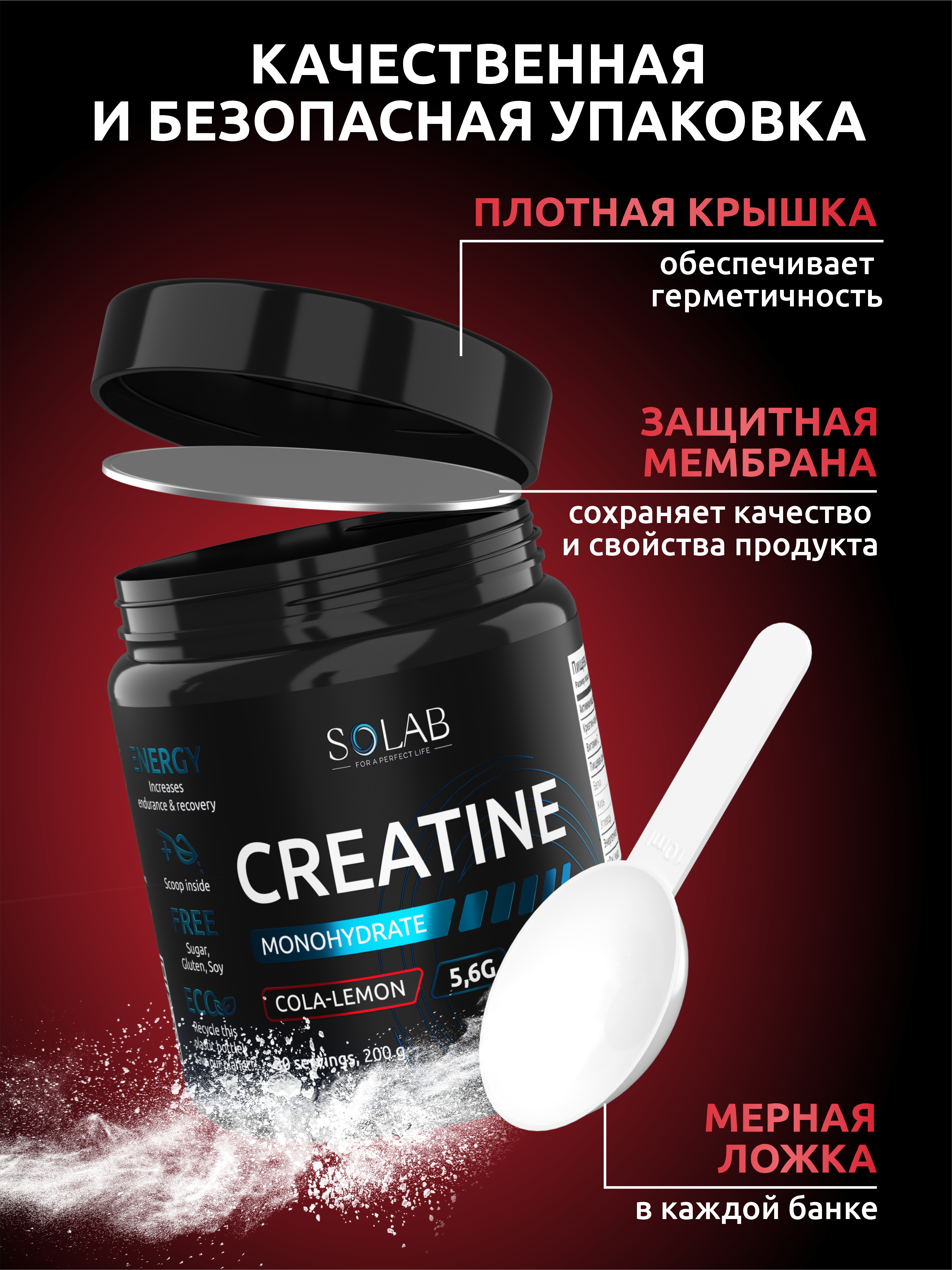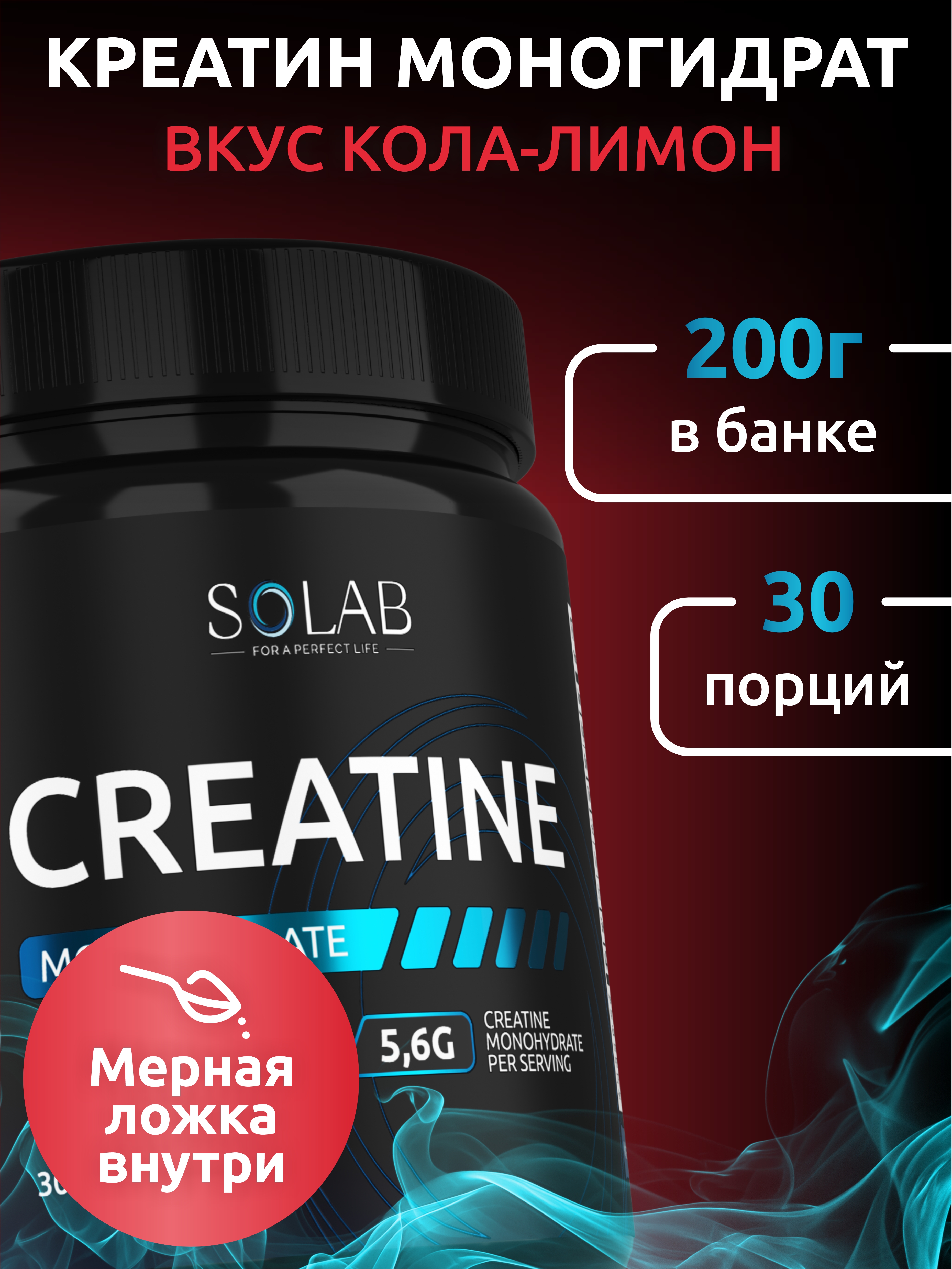 SOLAB / Креатин моногидрат, Creatine Monohydrate. Вкус Кола-лимон, 200 гр. 30 порций