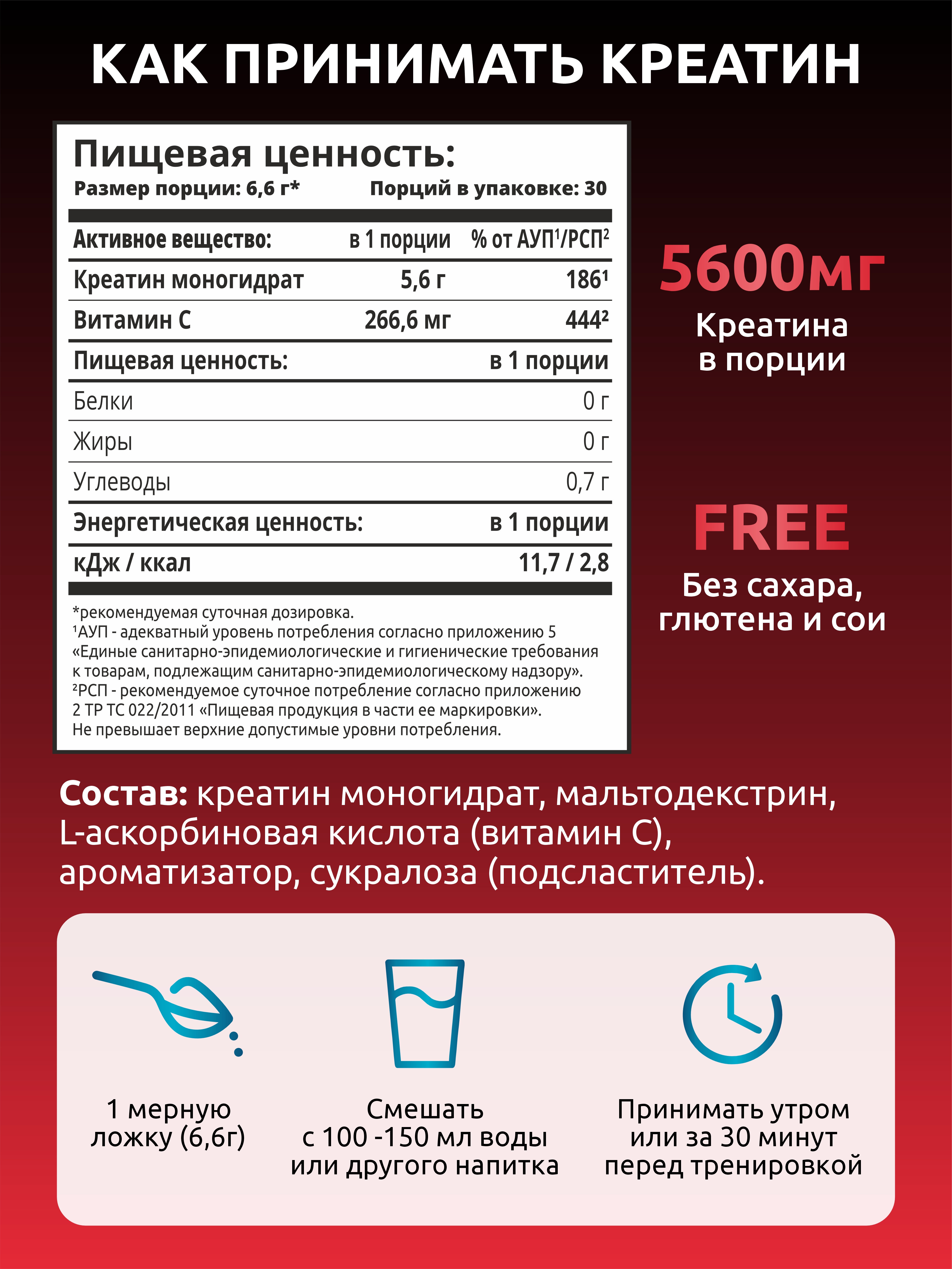 Мальтодекстрин в составе способствует лучшему усвоению креатинa у тех спортсменов, чей организм не давал реакции на чистый креатин. Витамин С компенсирует дефицит аскорбиновой кислоты, который наблюдается у спортсменов во время интенсивных тренировок, а также помогает в процессе восстановления мышц.