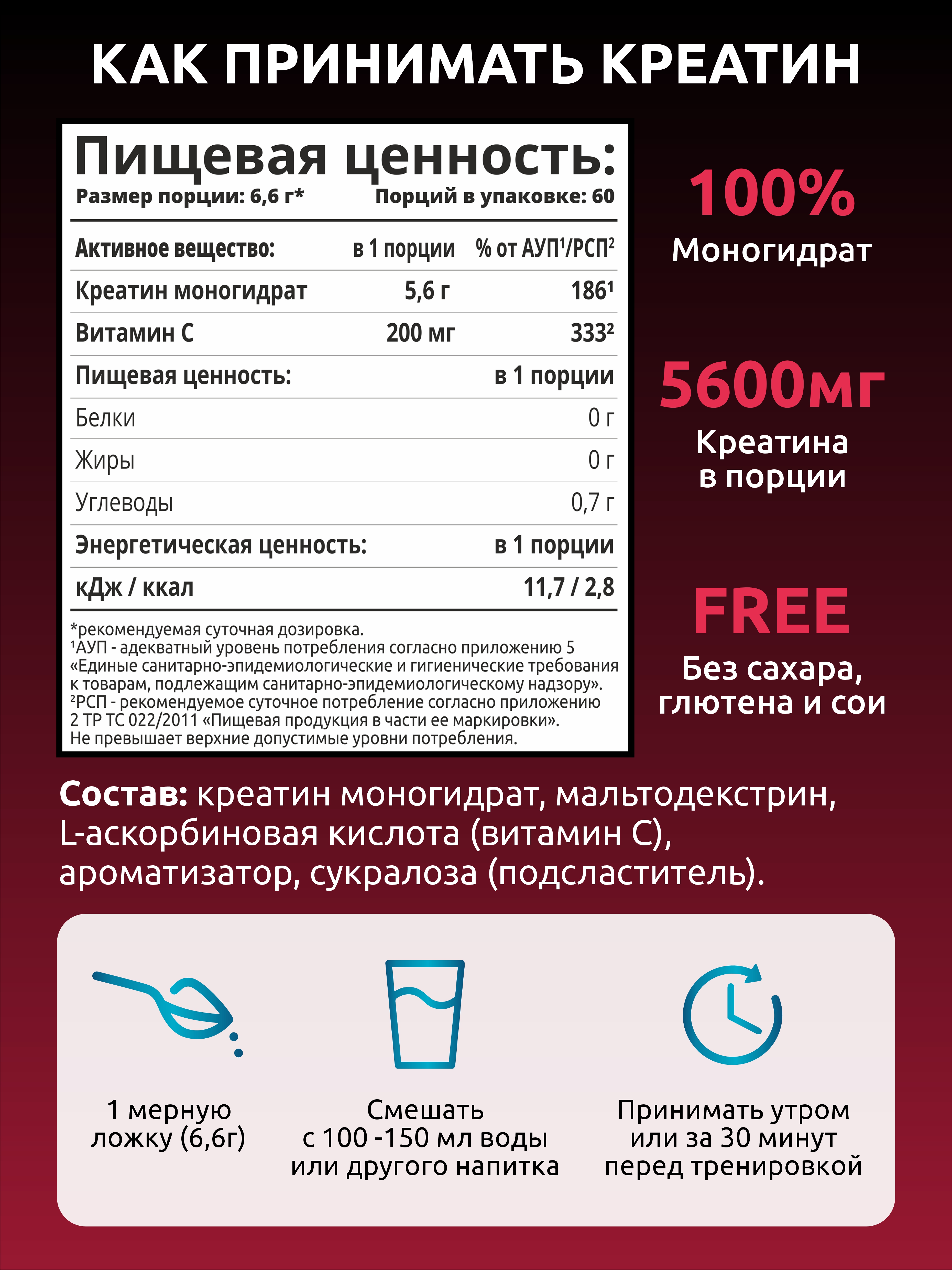 Мальтодекстрин в составе способствует лучшему усвоению креатинa у тех спортсменов, чей организм не давал реакции на чистый креатин. Витамин С компенсирует дефицит аскорбиновой кислоты, который наблюдается у спортсменов во время интенсивных тренировок, а также помогает в процессе восстановления мышц.