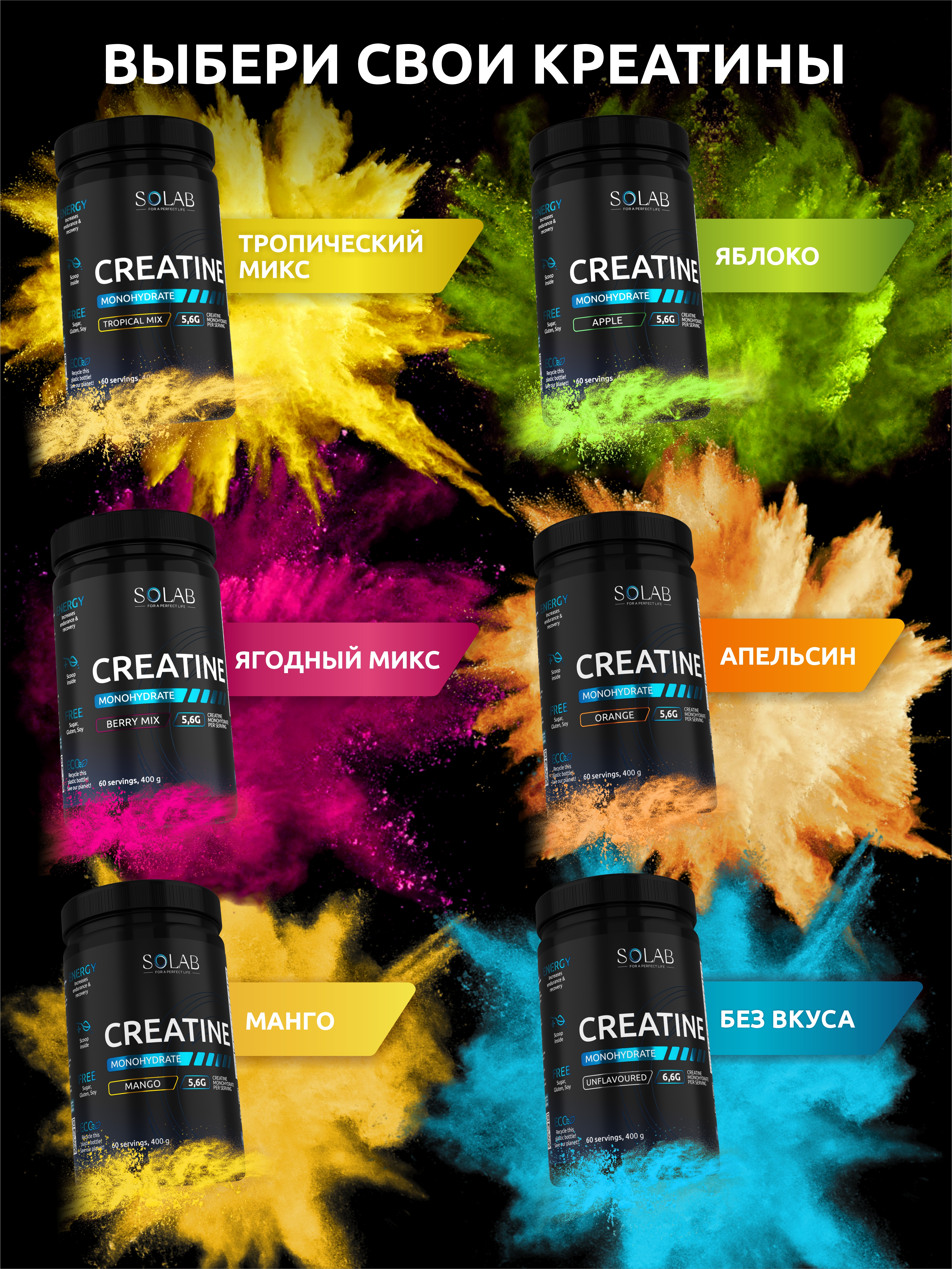 SOLAB / Креатин моногидрат. Вкус Малина, 400 гр. 60 порций