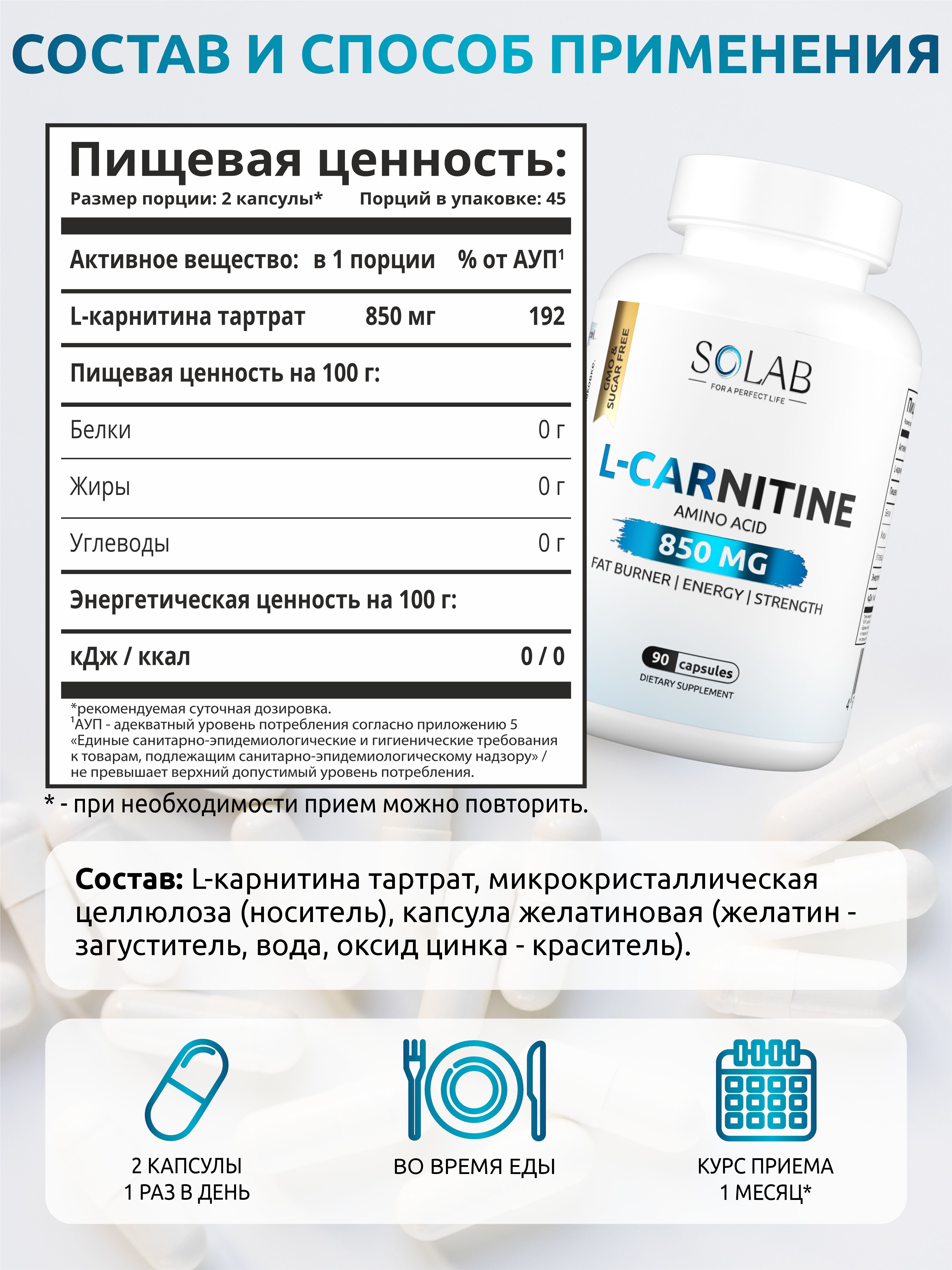 L - карнитин (l-carnitine) способствует снижению усталости и сокращает срок восстановления мышечной ткани. Эффективный жиросжигатель л карнитин (l carnitine) капсулы для похудения помогают снизить уровень сахара в крови и защитить печень от накопления жира. Спортивное питание повышает умственную активность, положительно влияет на репродуктивную функцию, снижает уровень холестерина.