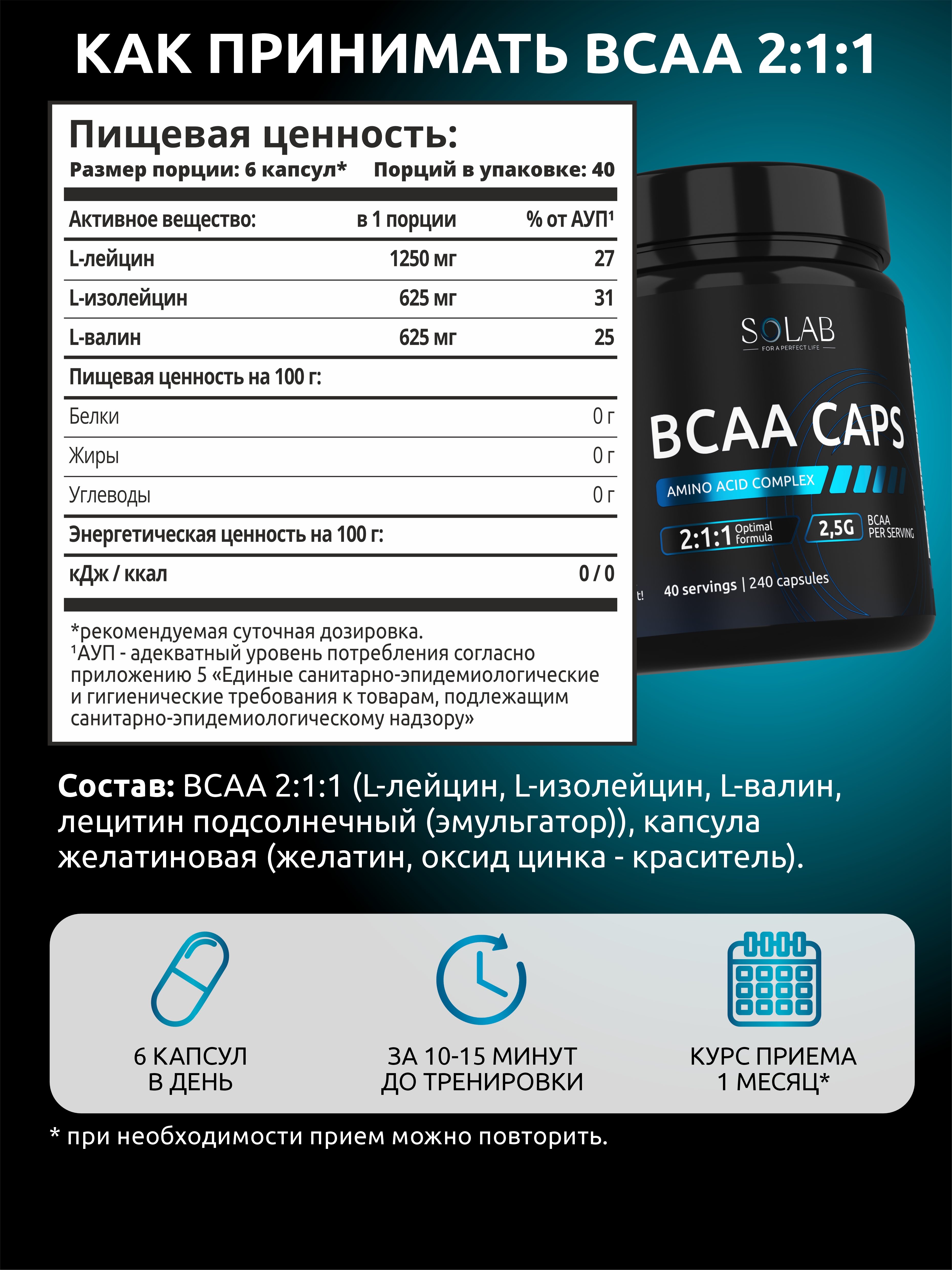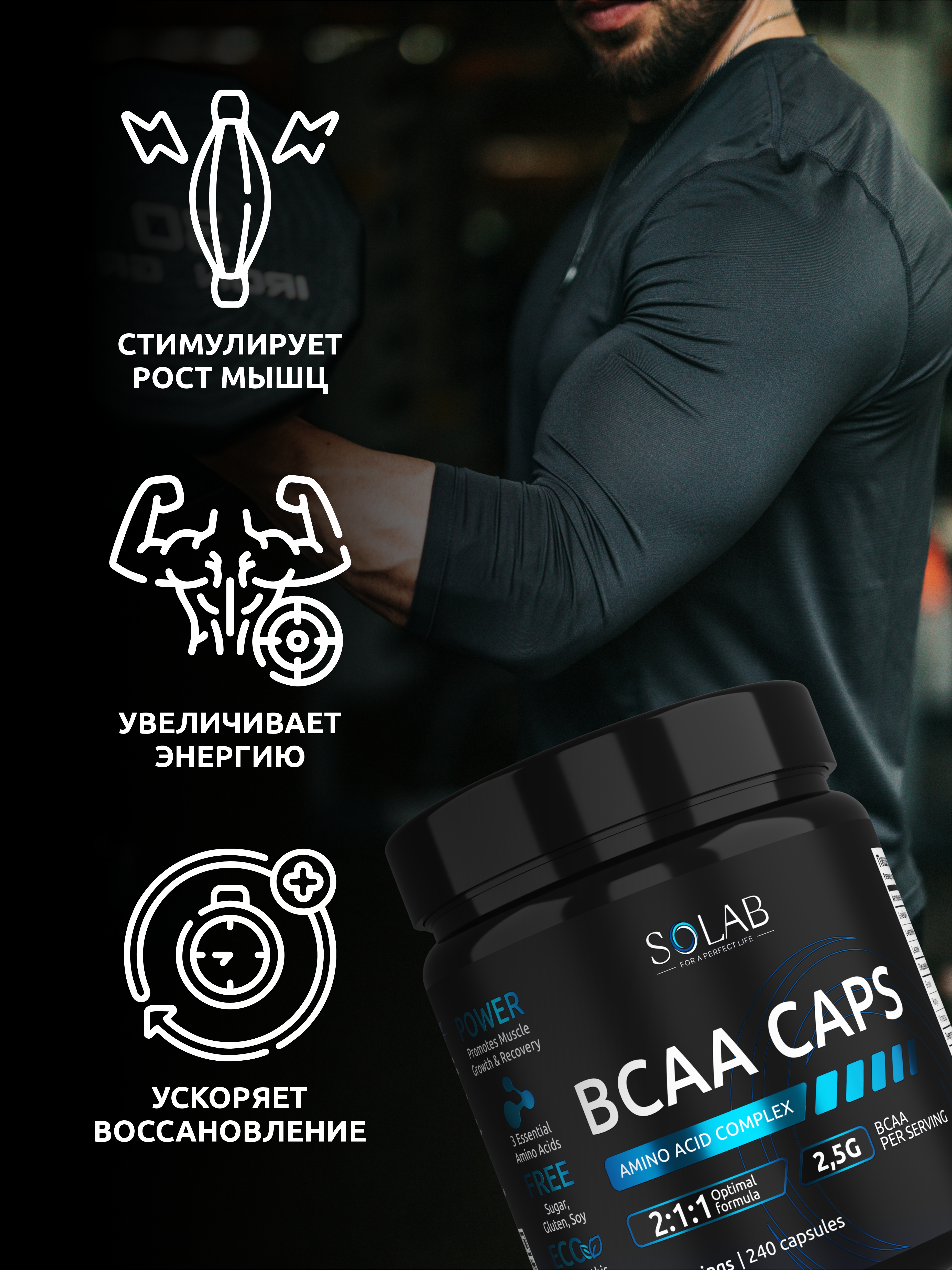 Аминокислотный комплекс ВСАА 2:1:1 устраняет мышечный катаболизм, восстанавливает энергообмен, ускоряет синтез белка и уменьшает болевые симптомы после интенсивных тренировок.