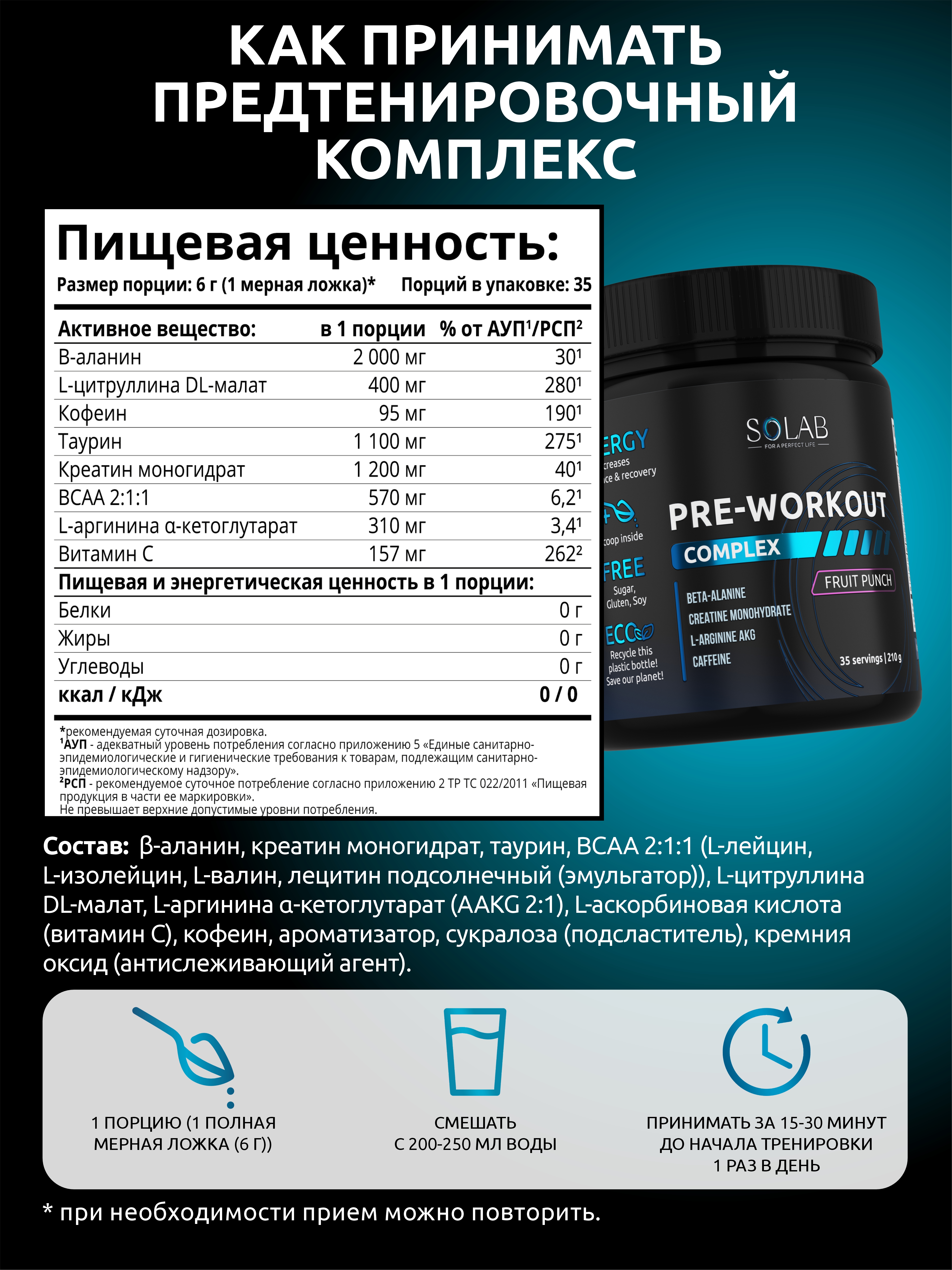 Прием креатина важен для набора мышечной массы и повышения качества тренировок. Предтрен стимулирует энергоресурсы организма, защищая при этом сердечно-сосудистую систему от перегрузок. ВСАА — комплекс аминокислот, которые препятствуют разрушению мышечной ткани и восполняют потребность в энергии во время интенсивных нагрузок.