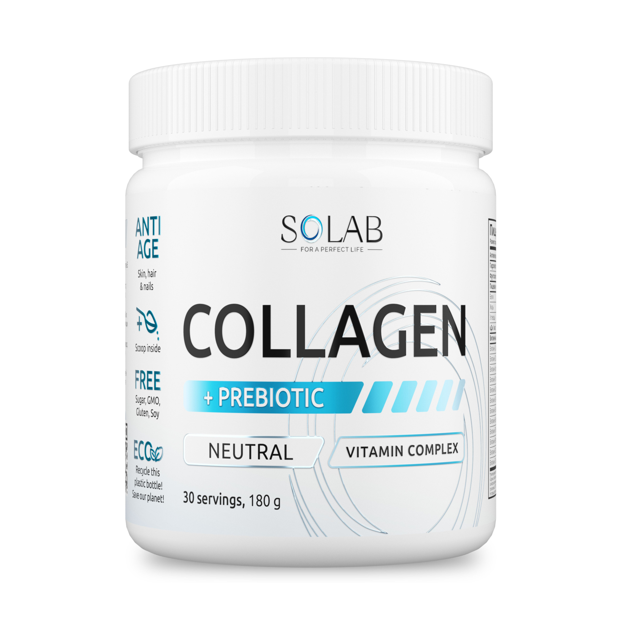 SOLAB / Коллаген с пребиотиками. Нейтральный вкус, 180г. 30 порций
