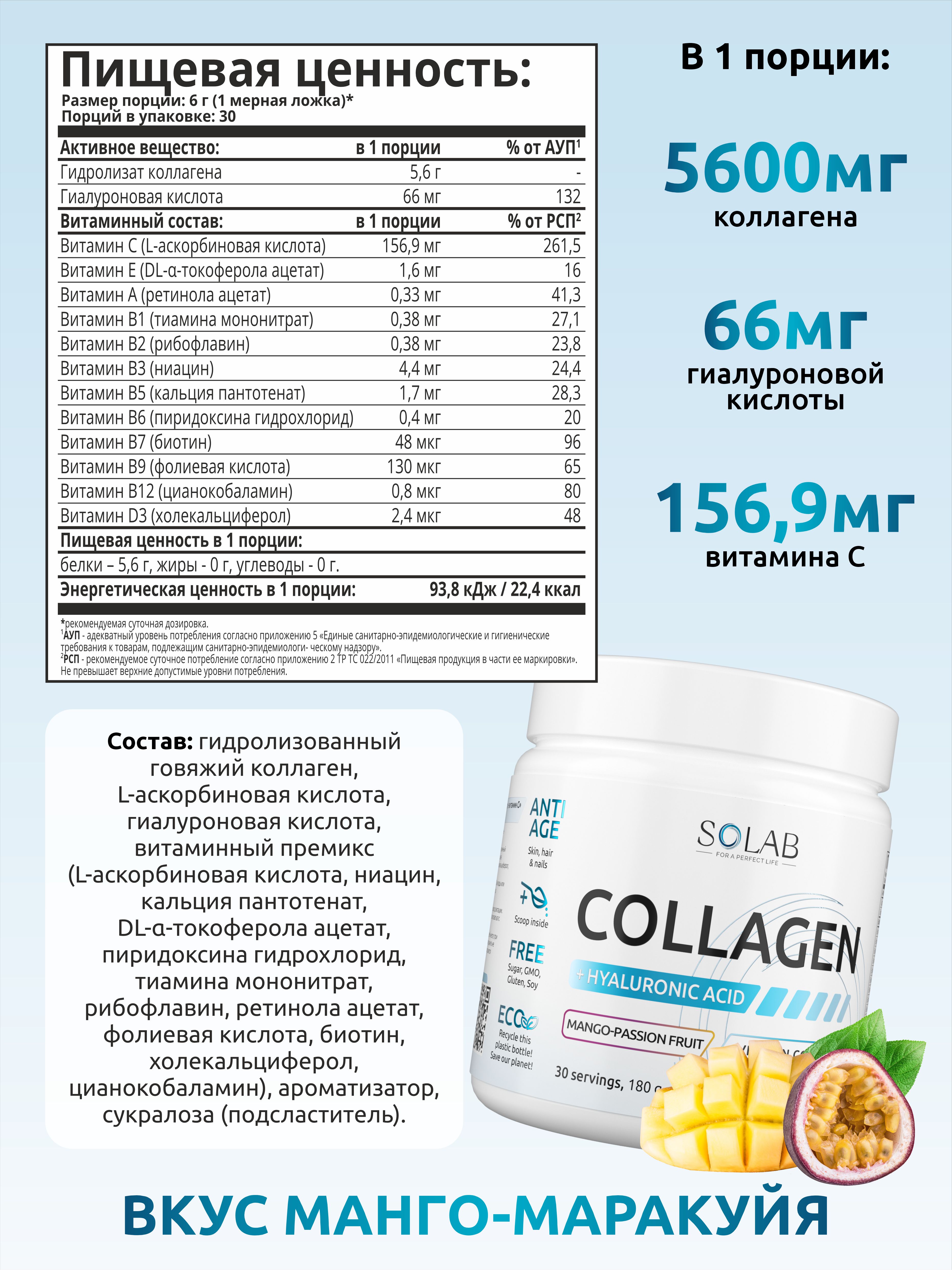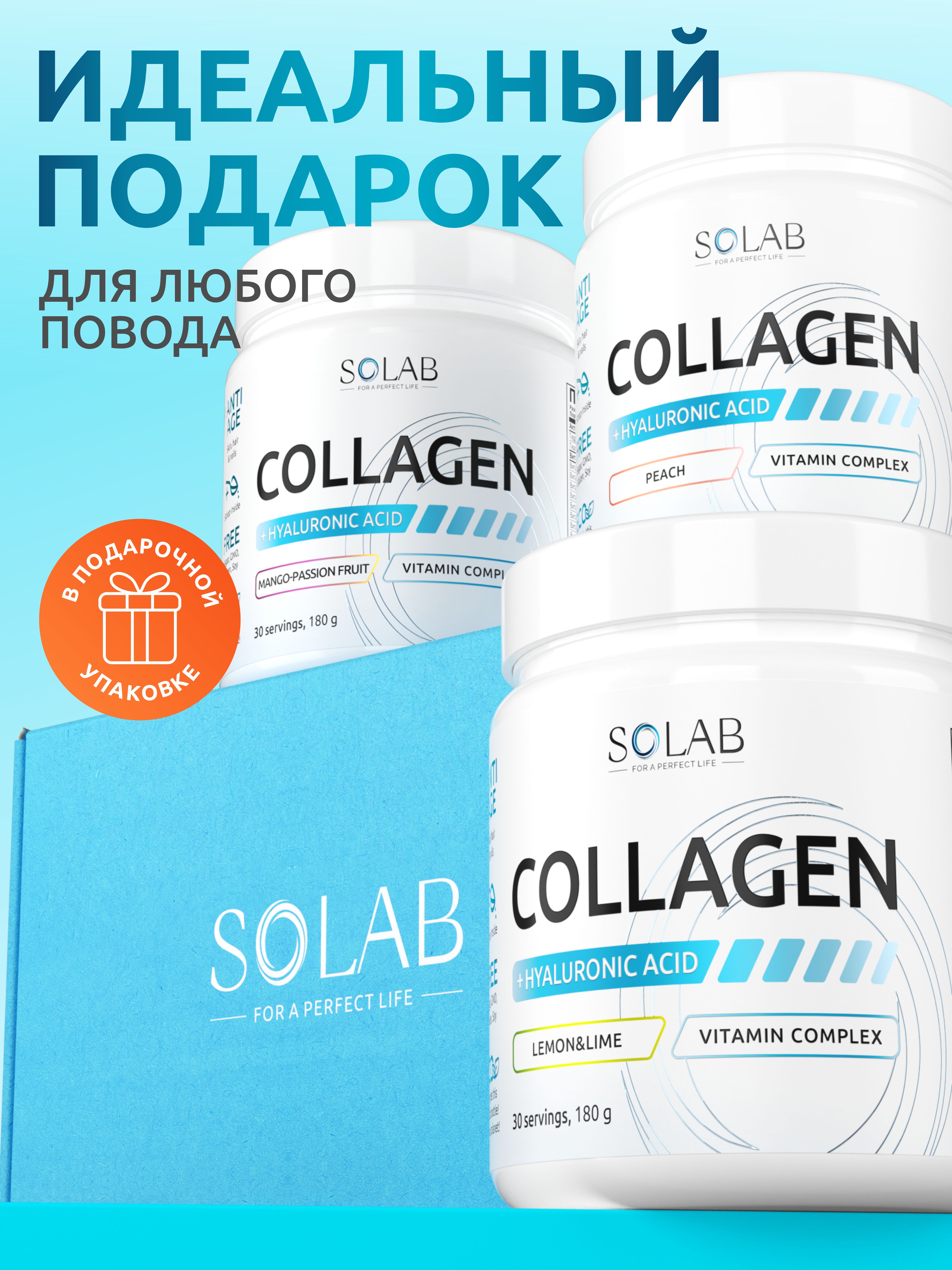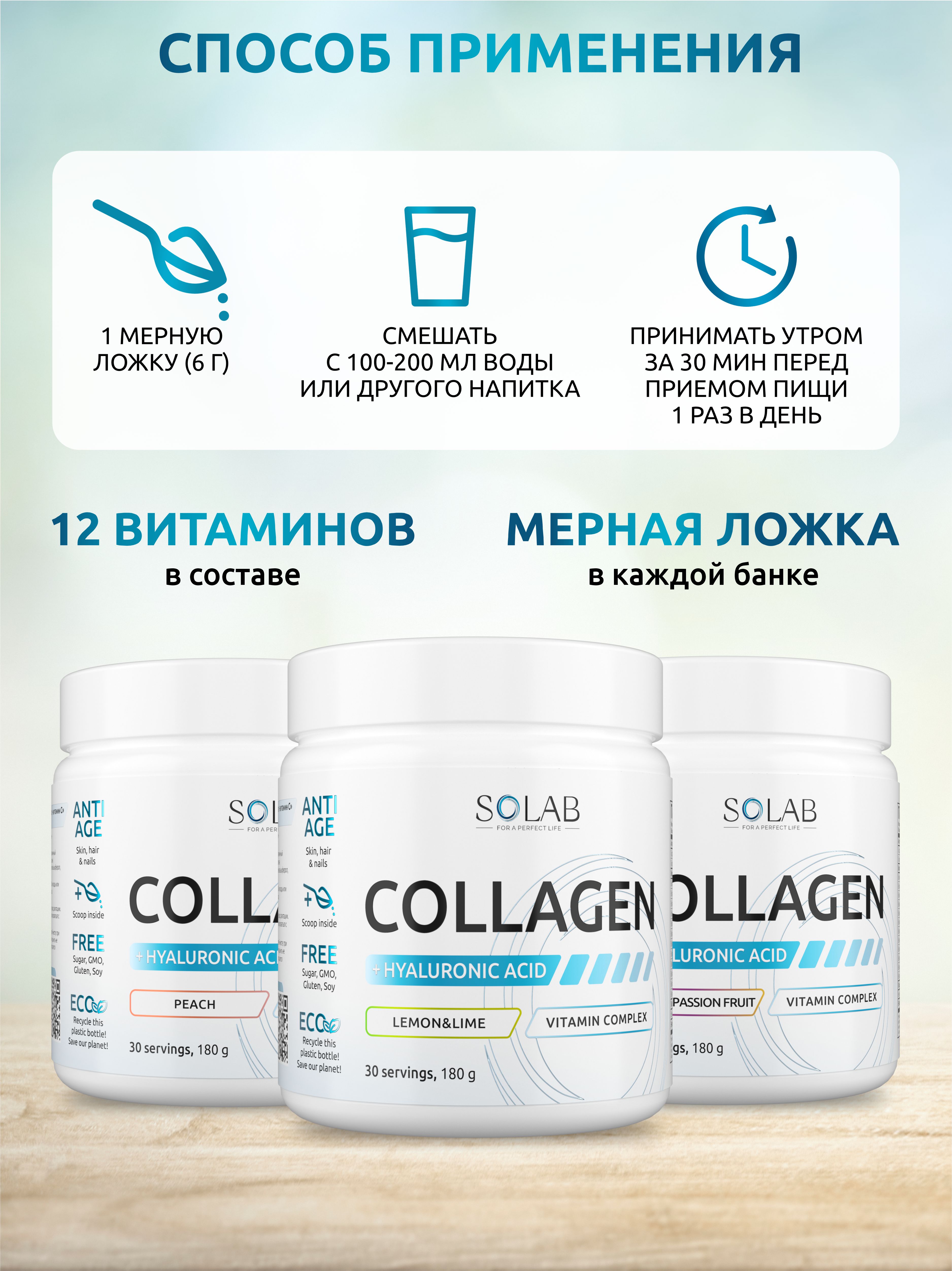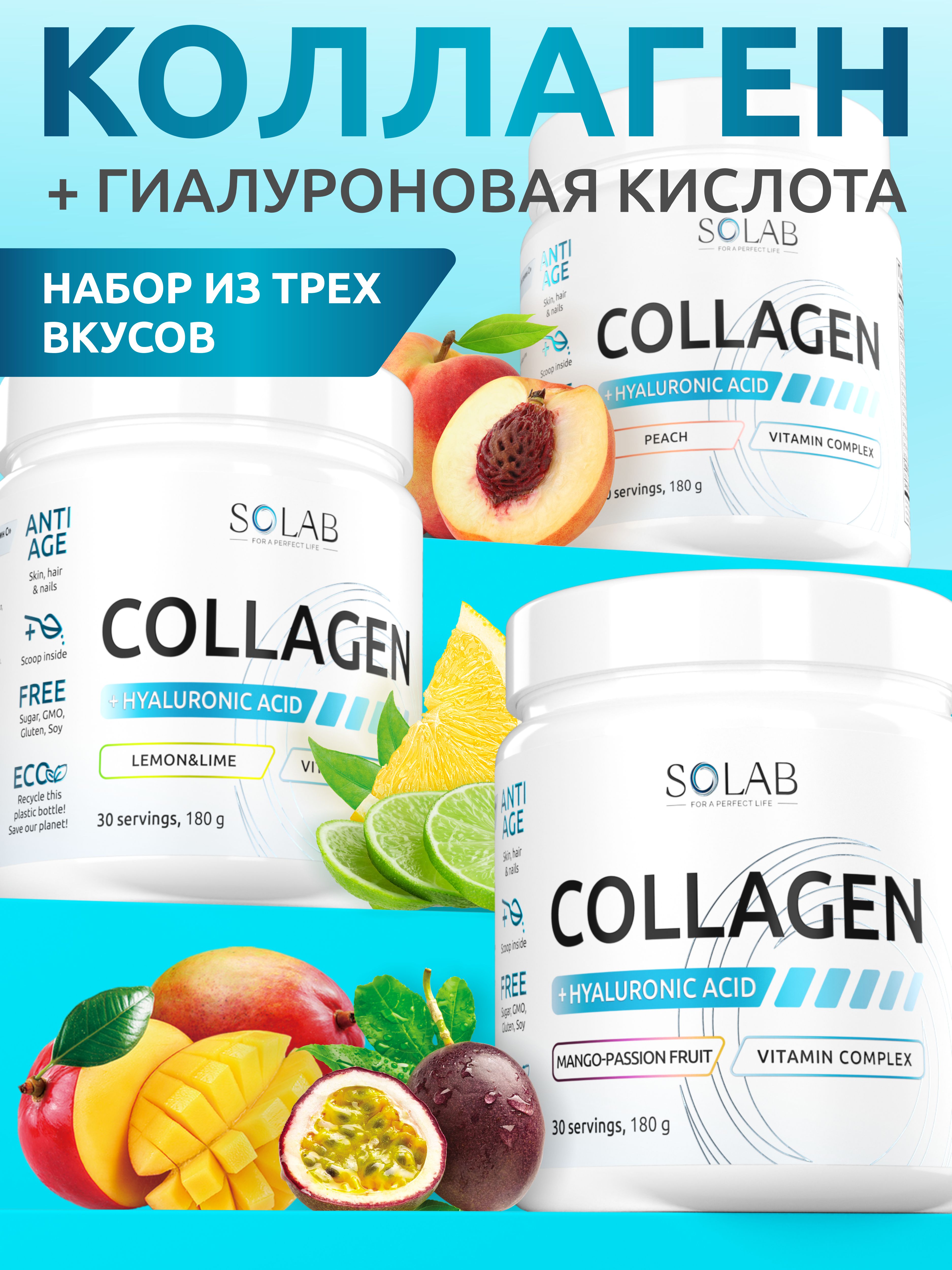 SOLAB / Набор Коллагенов с витамином С и гиалуроновой кислотой. 3 вкуса: Лимон-лайм, Манго-маракуйя, Персик,180 г.