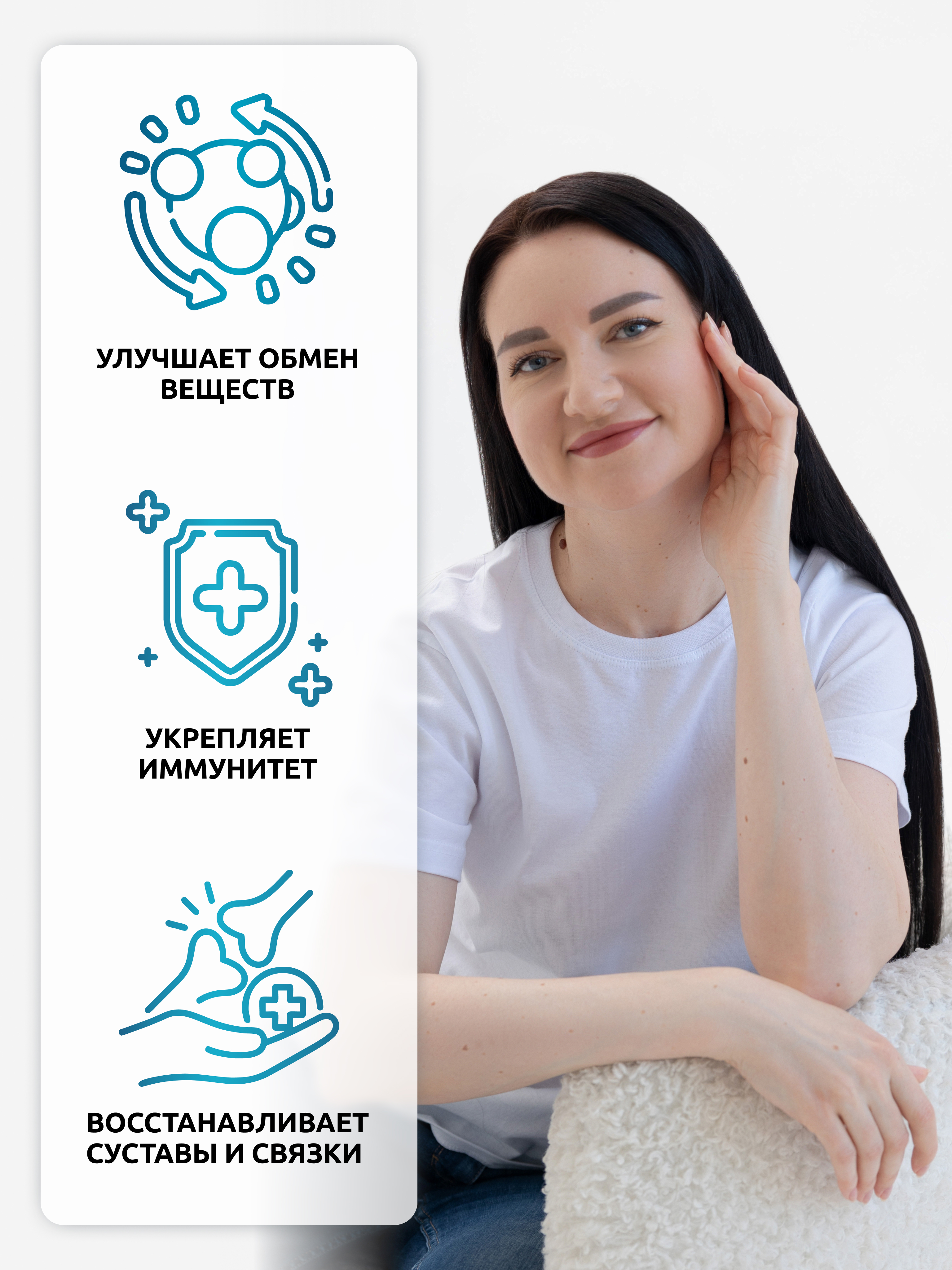 Гидролизированный коллаген оказывает омолаживающий эффект: подтягивает кожу, повышает ее эластичность и упругость, устраняет небольшие неровности и мелкие морщины. Прием коллагена способствует укреплению волос и ногтей, поддерживает здоровье суставов и связок. Гидролизат коллагена считается наиболее биодоступной формой, которая ускоряет проявление результата. Комплекс усилен витамином С, который стимулирует выработку собственного коллагена и способствует усвоению пептидов коллагена.