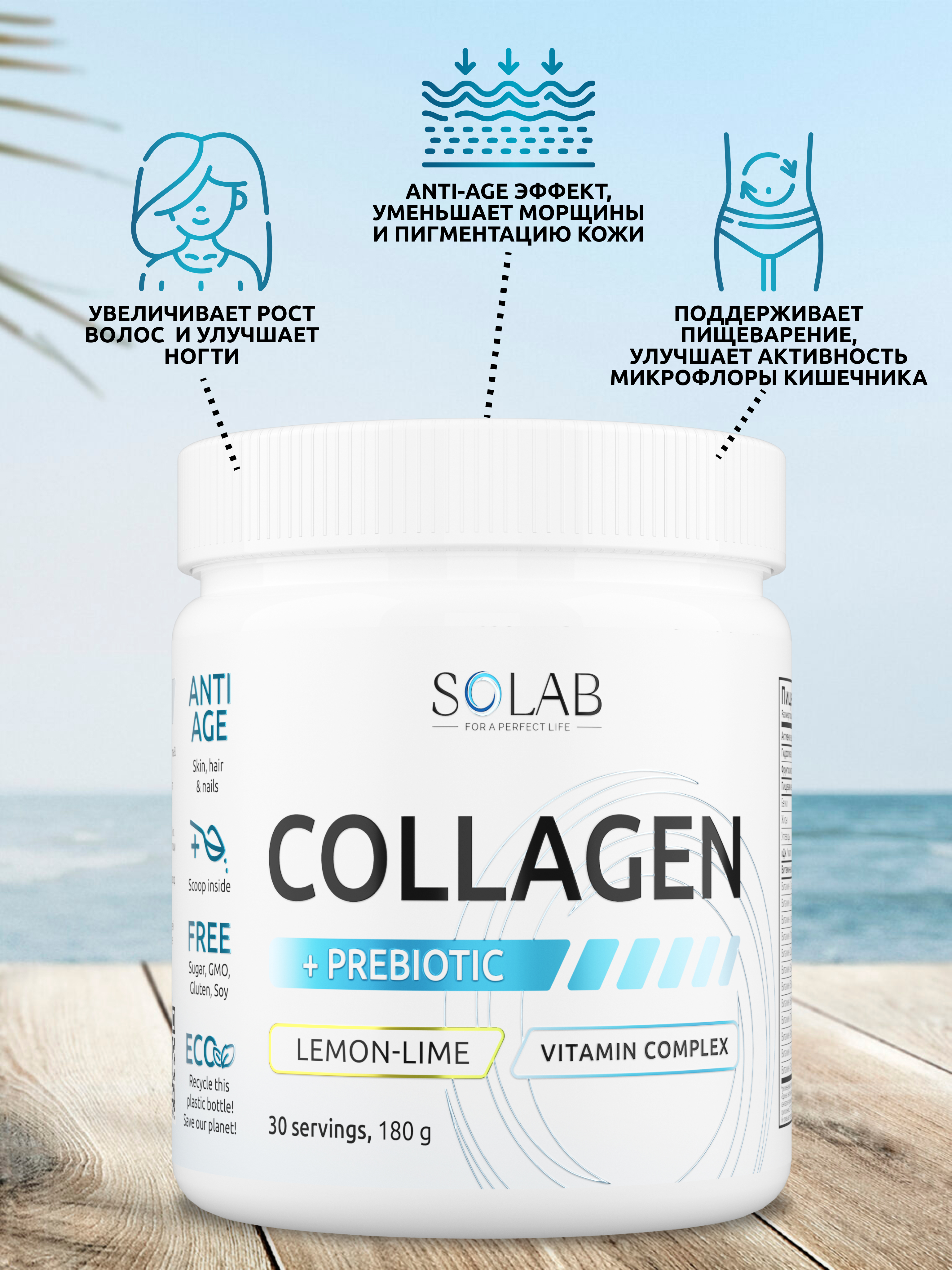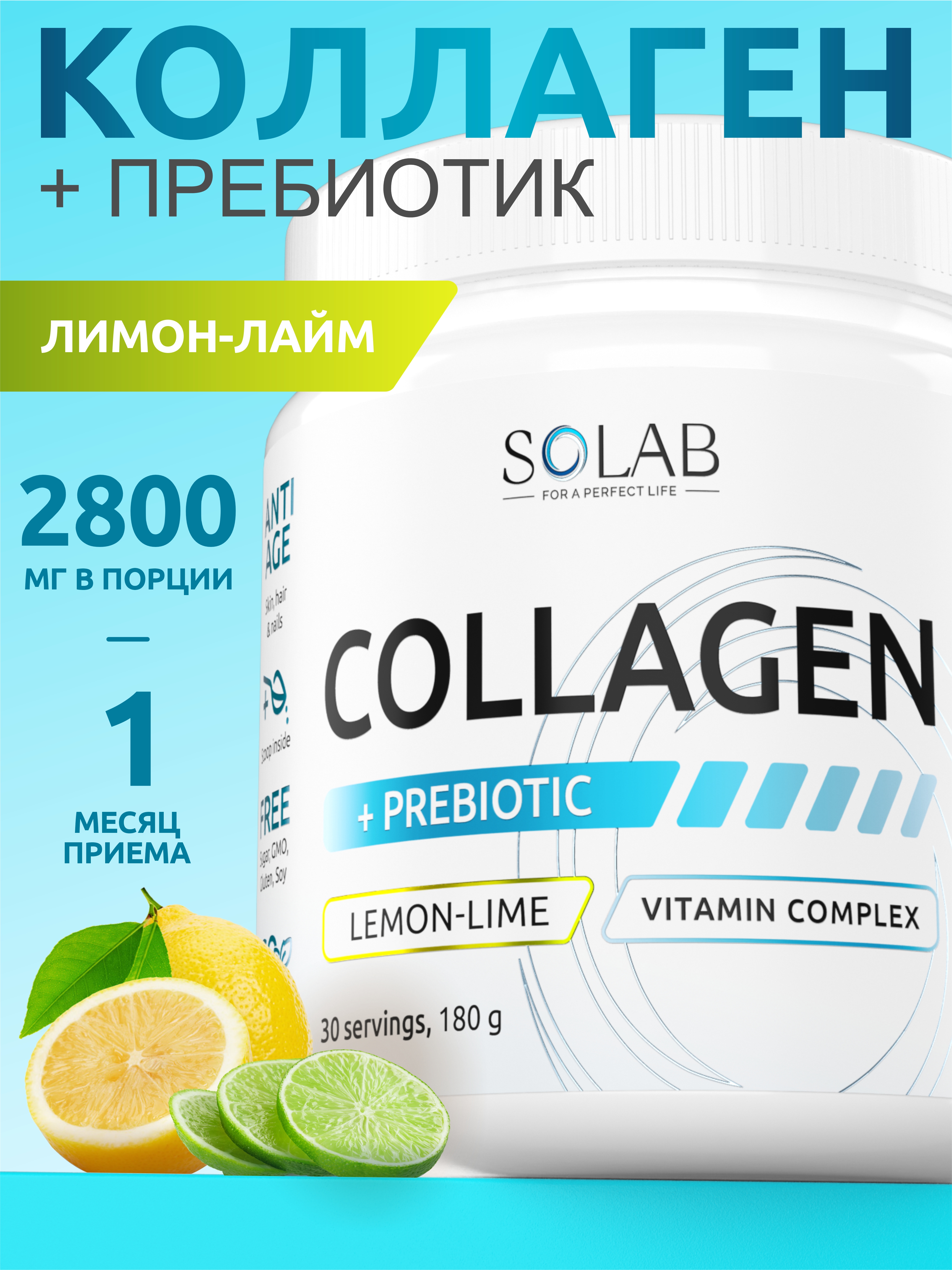 SOLAB / Коллаген с пребиотиками. Вкус Лимон-лайм 180г. 30 порций