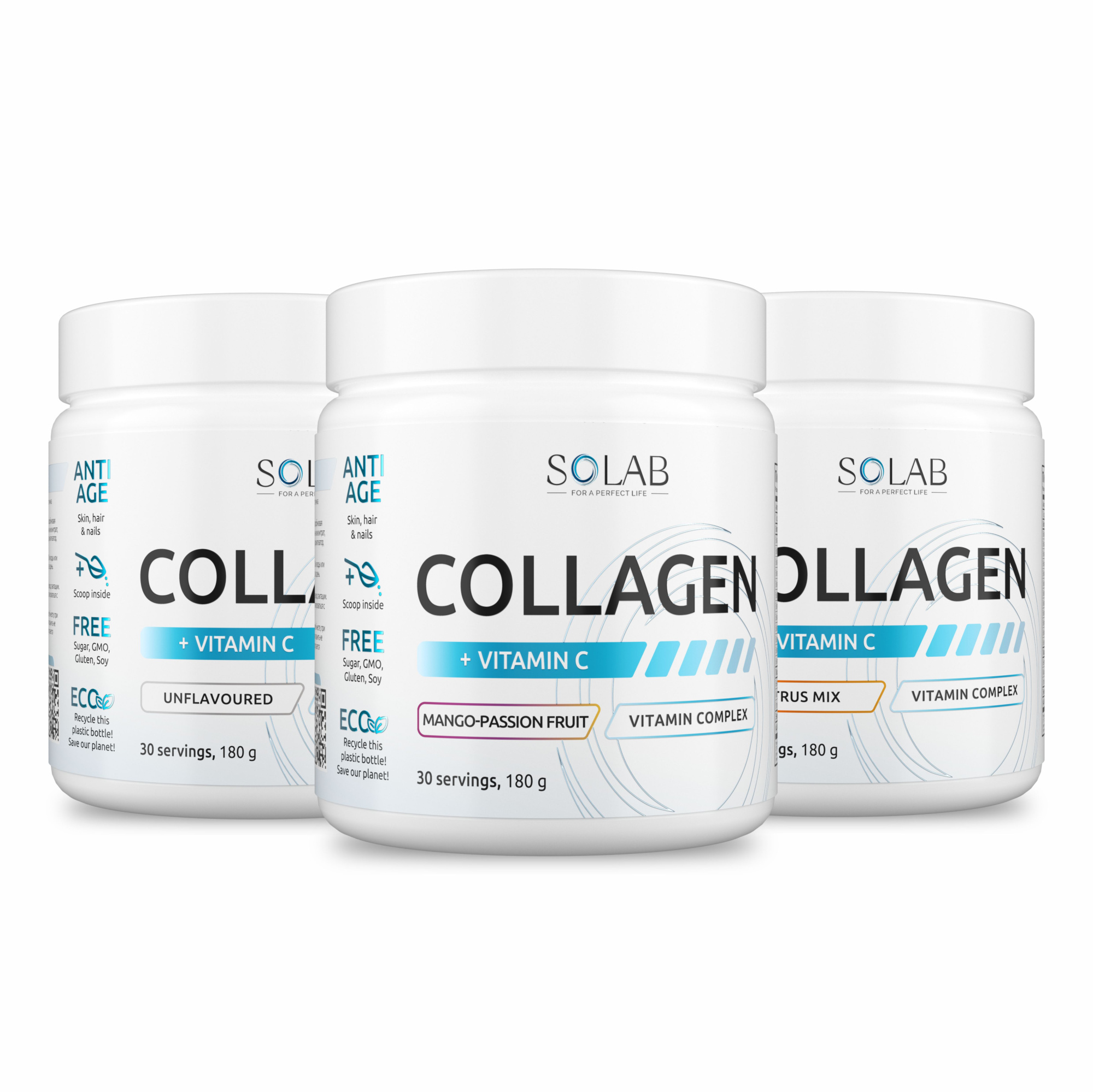 SOLAB / Набор Коллагенов с витамином С. 3 вкуса: Нейтральный, Манго-маракуйя, Цитрусовый микс,180 г.