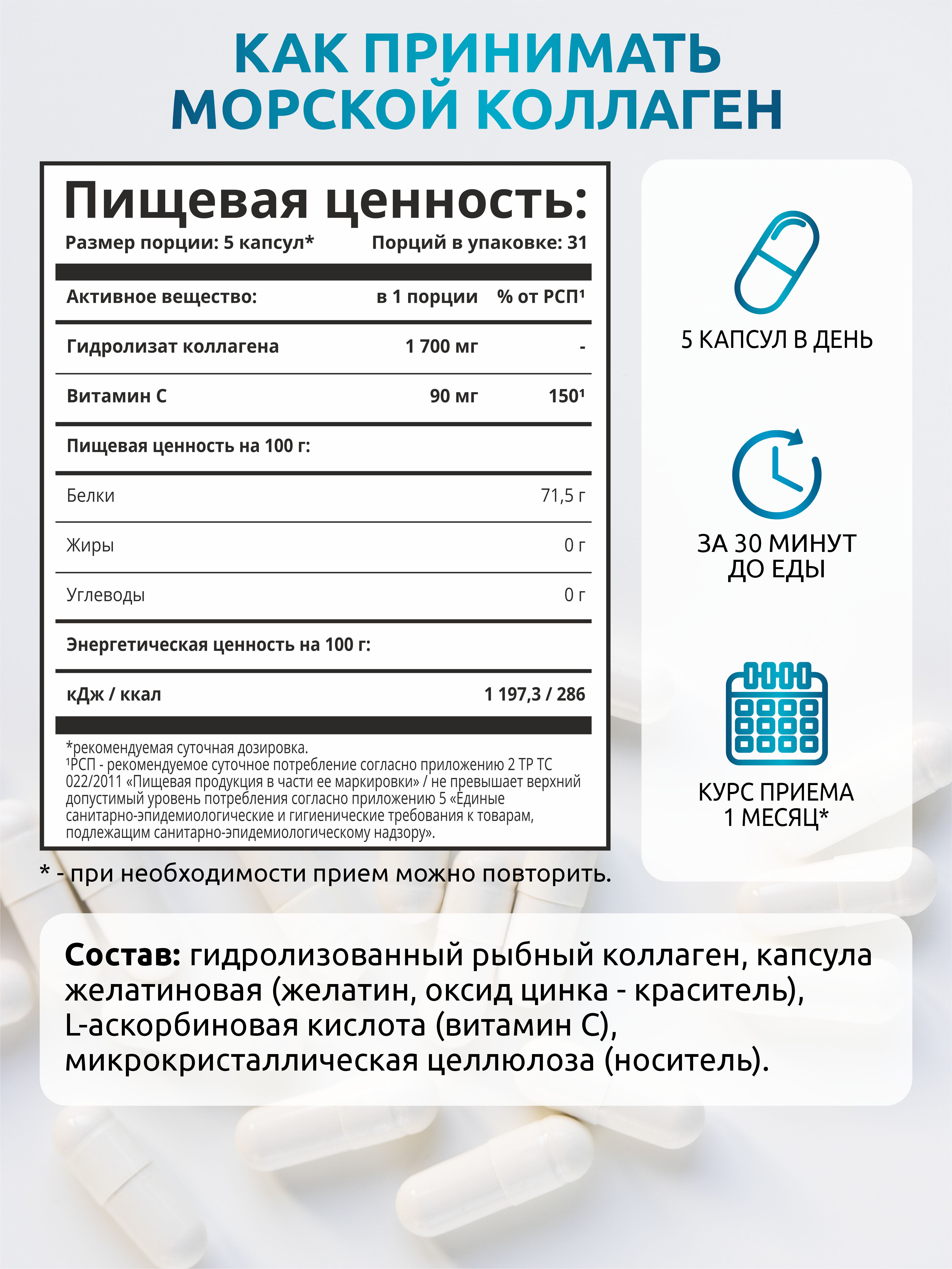Принимайте по 5 капсул в день. Омолаживающий эффект наиболее заметен при употреблении морского коллагена в течение 2-3 месяцев.
