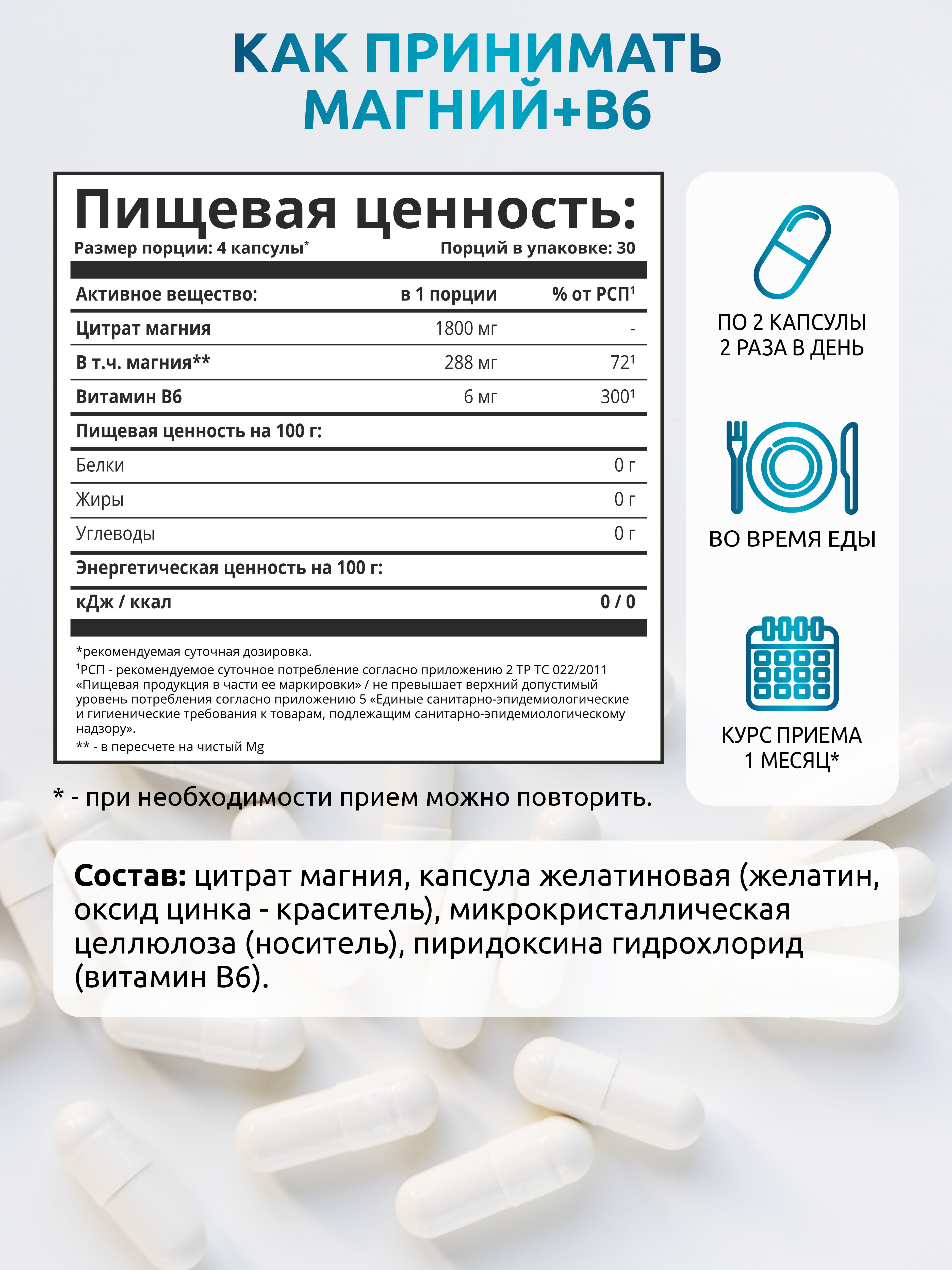 В 1 порции нашего комплекса содержится 288 мг цитрата магния и 6 мг витамина В6, который необходим для лучшего усвоения макроэлемента.
