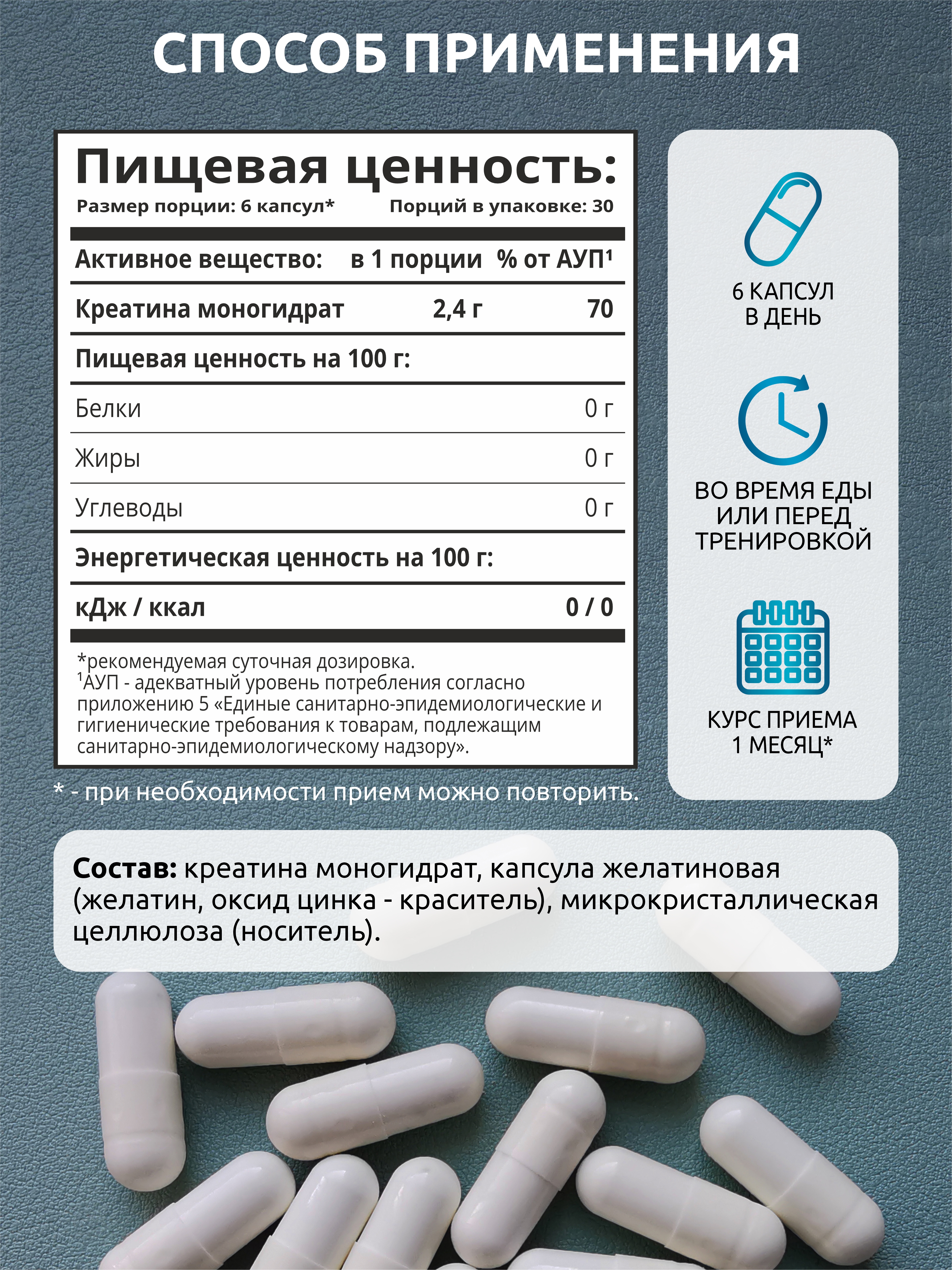Органическая кислота креатин состоит из аминокислот глицина, аргинина, метионина, которые напитывают мышцы энергией. Микронизированная моногидратная форма быстро усваивается организмом в полном объеме - до 99 %. 1 порция (6 капсул) содержит 2,4 граммов креатина.