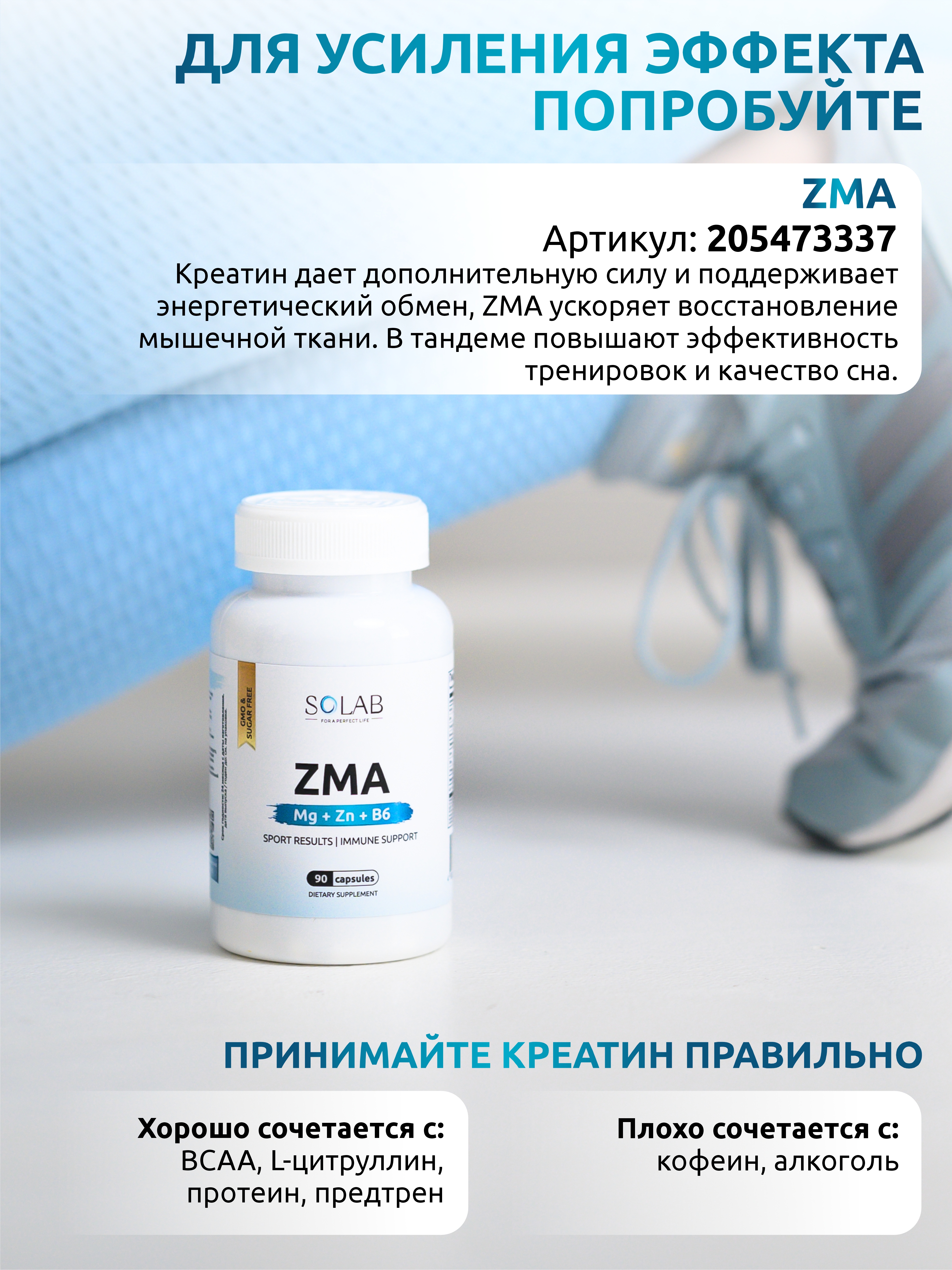 Заряжайте мышцы энергией перед каждой тренировкой. Моногидрат креатина от Solab обеспечит энергетическое питание мышц во время занятий, поможет тренироваться дольше и интенсивнее, придаст выносливости. Вы быстрее достигнете результата - красивого рельефного тела и подтянутой фигуры. БАД способствует восстановлению после физической нагрузки.