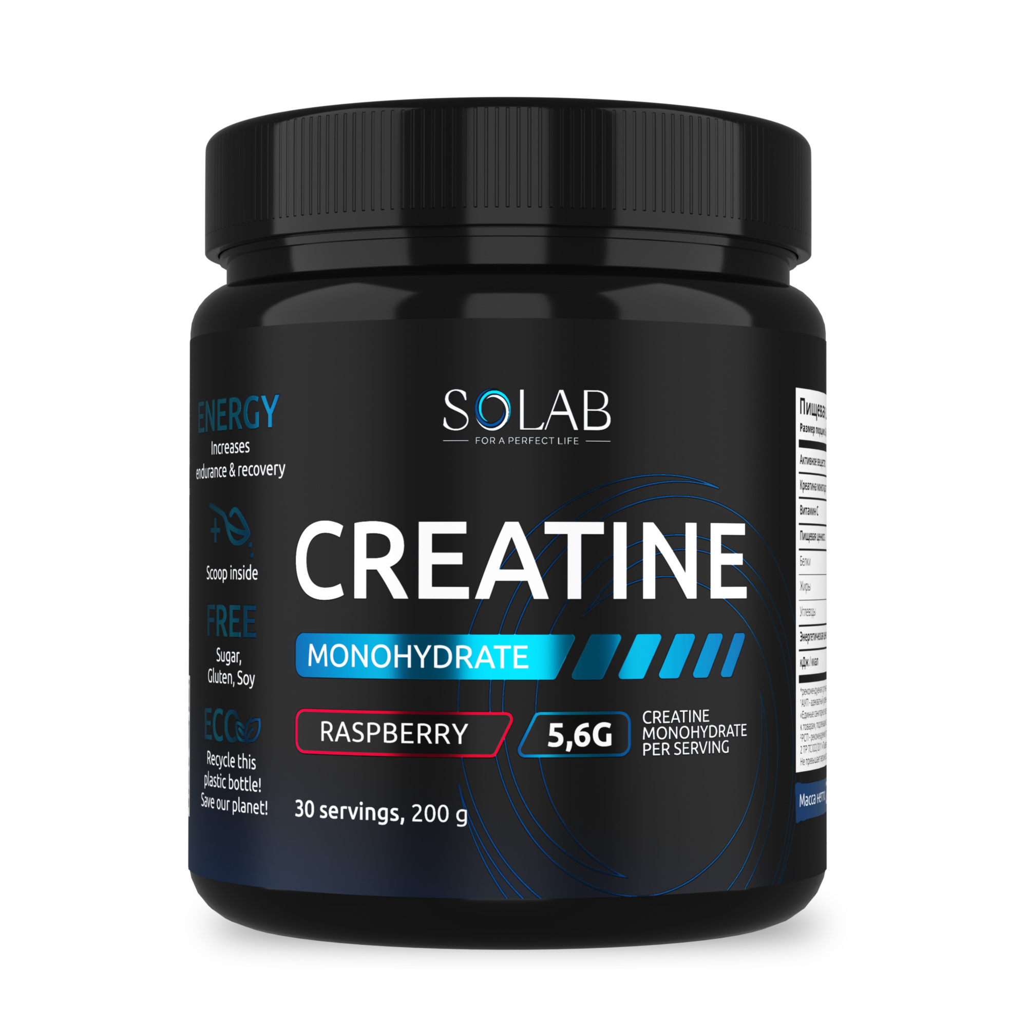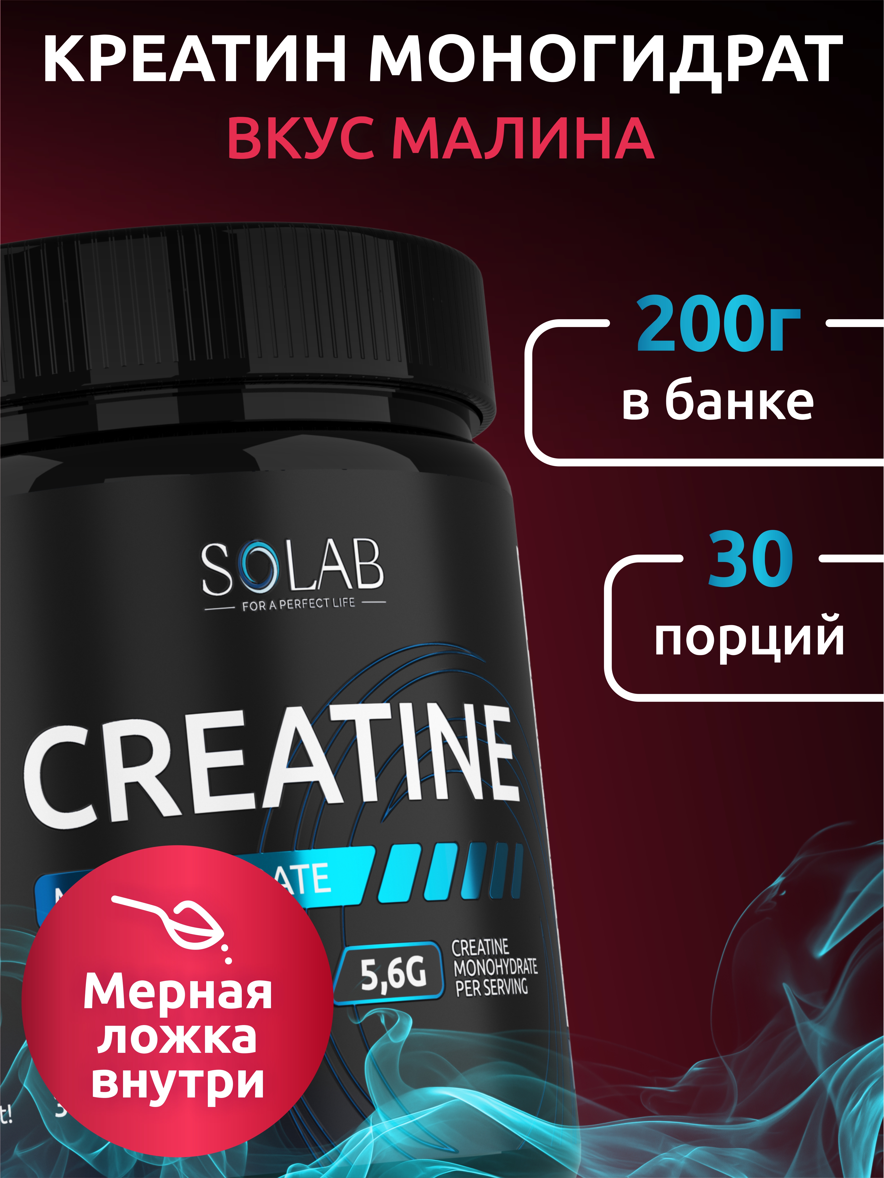 SOLAB / Креатин моногидрат, Creatine Monohydrate, Вкус Малина, Банка 200 гр. 30 порций.