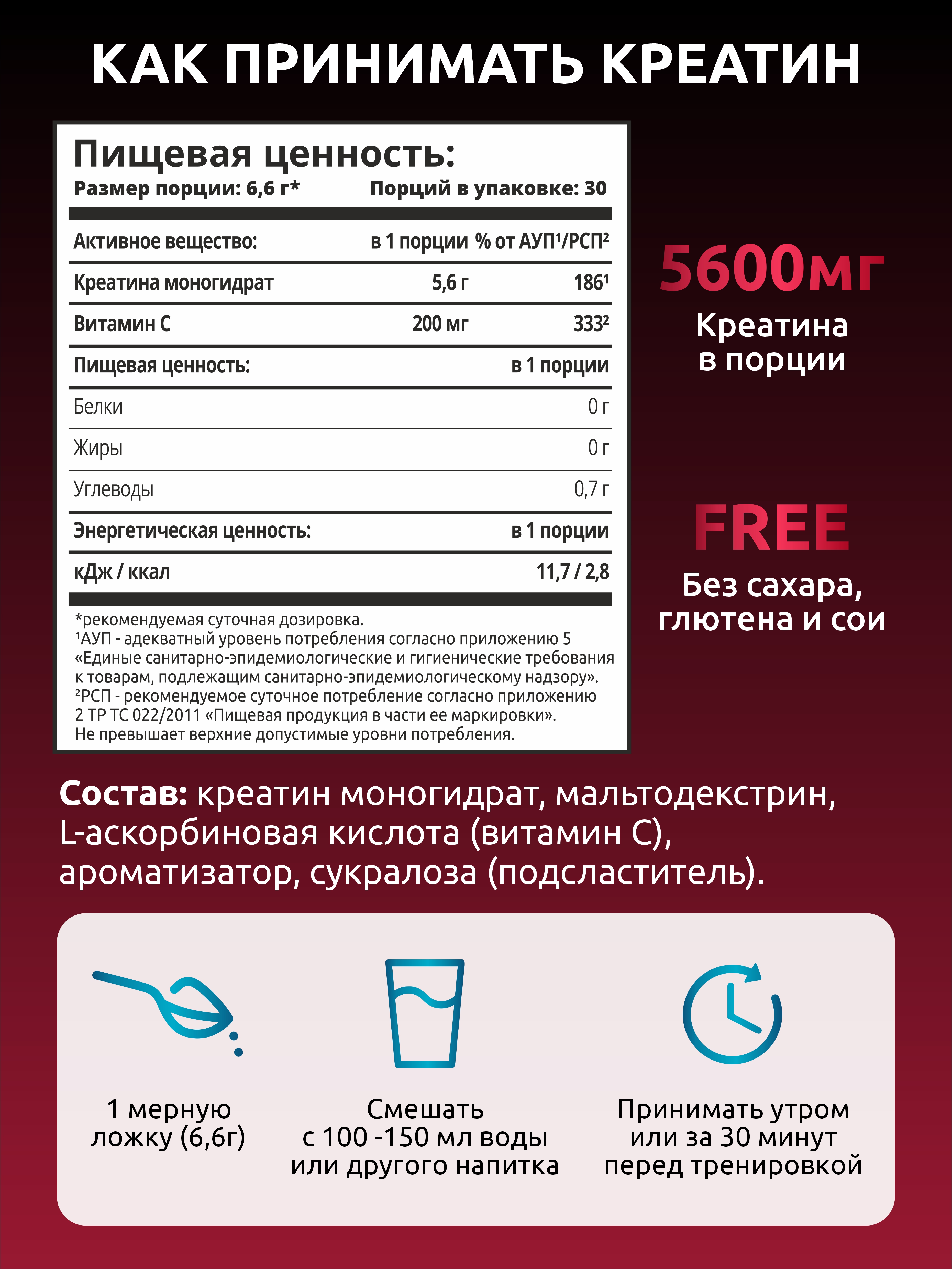 Добавка имеет приятный вкус малины. Содержит только качественные ингредиенты, в составе нет глютена, сахара, сои. В одной порции 5,6 гр креатина. Изготовлено на предприятии, поддерживающем международные стандарты качества.