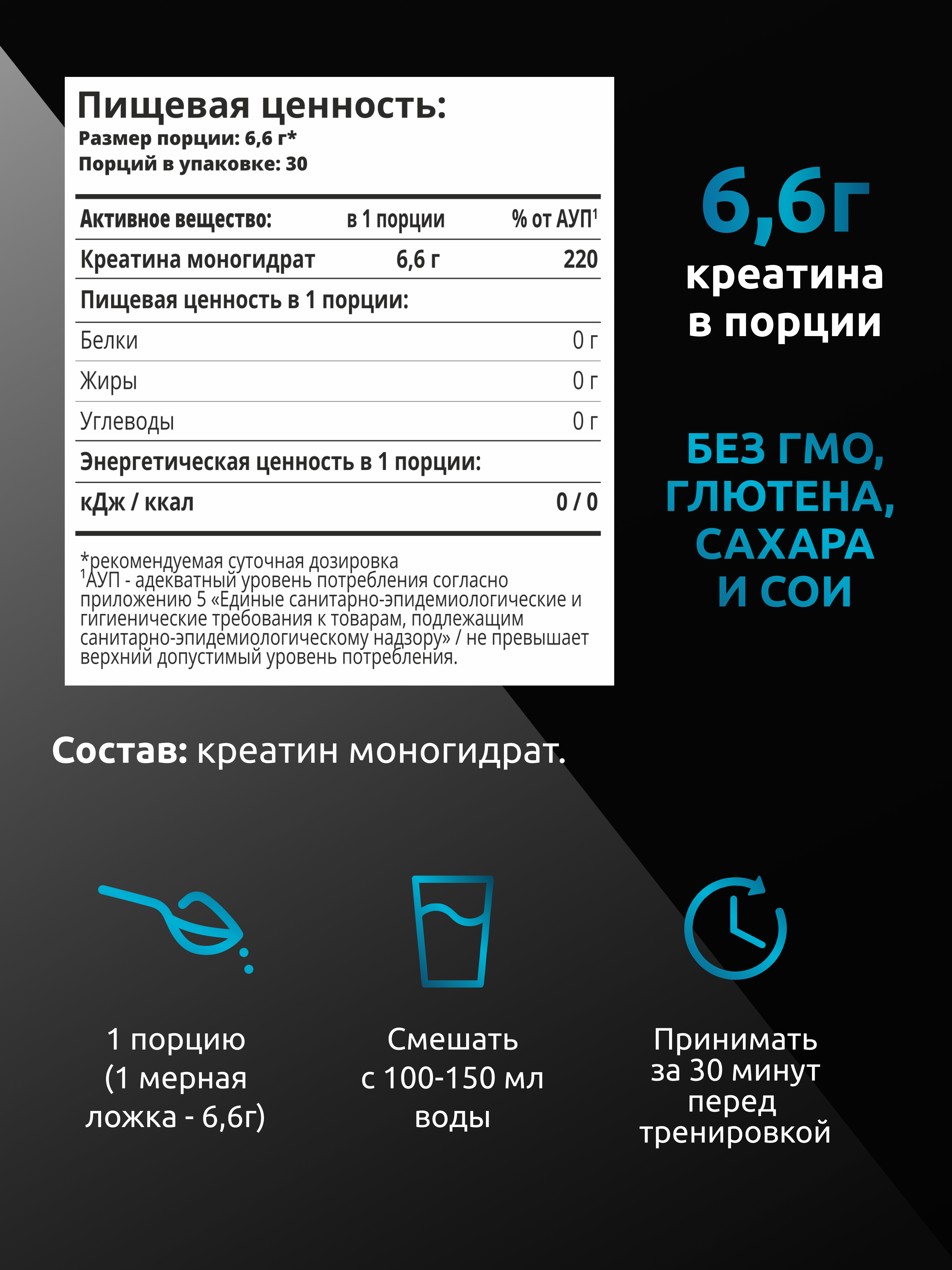 БАД содержит наиболее биодоступную форму креатина - моногидрат, которая быстро усваивается организма. Продукт без глютена, сахара, сои. Изготовлено на предприятии, поддерживающем международные стандарты качества.