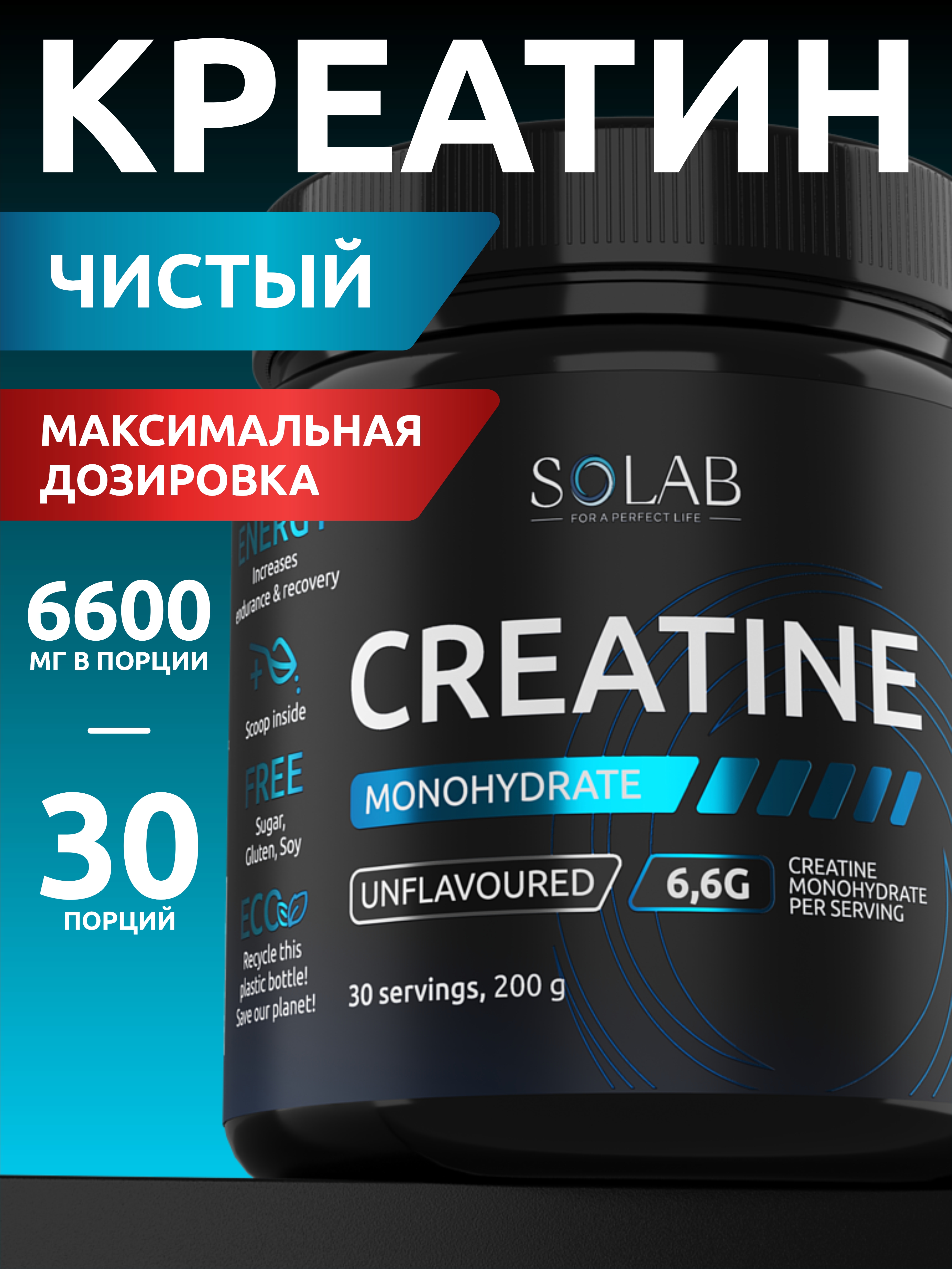 SOLAB / Креатин моногидрат, Creatine Monohydrate, Вкус Нейтральный, Банка 200 гр. 30 порций.