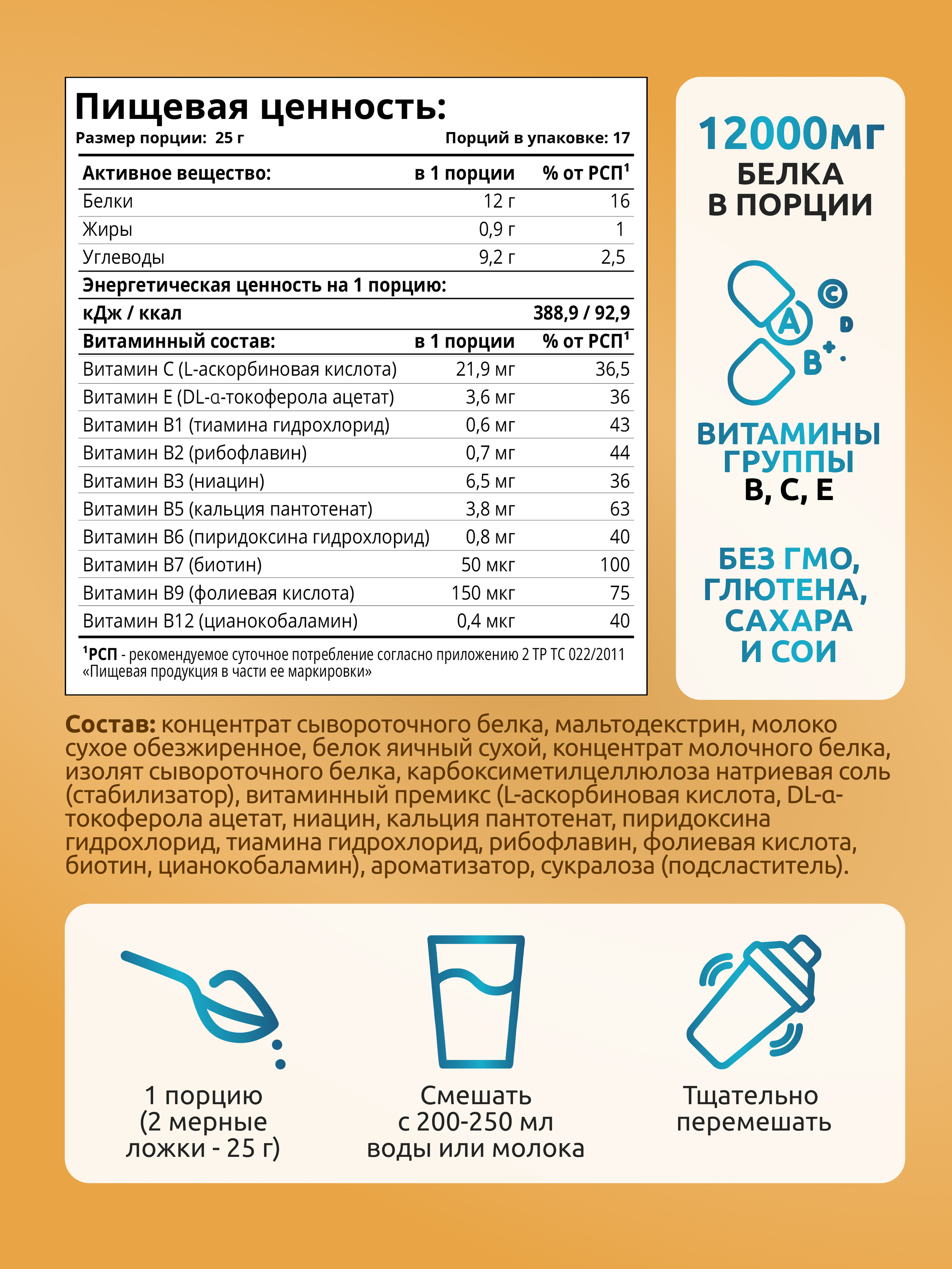 Одна упаковка (425 гр) содержит 17 порций. Рекомендуется смешать 2 мерные ложки порошка с 200 мл воды и тщательно перемешать. Возможно выпадение осадка, который необходимо встряхнуть перед употреблением. Принимать в дни тренировок 1 порцию за час до физических нагрузок и вторую порцию в течение часа после тренировки. В дни отдыха принимать в качестве перекуса 2 раза в день между приемами пищи.
